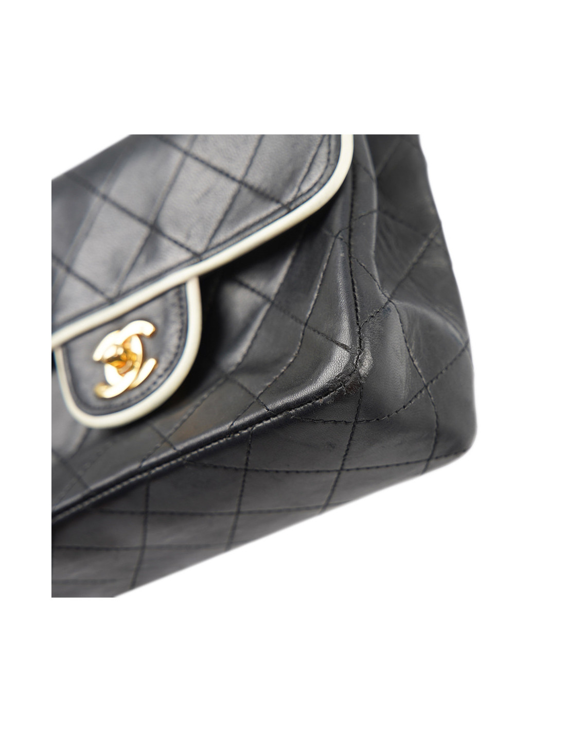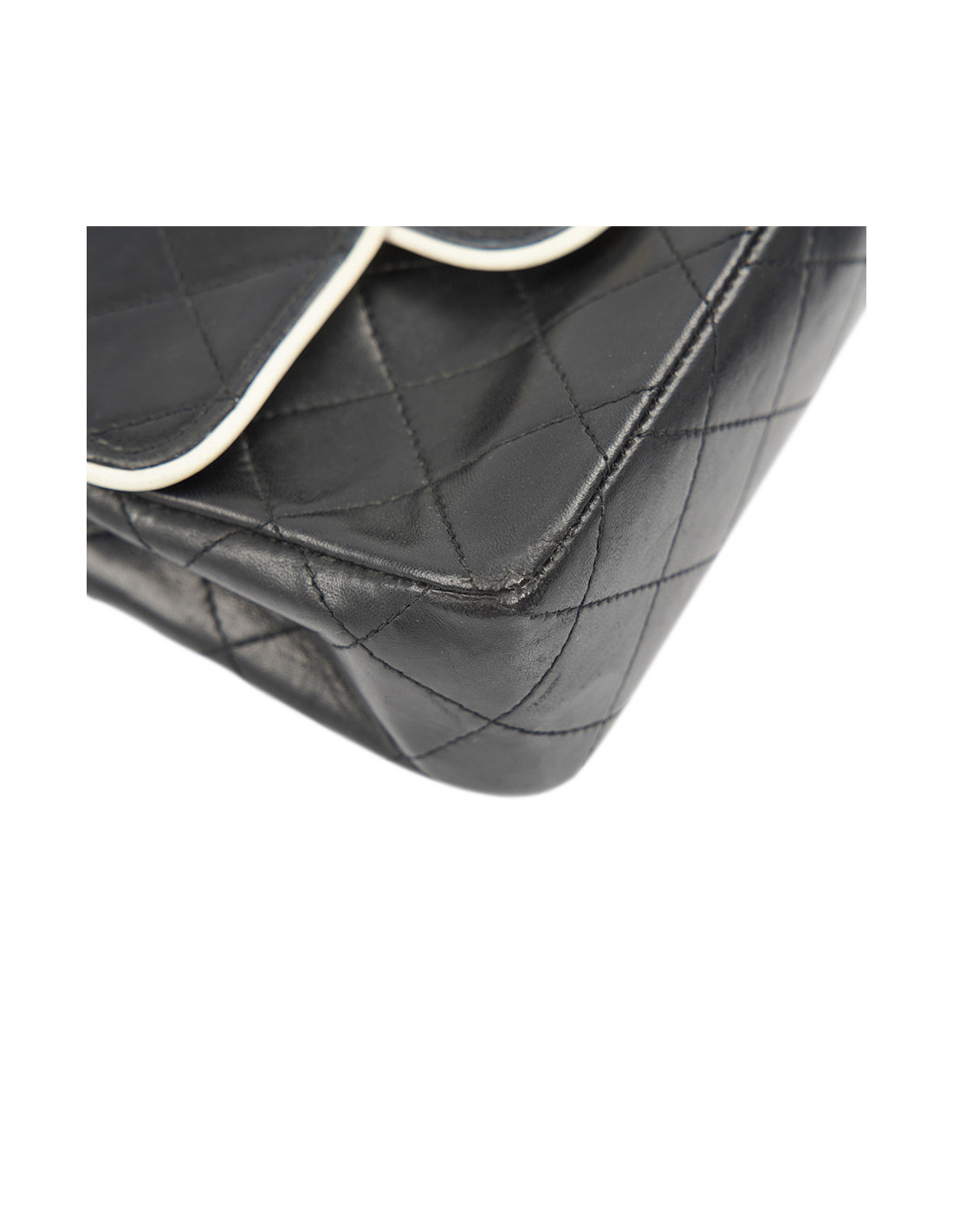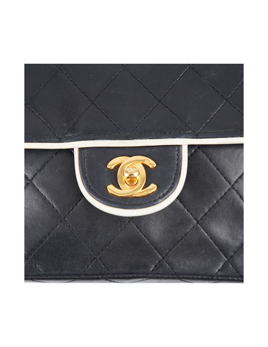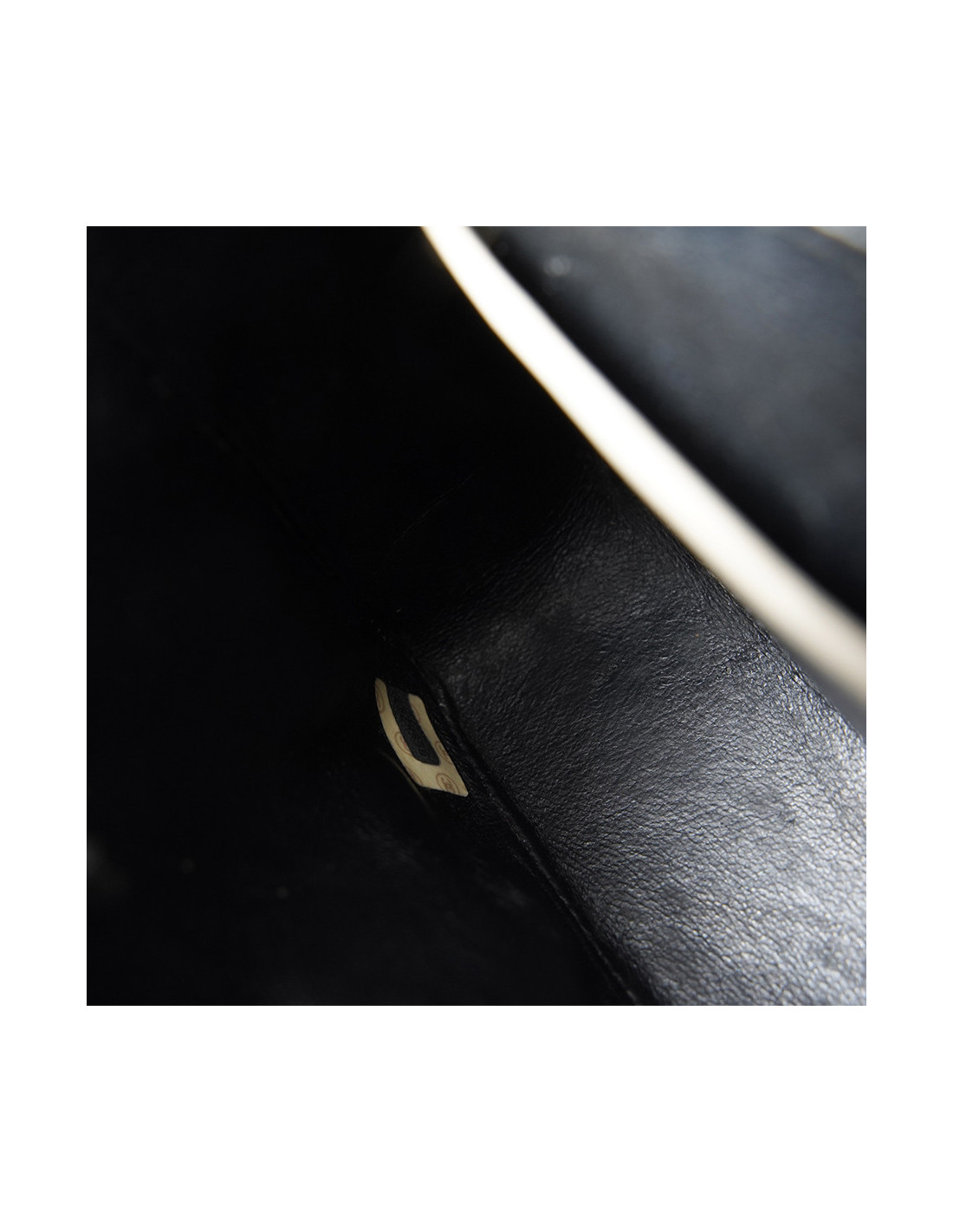 Détails : sac gansé de blanc, rabat simple, une poche plaquée à l'arrière du sac.
