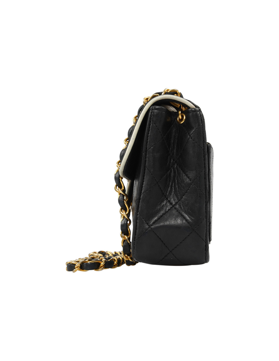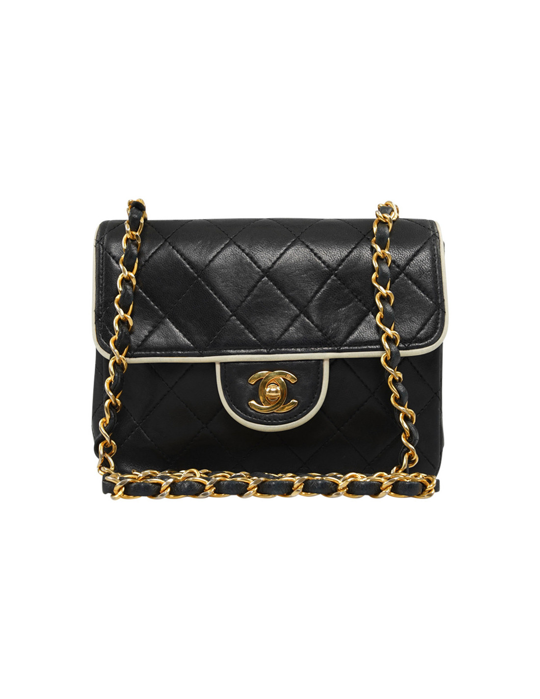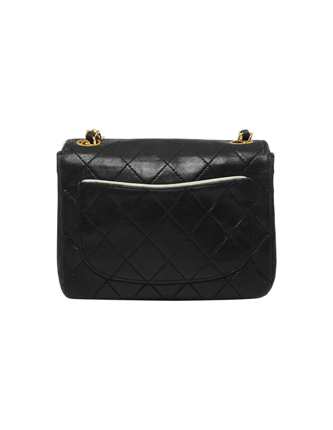Détails : sac gansé de blanc, rabat simple, une poche plaquée à l'arrière du sac.