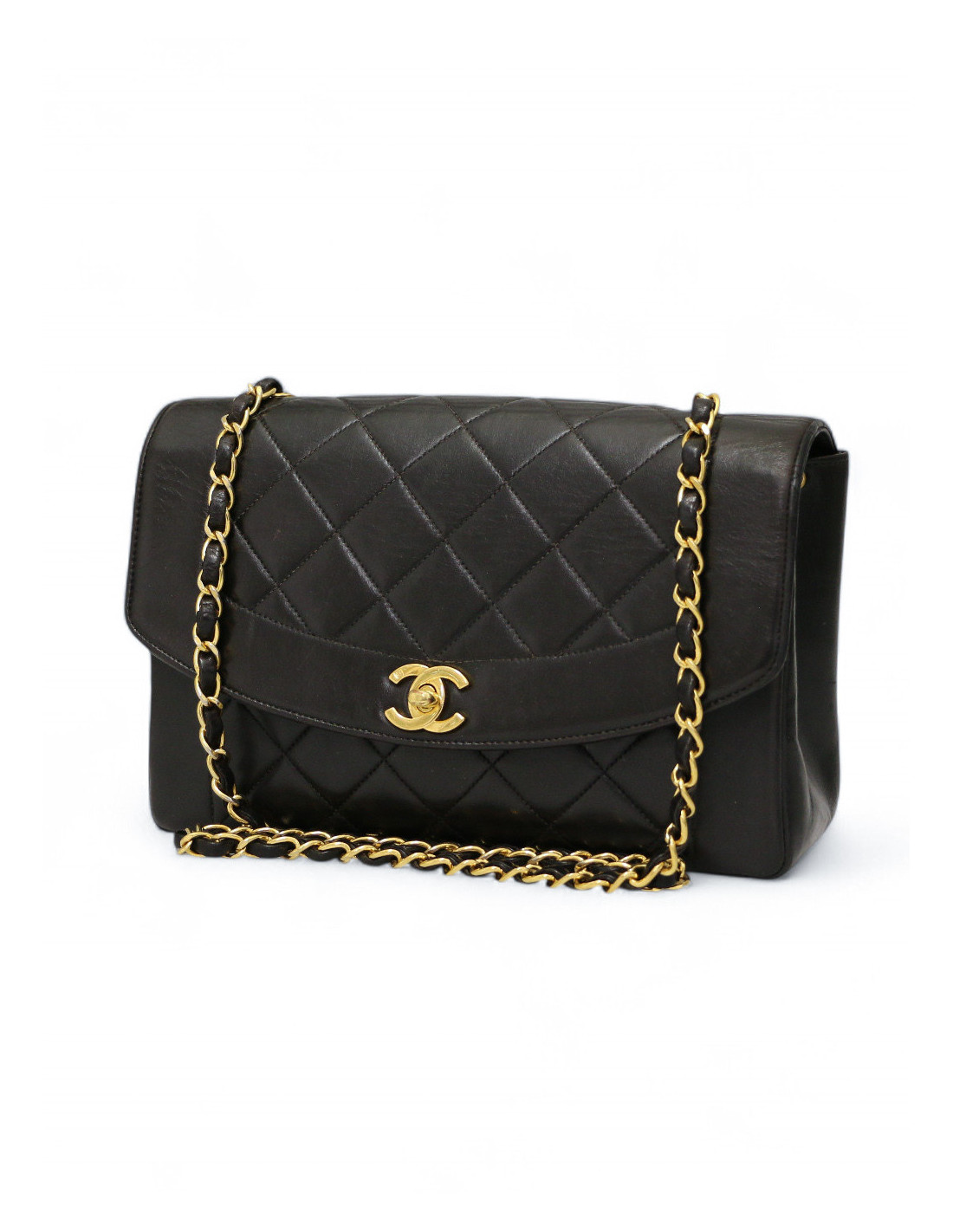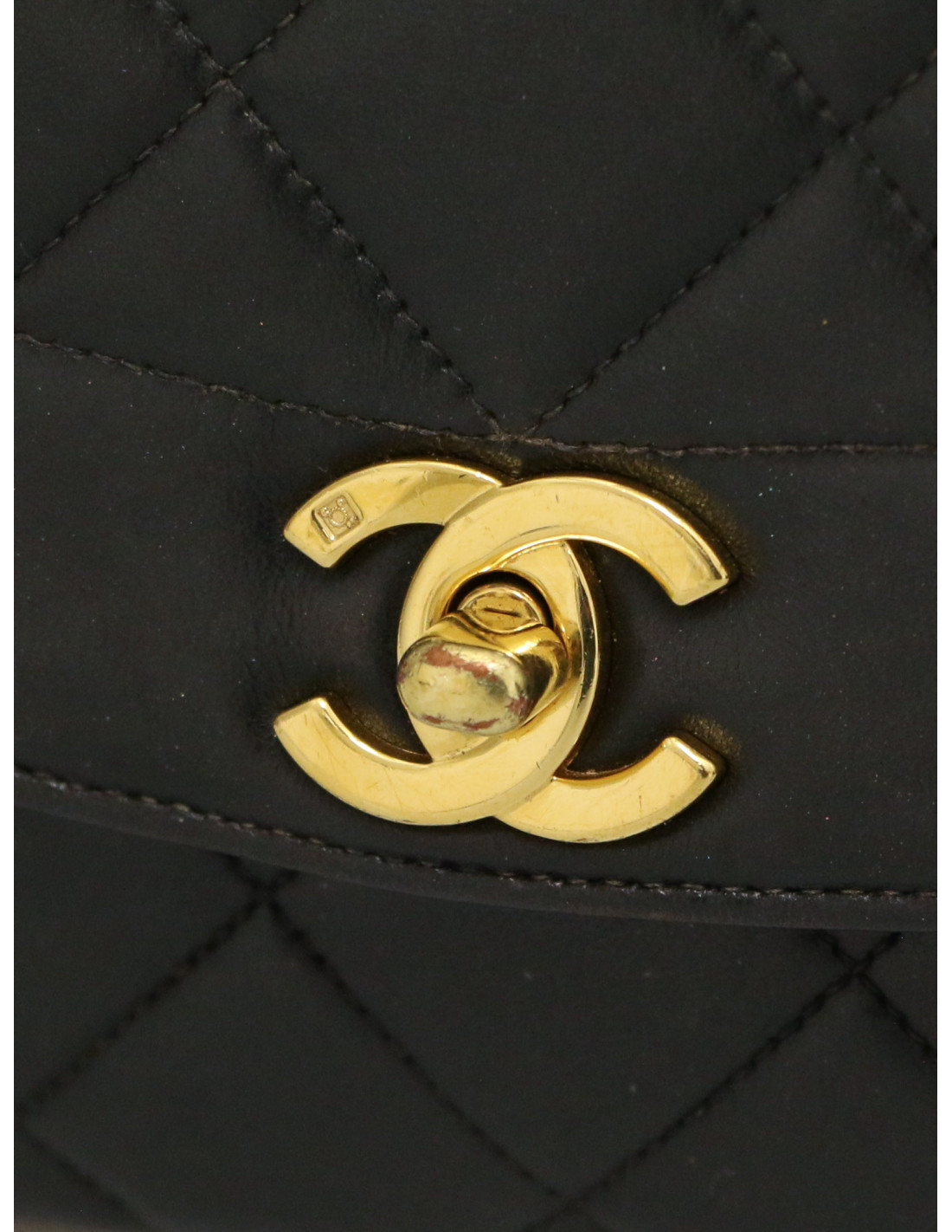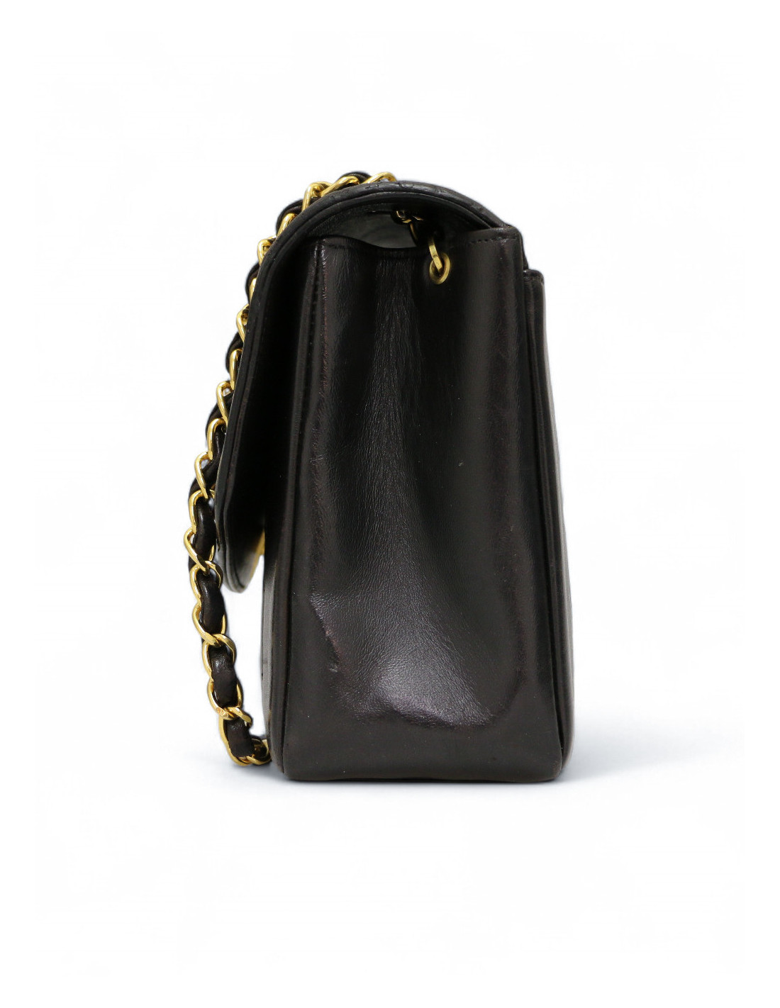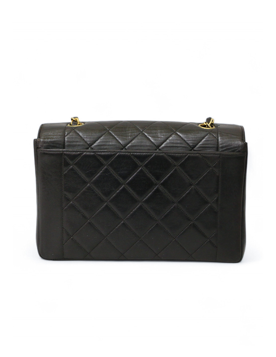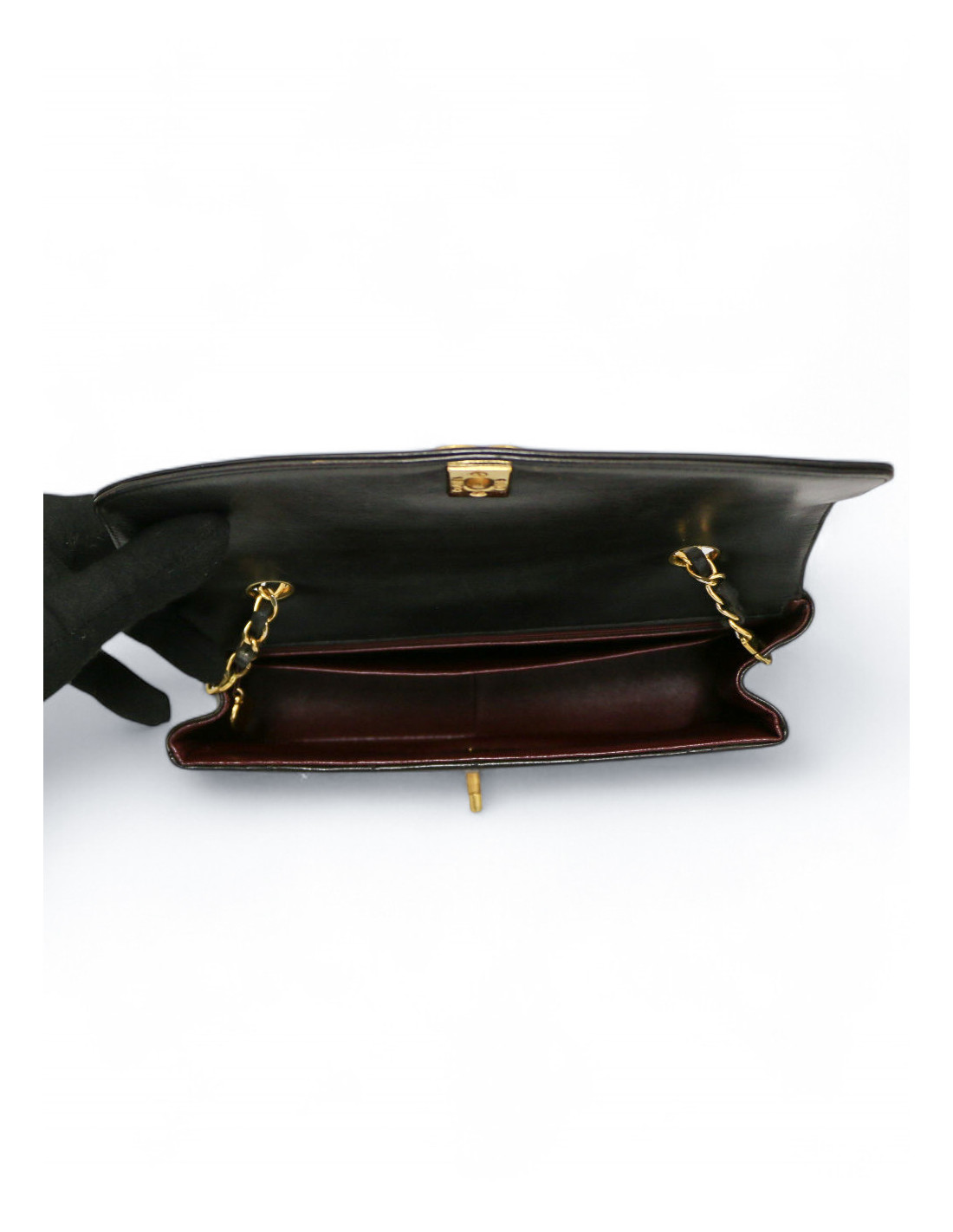 Détails : sac vintage à rabat unique orné d'une bijouterie en or 24 carats. Les coins sont en très bon état alors que le bord du rabat présente une légère usure. A l'arrière du sac une poche discrète, sous le rabat un unique espace de rangement avec deux poches plaquées dont une zippée.