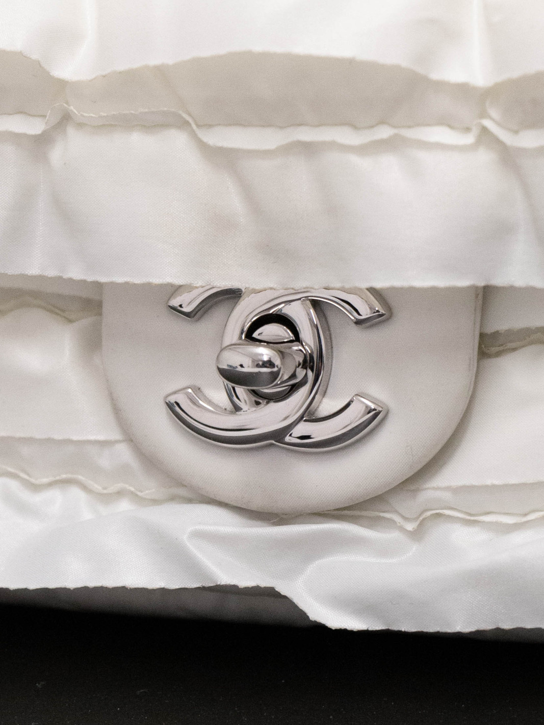 Issu de la Collection Neige, ce sac Chanel est une revisite d'une sac Classique et se distingue par son design singulier et innovant. Réalisé en toile parachute blanche, il séduit par son matelassage effet doudoune et ses volants superposés qui lui apportent du volume et du caractère. Sa silhouette souple et généreuse lui confère une allure à la fois moderne et intemporelle, idéale pour compléter de nombreuses tenues.