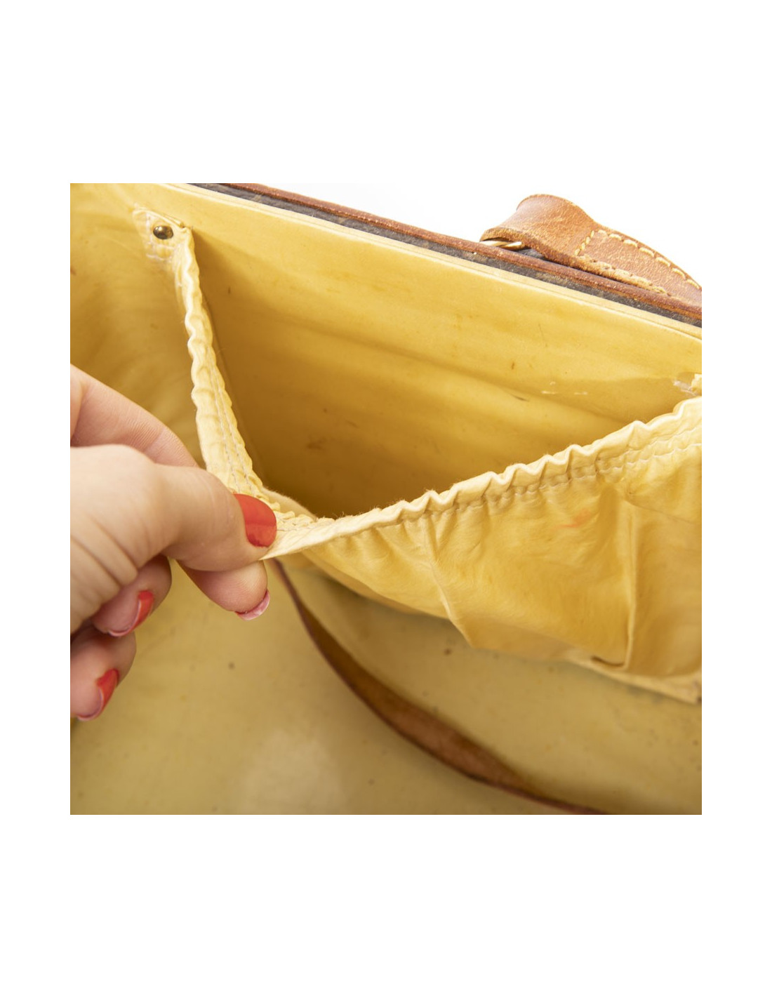 Les dimensions sont Longueur 32 cm , Hauteur 22 cm et Profondeur 21 cm. Etat d'usage : (bijouterie avec micro rayures, marques sur le cuir et traces sur la doublure intérieure).