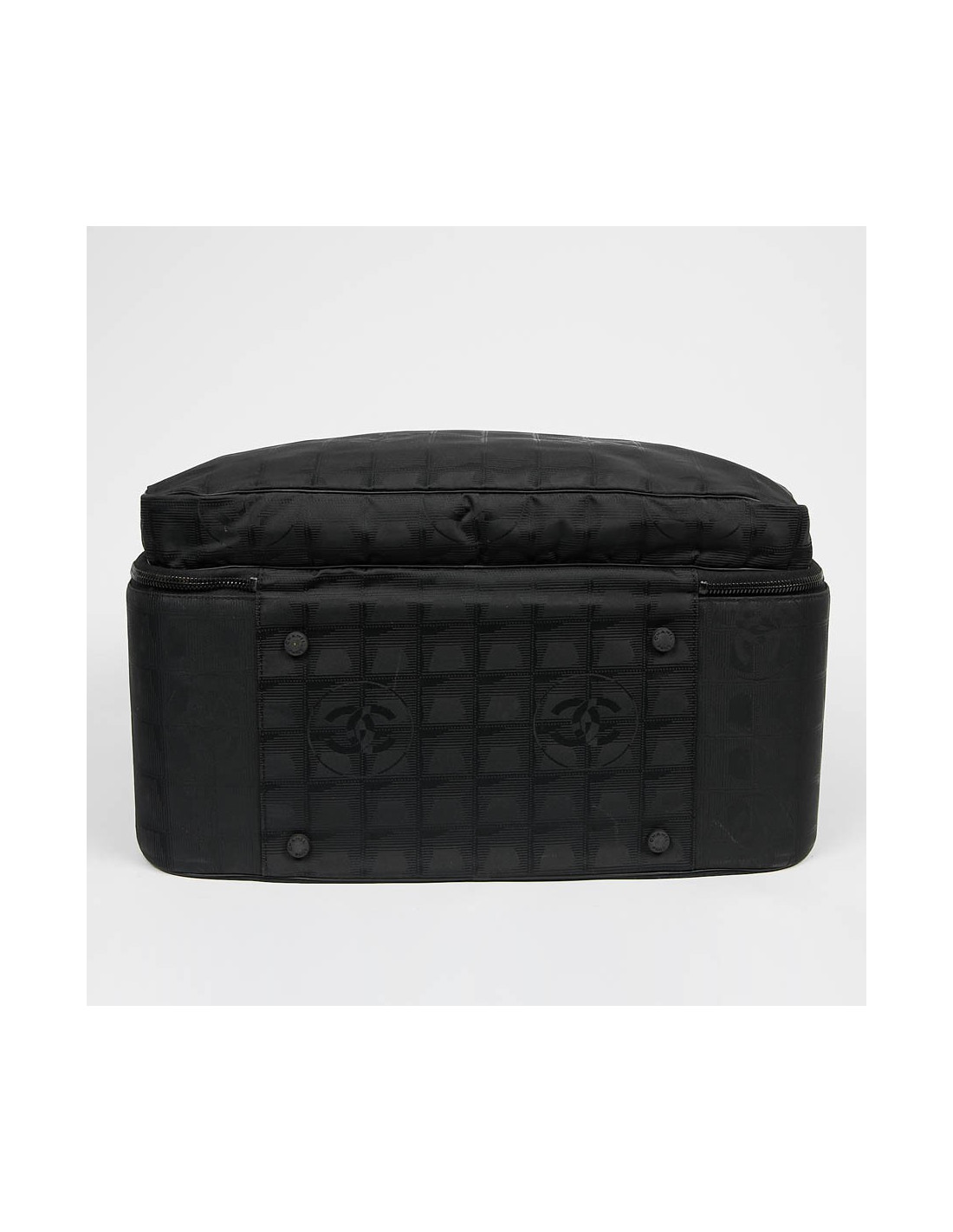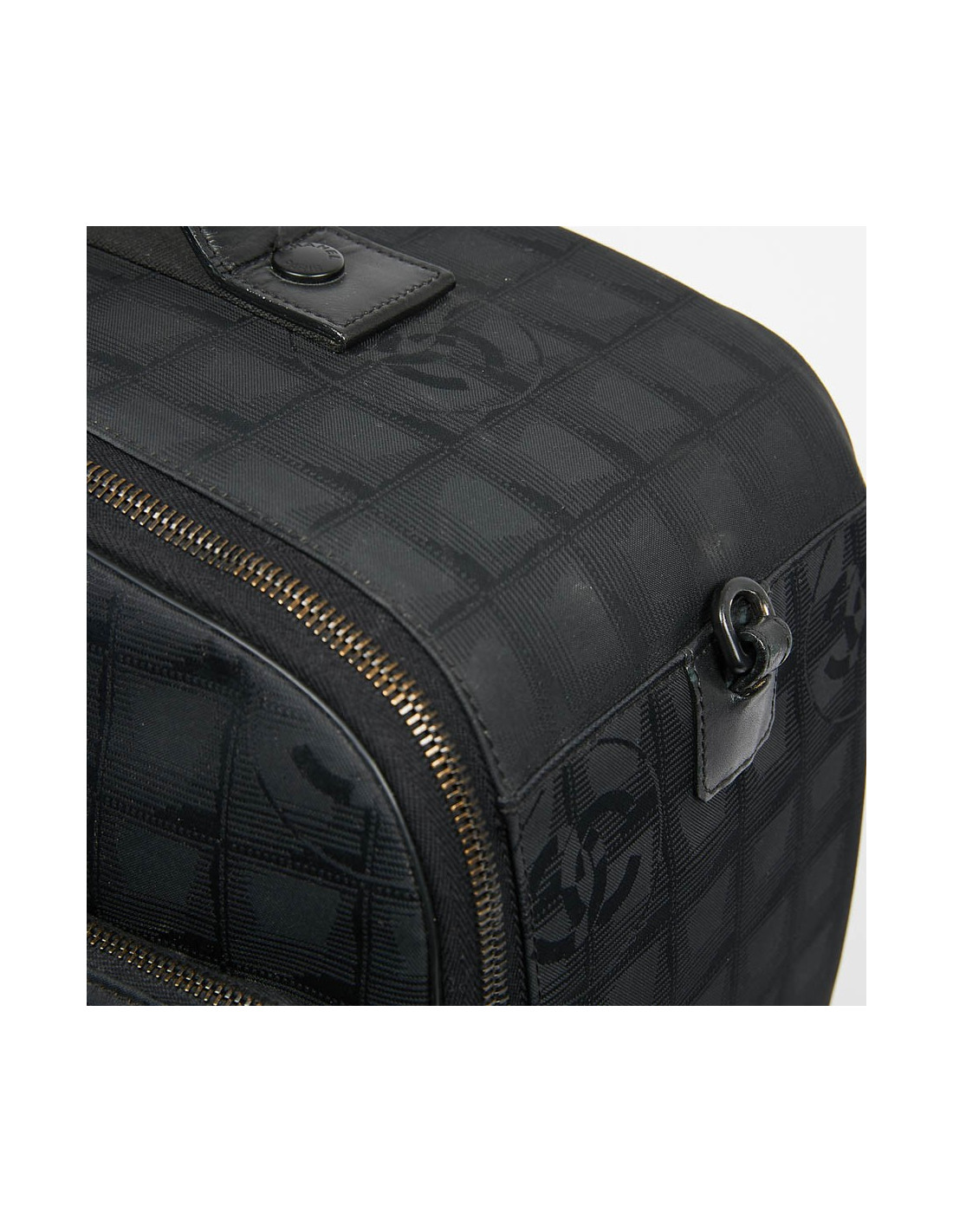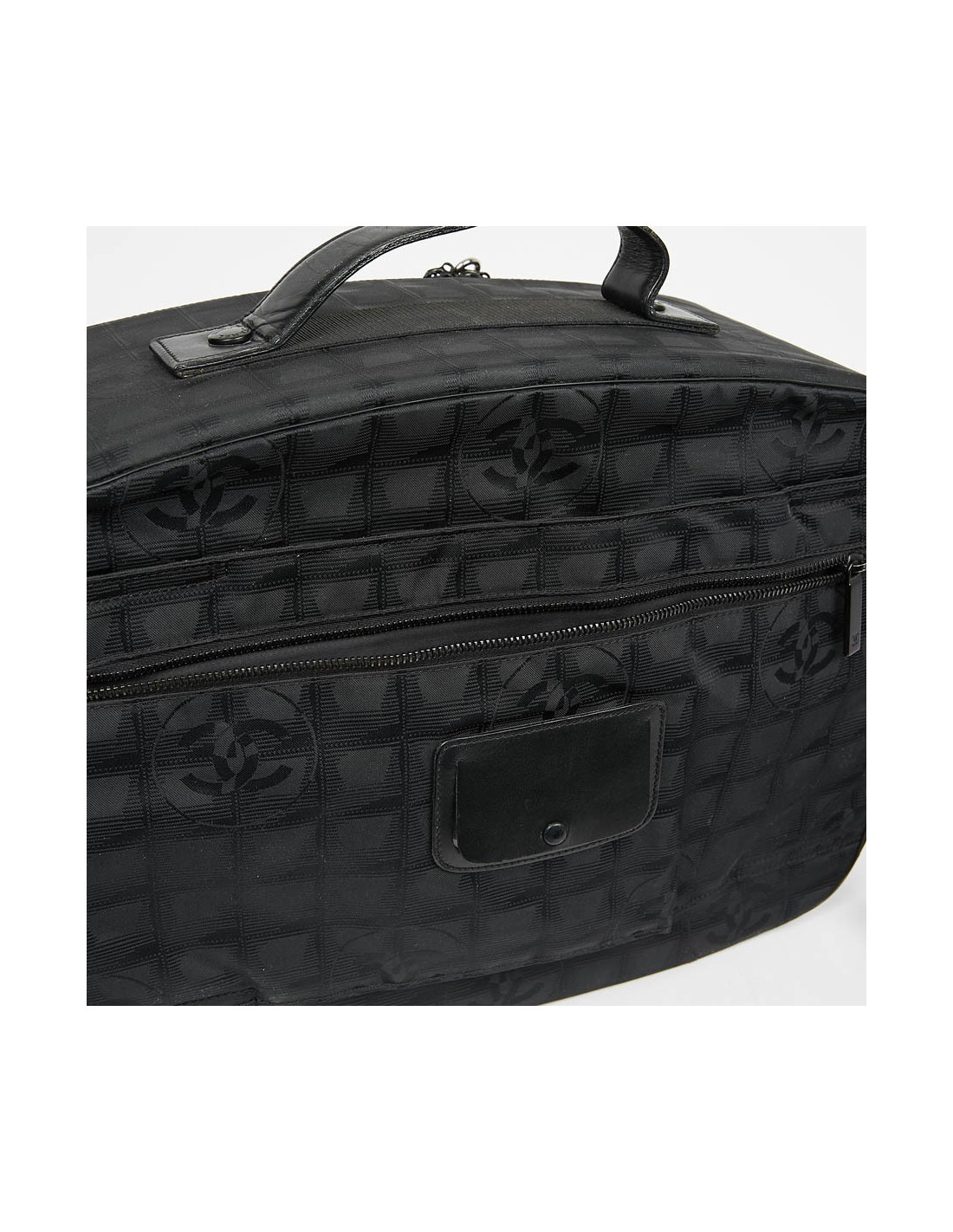 Ce vanity case CHANEL ou mini valise "cabine 24 H" de weekend, est en toile de coton noire monogramme, doublé en nylon. Il a une double fermeture éclair, une grande poche zippée de chaque côté du rabat. Il a une poignée en cuir pour un portage main ou épaule avec sa bandoulière amovible. A l'arrière du sac une poche zippée ainsi qu'un passant qui permet de l'adapter sur une valise cabine avec son porte étiquette intégré. C'est un bagage aussi léger qu'élégant.