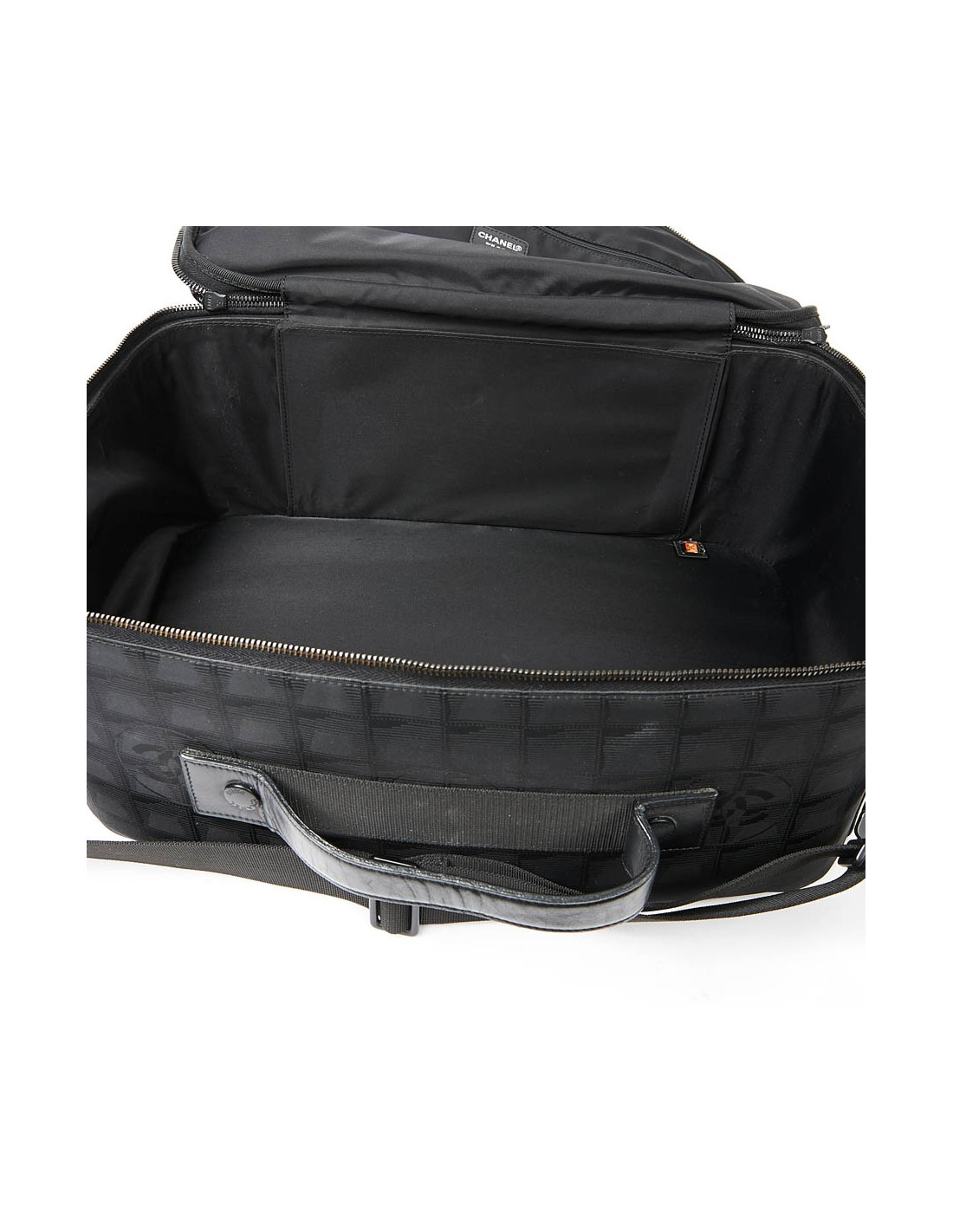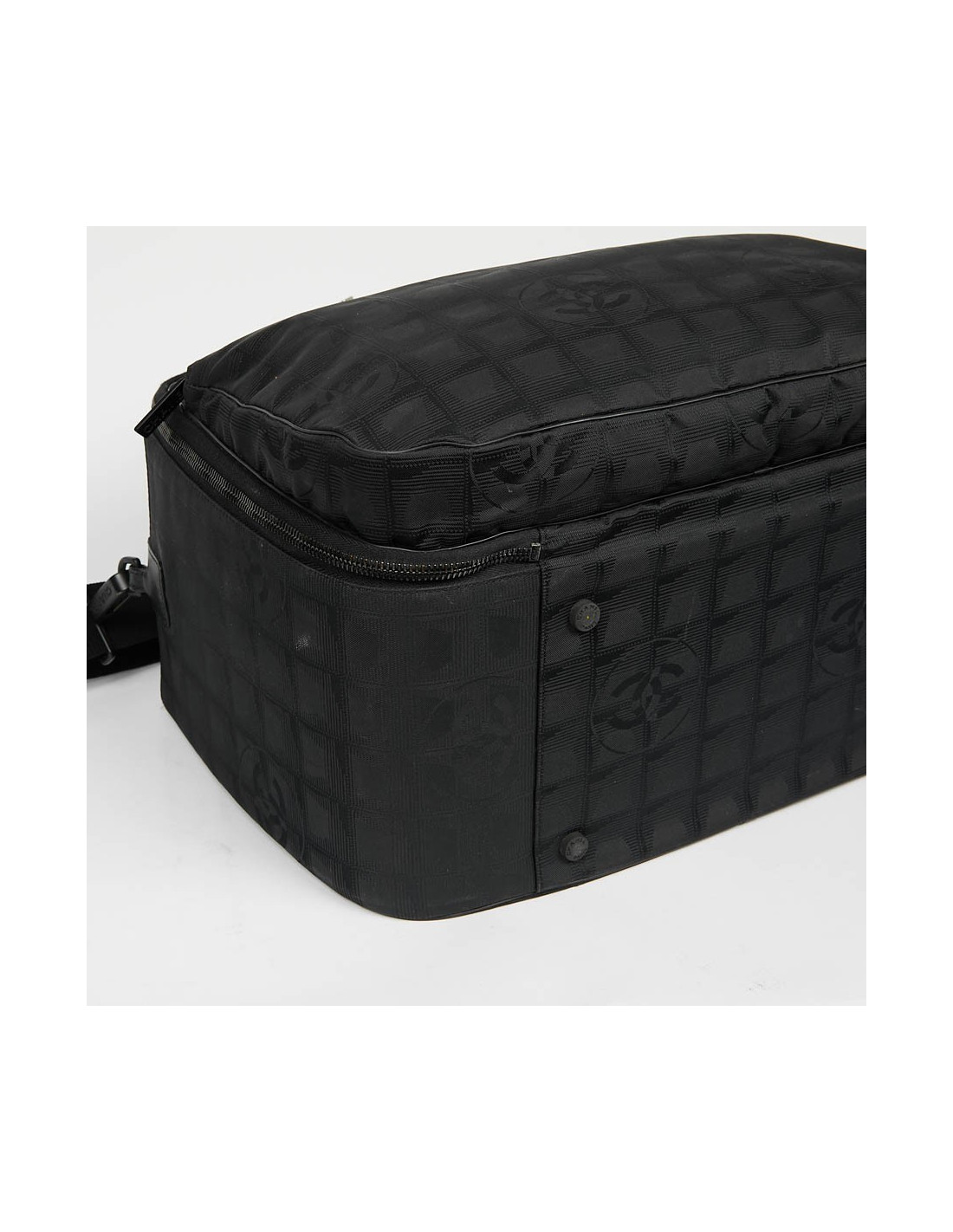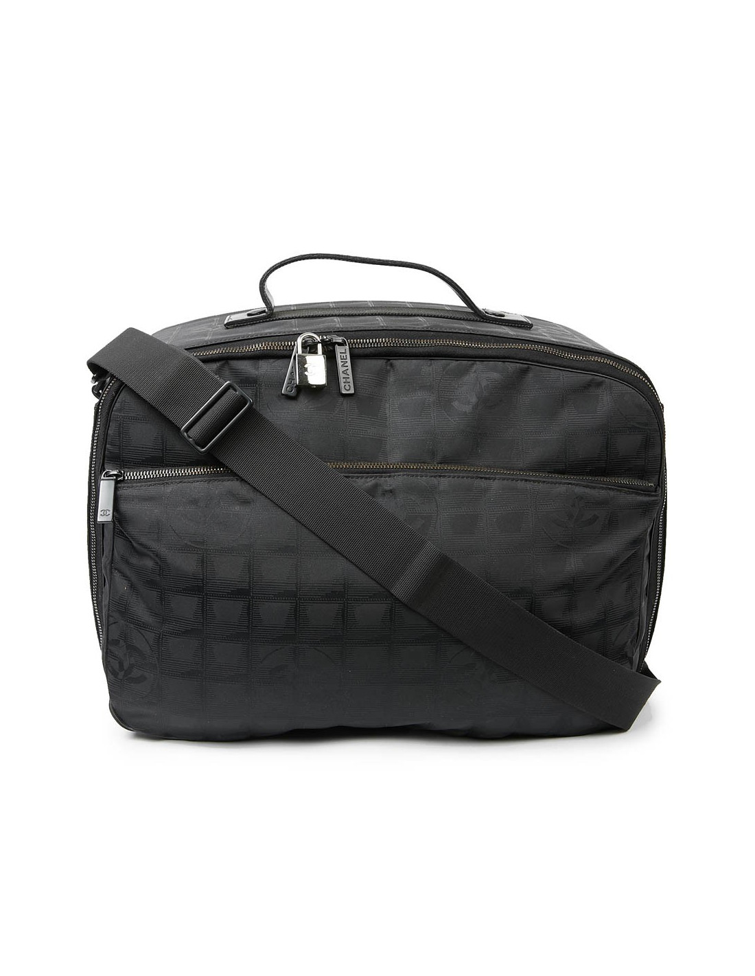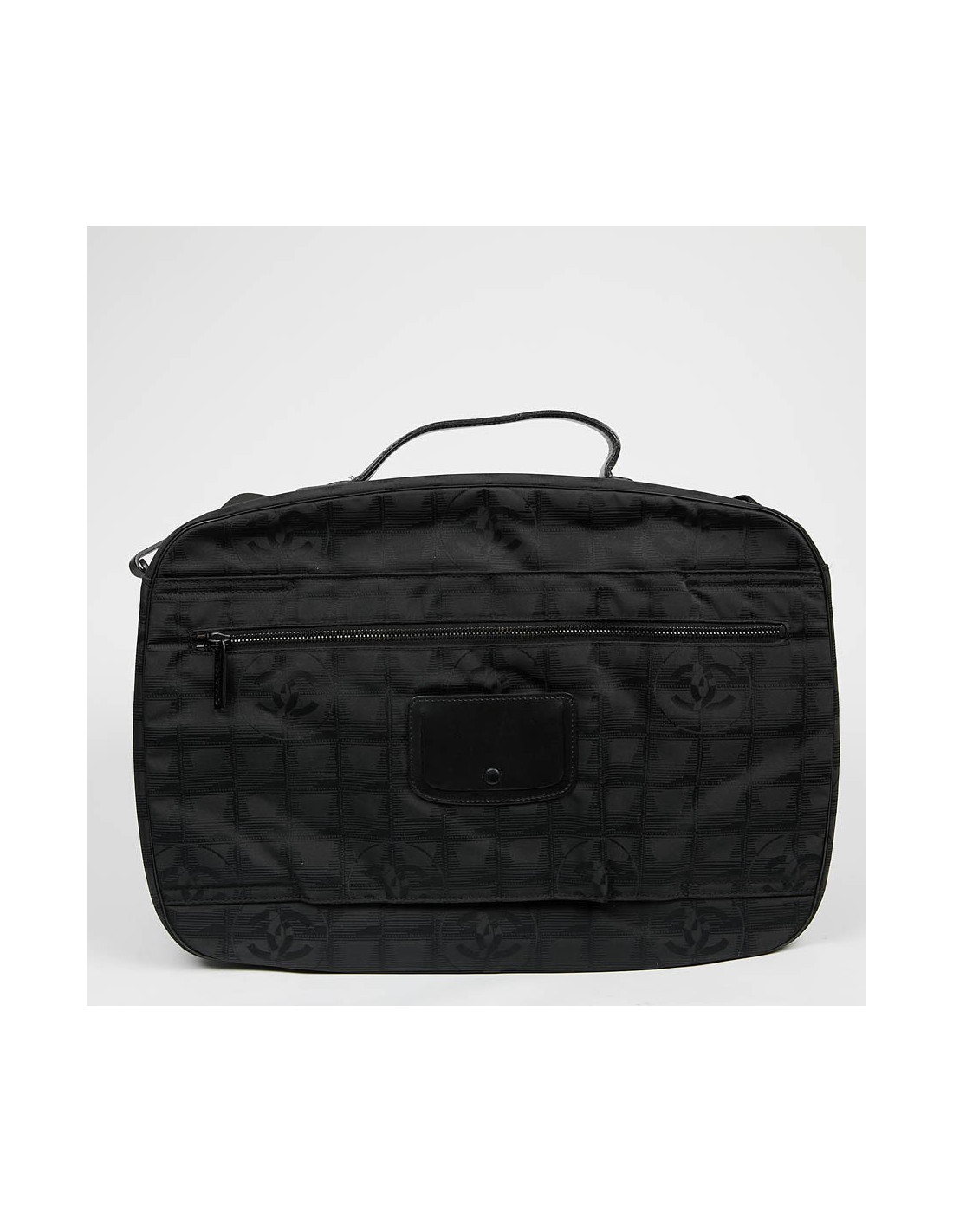 Ce vanity case CHANEL ou mini valise "cabine 24 H" de weekend, est en toile de coton noire monogramme, doublé en nylon. Il a une double fermeture éclair, une grande poche zippée de chaque côté du rabat. Il a une poignée en cuir pour un portage main ou épaule avec sa bandoulière amovible. A l'arrière du sac une poche zippée ainsi qu'un passant qui permet de l'adapter sur une valise cabine avec son porte étiquette intégré. C'est un bagage aussi léger qu'élégant.