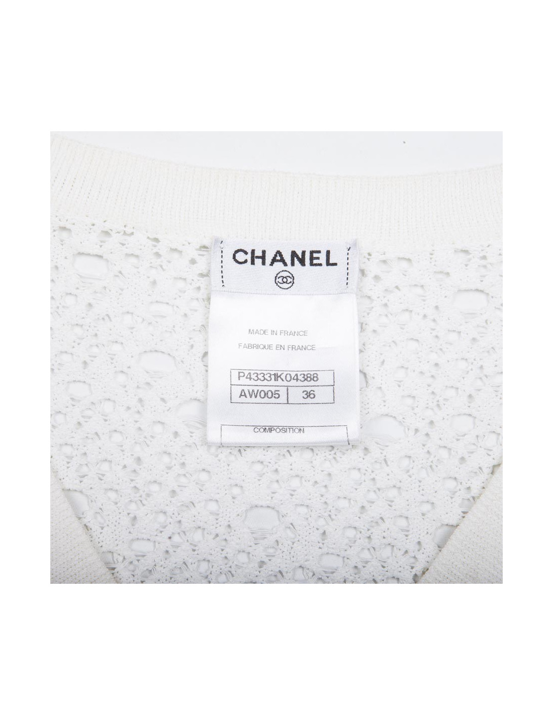 Cardigan CHANEL taille 36 FR, maille façon dentelle en coton et polyamide blanc. Il se ferme par 4 boutons métallisés siglés "CC". Il a 4 poches à l'avant.