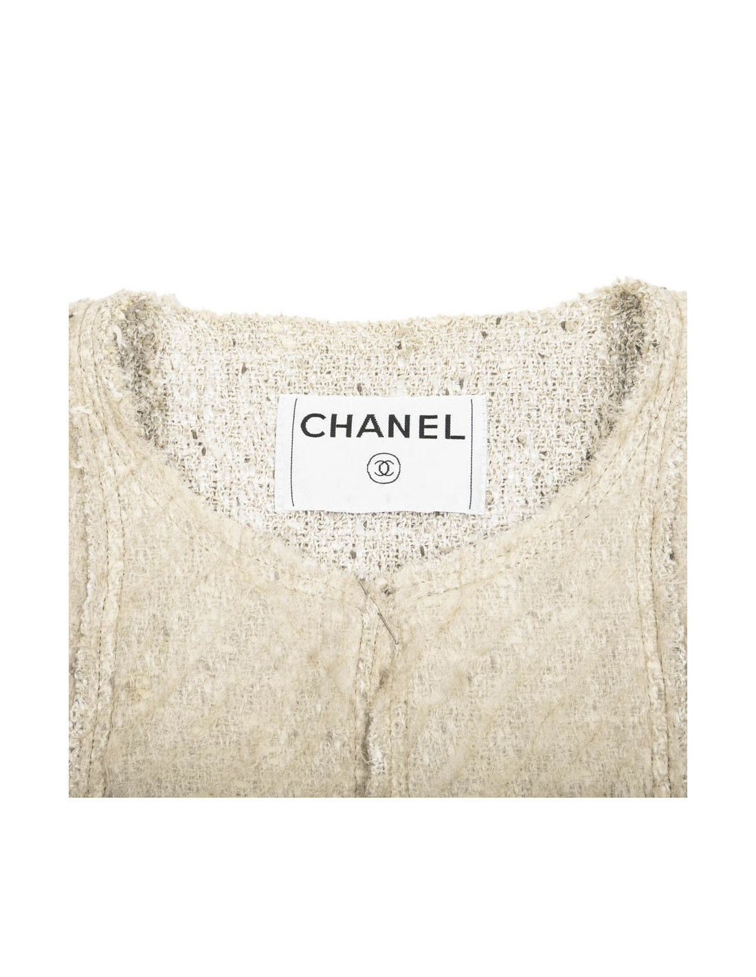 La veste en tweed beige est doublée d'organza à l'extérieur et composée de deux poches avant fermées par des boutons en forme de perle siglés CC. Les mêmes boutons ornent par trois les manches de la veste. Absence d'étiquette de taille et de matière.