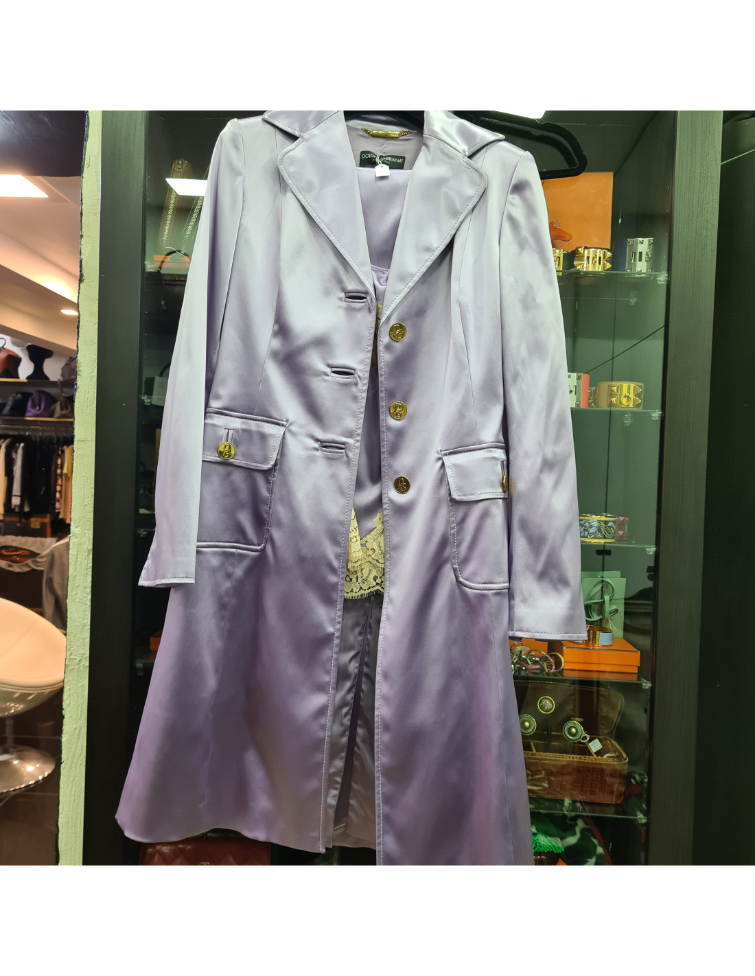 Ensemble de soie pantalon, veste et caraco Dolce et Gabbana taille 38 fr. Les trois pièces sont entièrement en soie mauve, agréables au toucher. La veste, cintrée type trench est composée de trois boutons dorés siglés DG et deux poches aux boutons dorés, siglés de la même façon. Le Pantalon, taille haute, coupe droite, à revers de 5cm, est composé de deux poches latérales et zippé de côté.