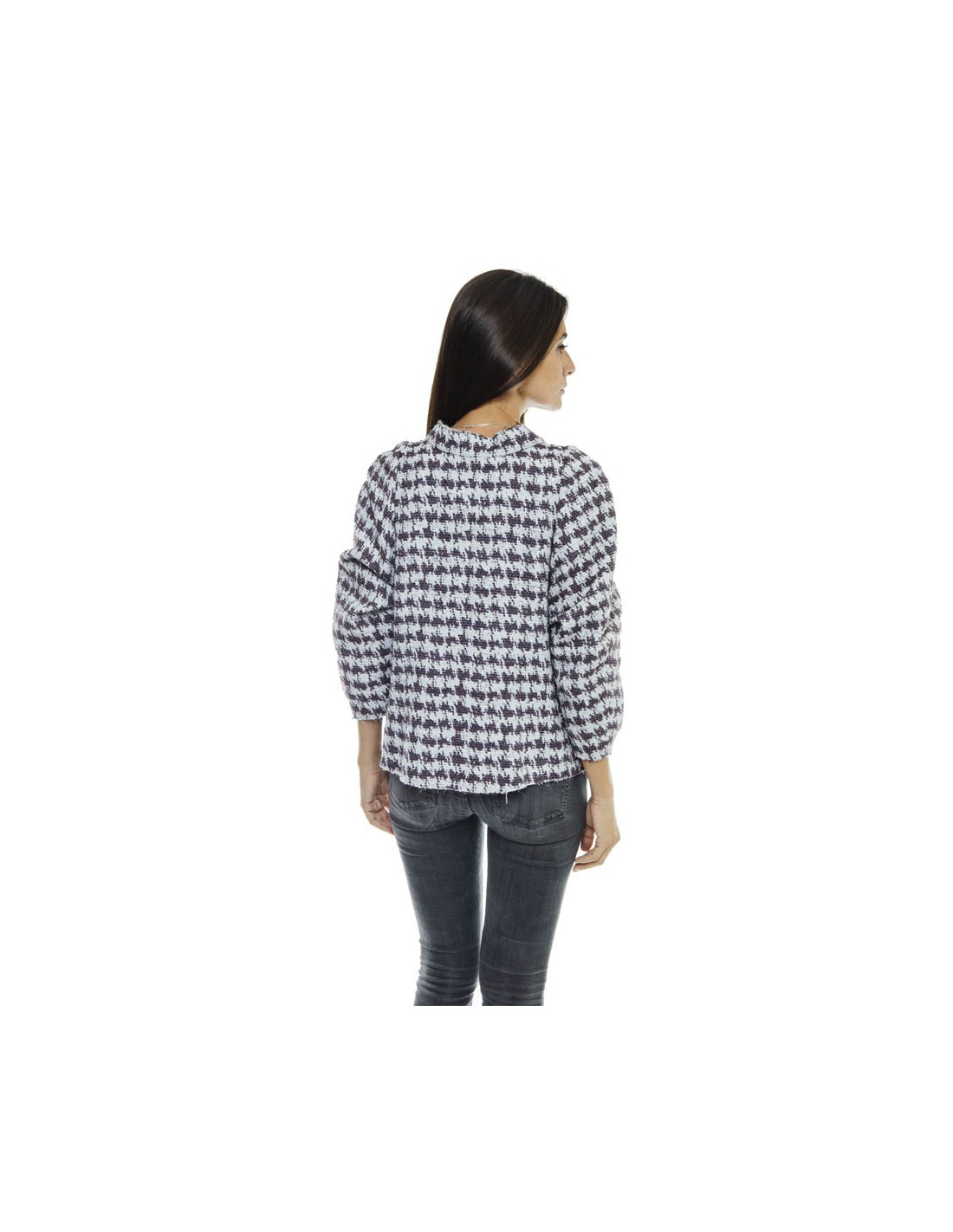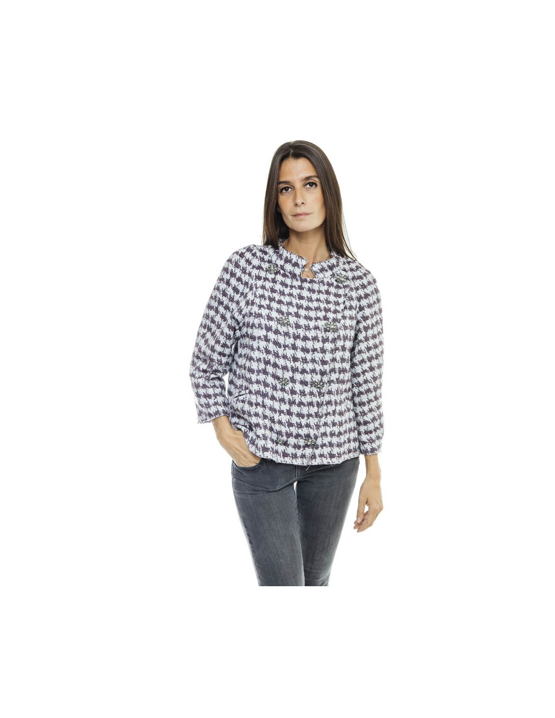 Veste Chanel t 40 croisée, magnifiquement doublée de soie imprimée d'étoiles bleu, rose, gris. Les manches sont trois quart raglan. Il y a deux poches en biais. Boutons en cristal et métal argent vieilli.