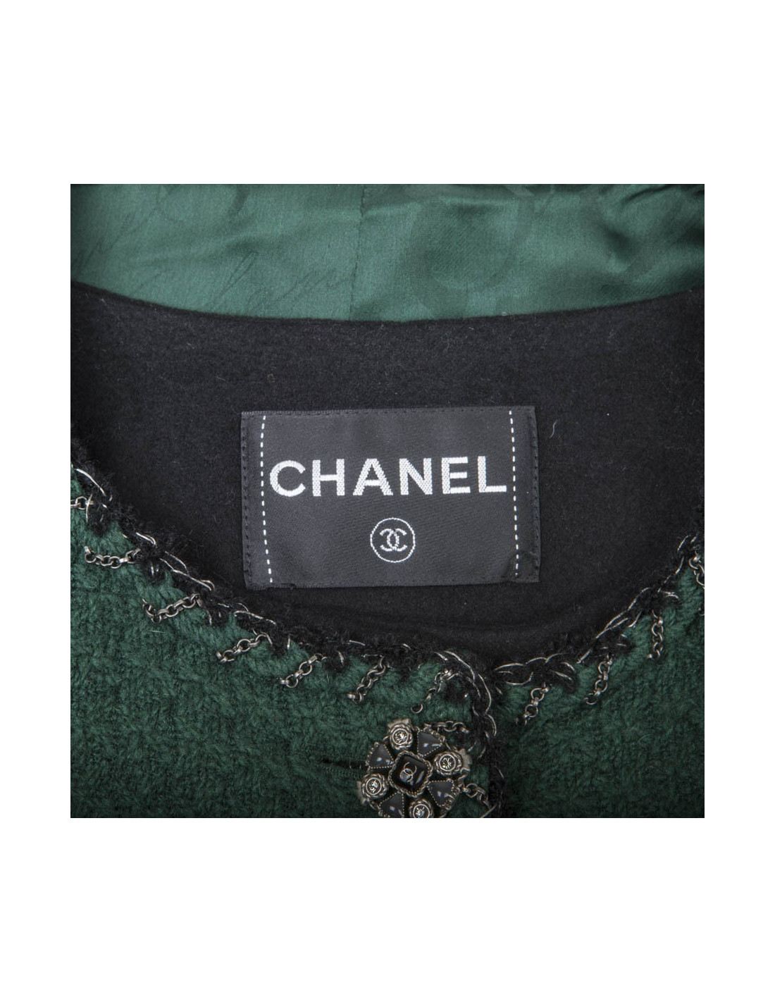 Double veste Chanel en tweed vert anglais, gansé d'un liseret de fils noirs et argent et une fine chaine en métal ruthénium, deux poches sur les cotés , se ferme avec des boutons en argent émaillés et siglés CC. Elle est doublée de soie verte siglée Chanel.