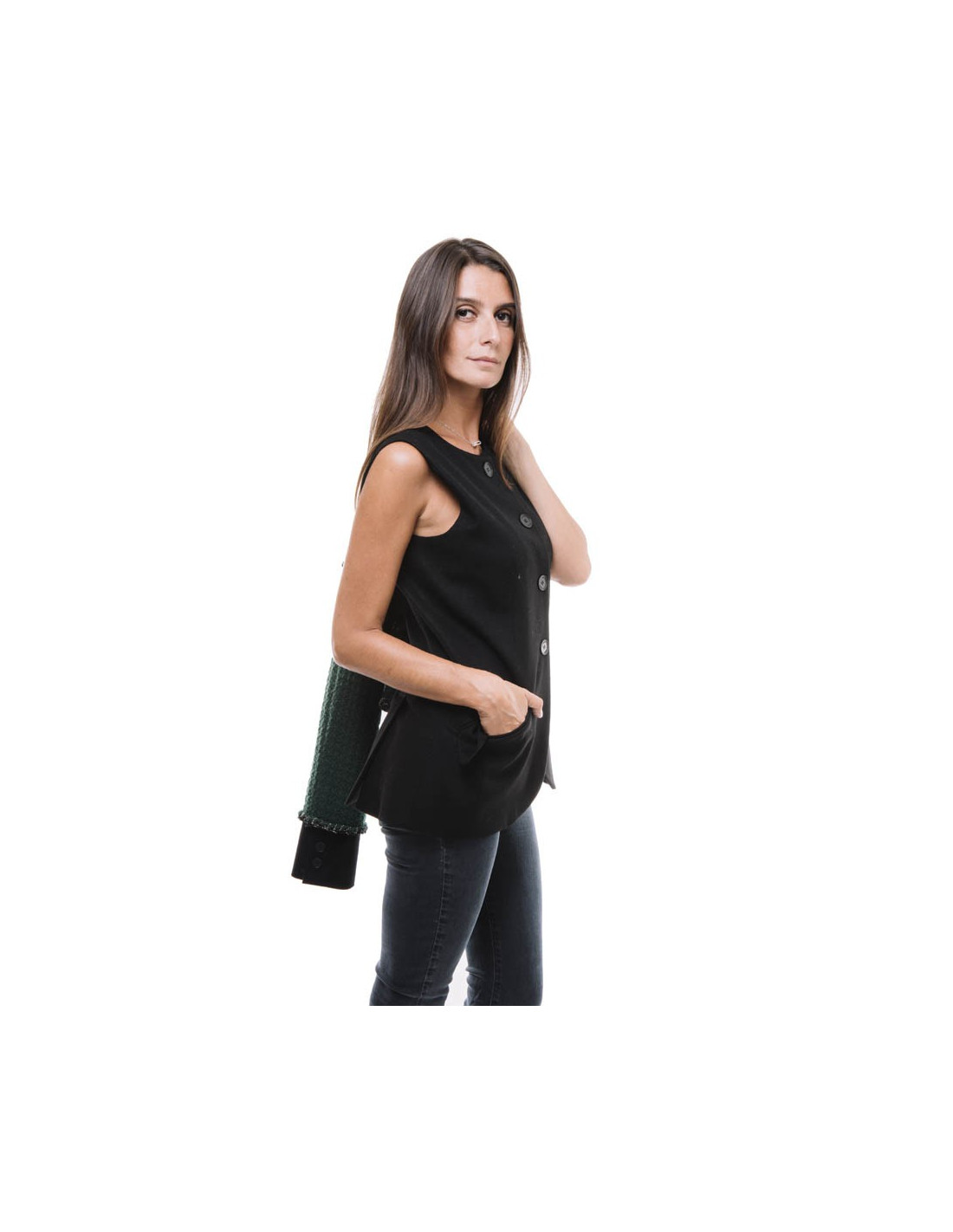 gilet long en laine noire sans manches avec deux poches sur les cotés, il a 2 fentes et se ferme avec des boutons noirs siglés Chanel, doublé de soie noire.