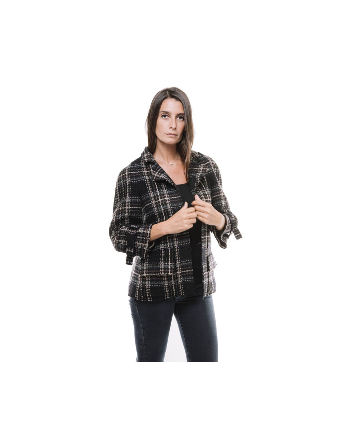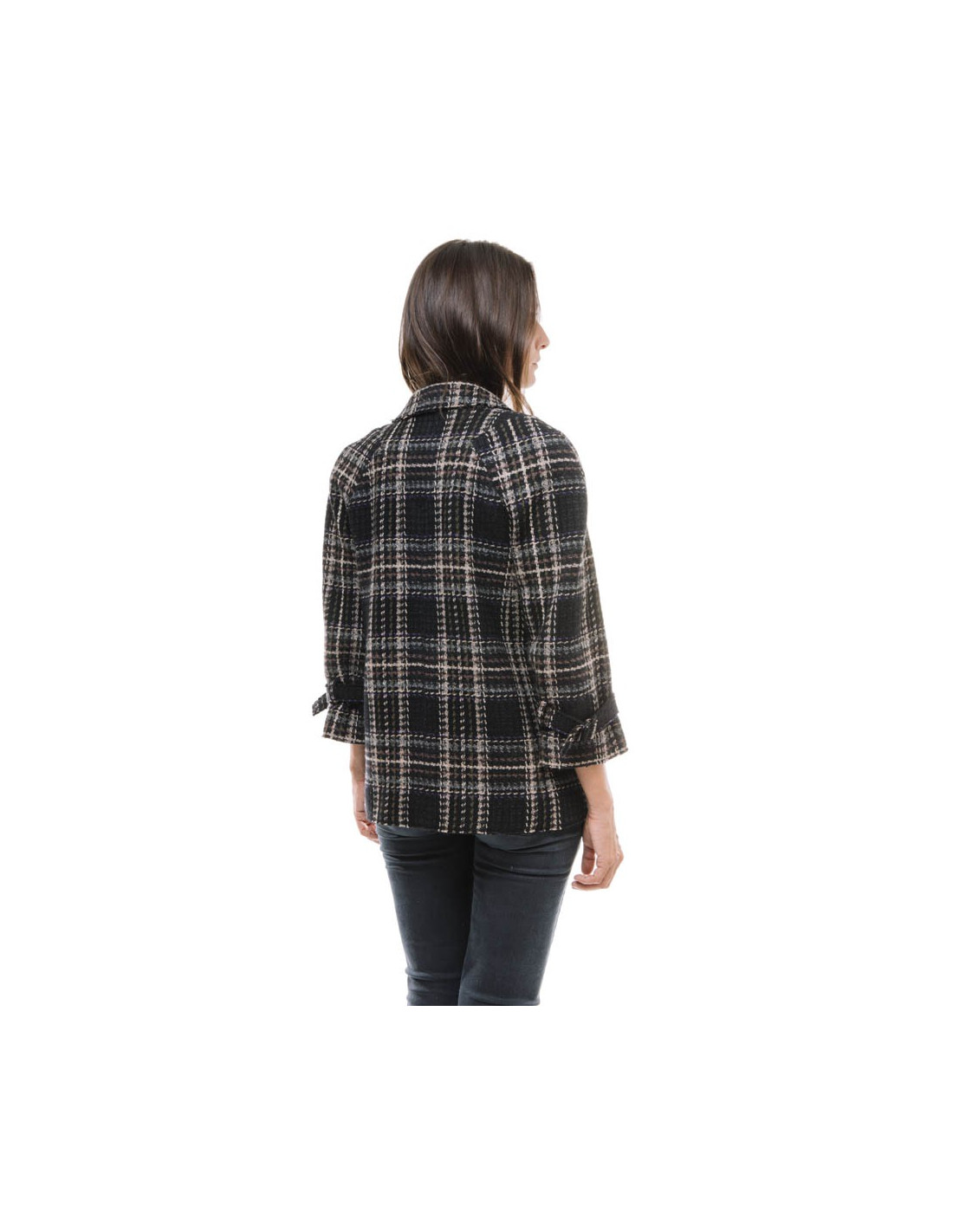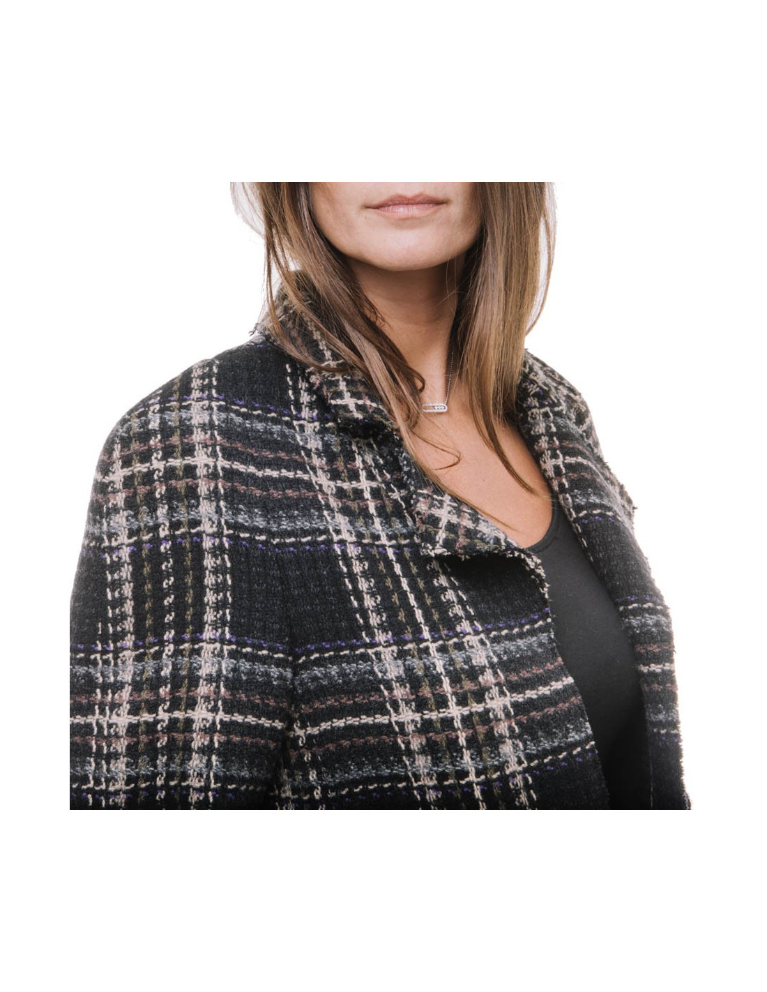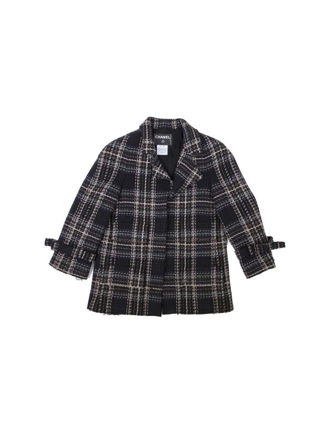 Veste taille 38, de la Maison Chanel en tweed de laine noire à carreaux beige, marron et violet, manches raglan.