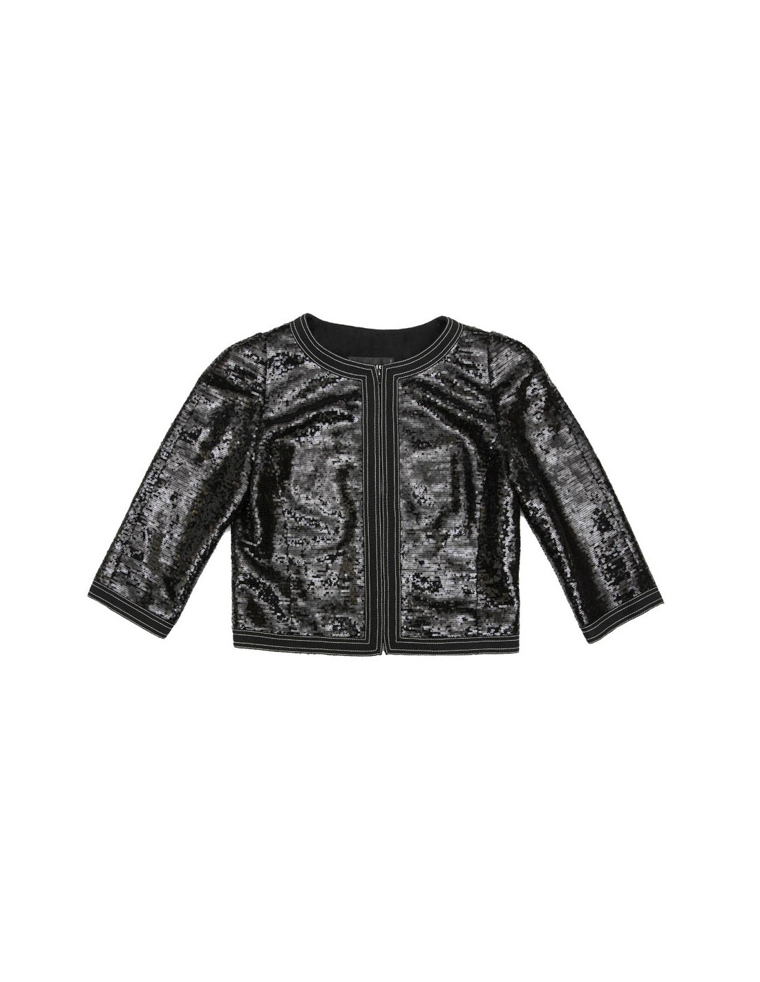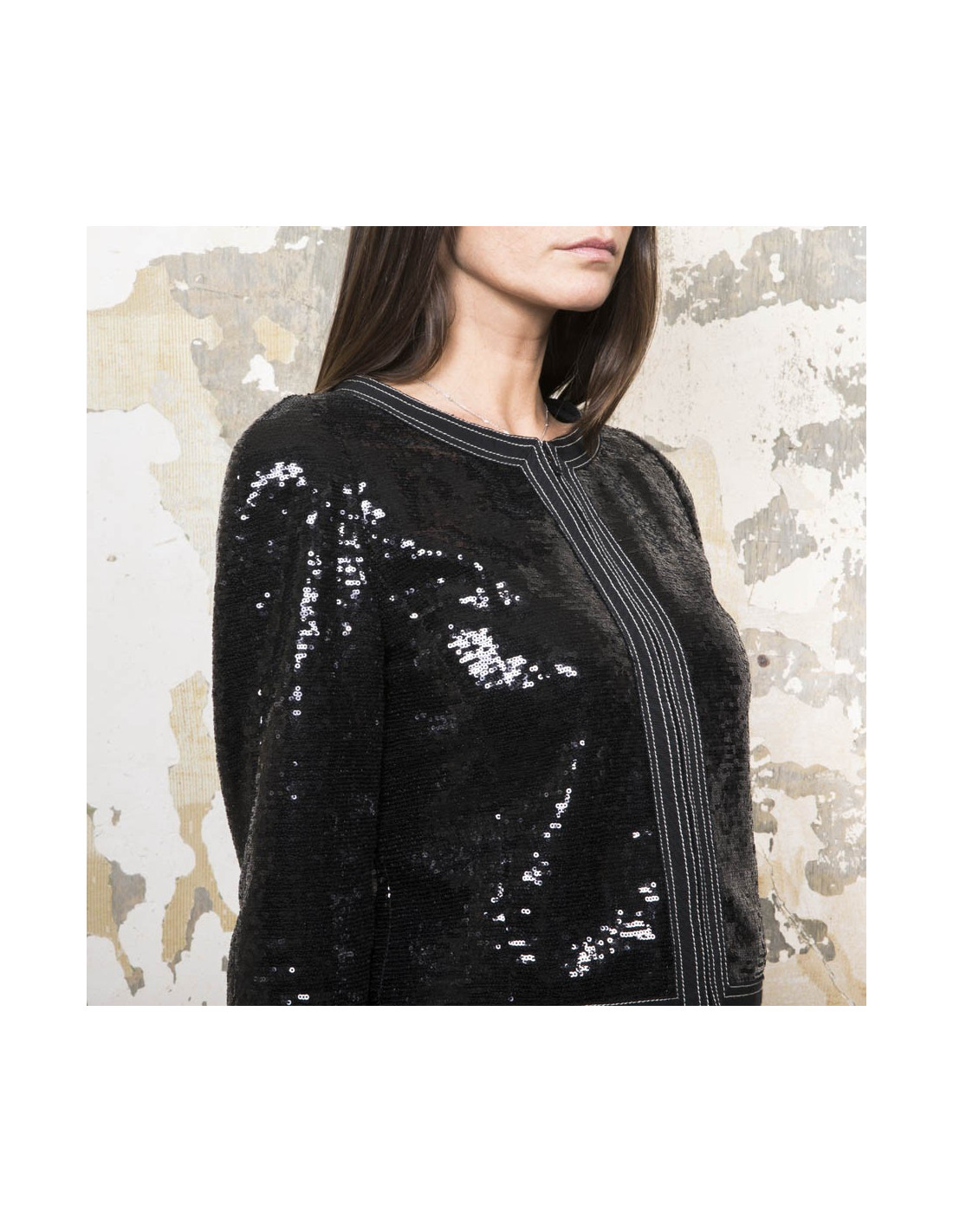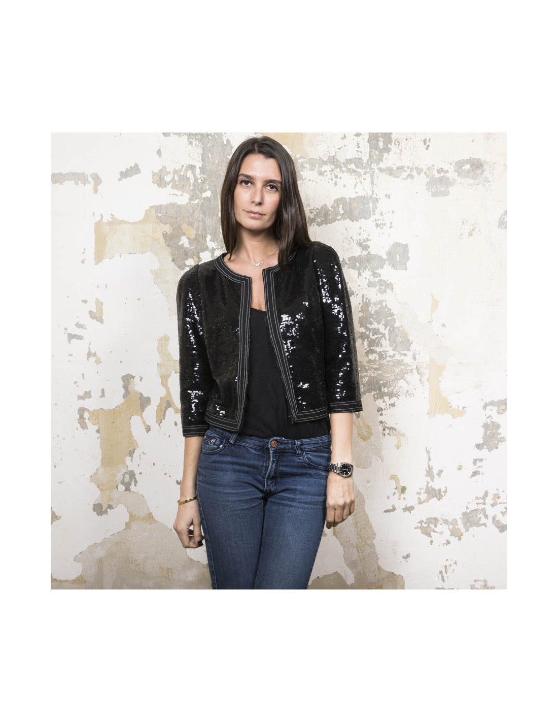 Veste courte à manches 3/4, taille 34 (absence d'étiquette de taille et de matière) Chanel à sequins noirs. Doublure en soie 100 % noire monogram. Se ferme à l'aide d'une fermeture zippée. Large bordure en piqué noir et coutures blanches. En très bon état.