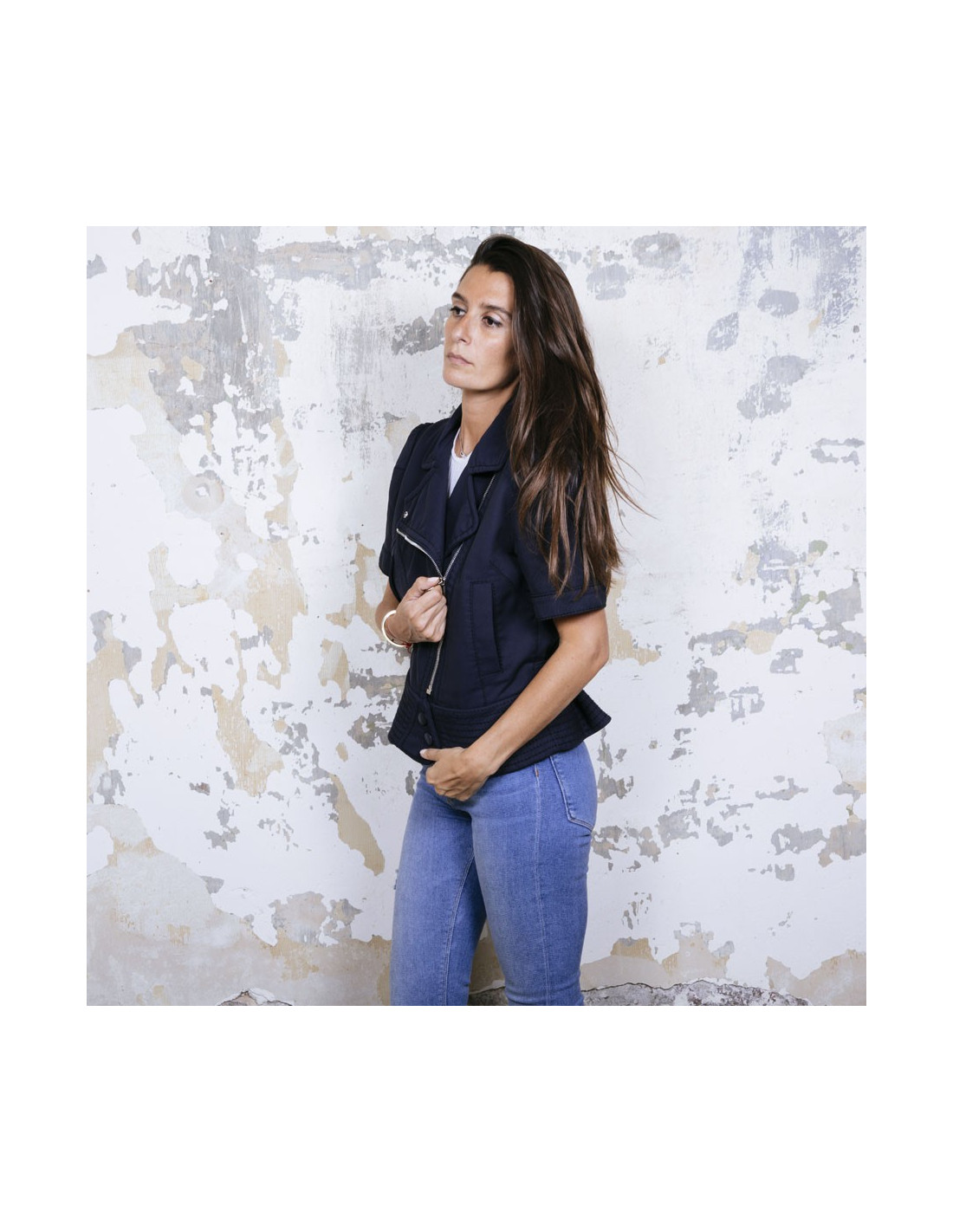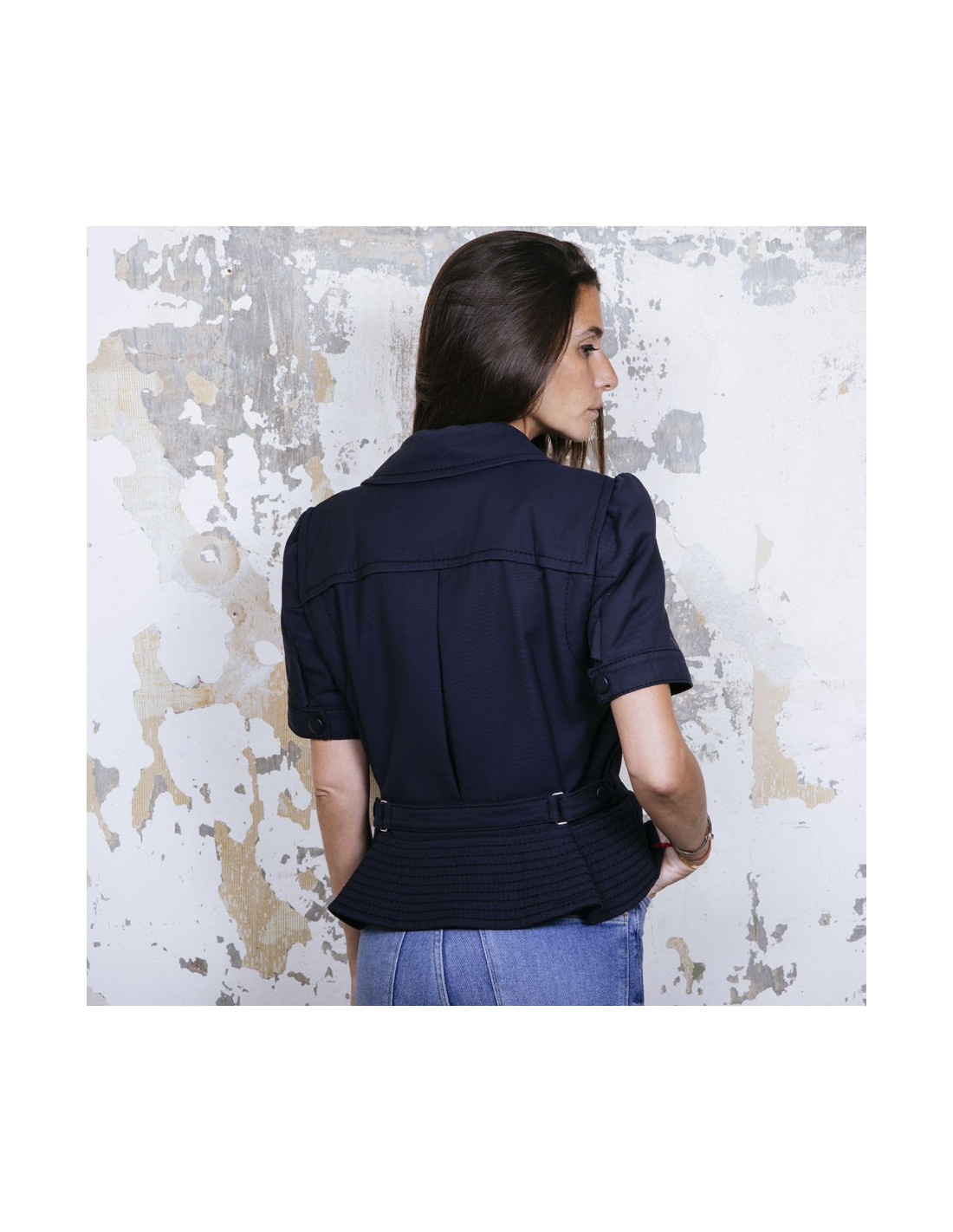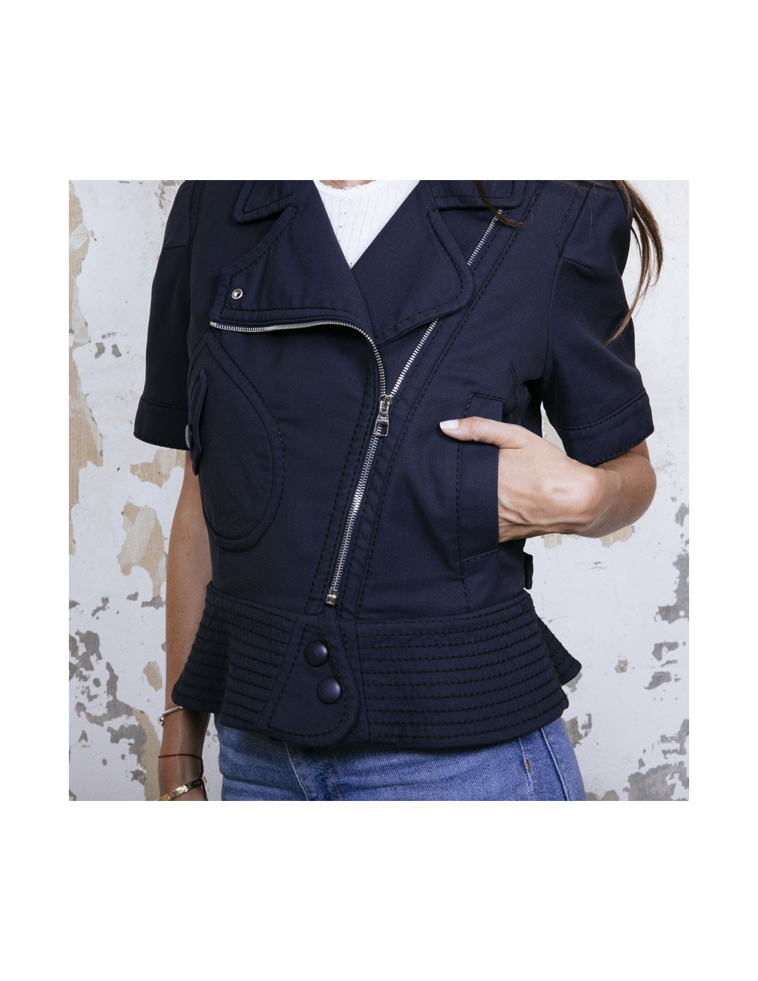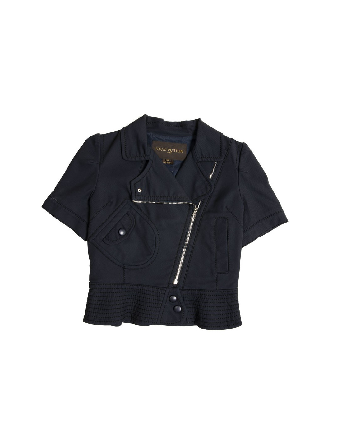 Veste Louis Vuitton en coton bleu marine avec surpiqûres. Taille 42. Fermeture zippée argentée et boutons en cuir. Deux poches plates dont une à bouton pression. Manches courtes avec boutons pression. Deux lanières ajustables au dos avec boutons pression.