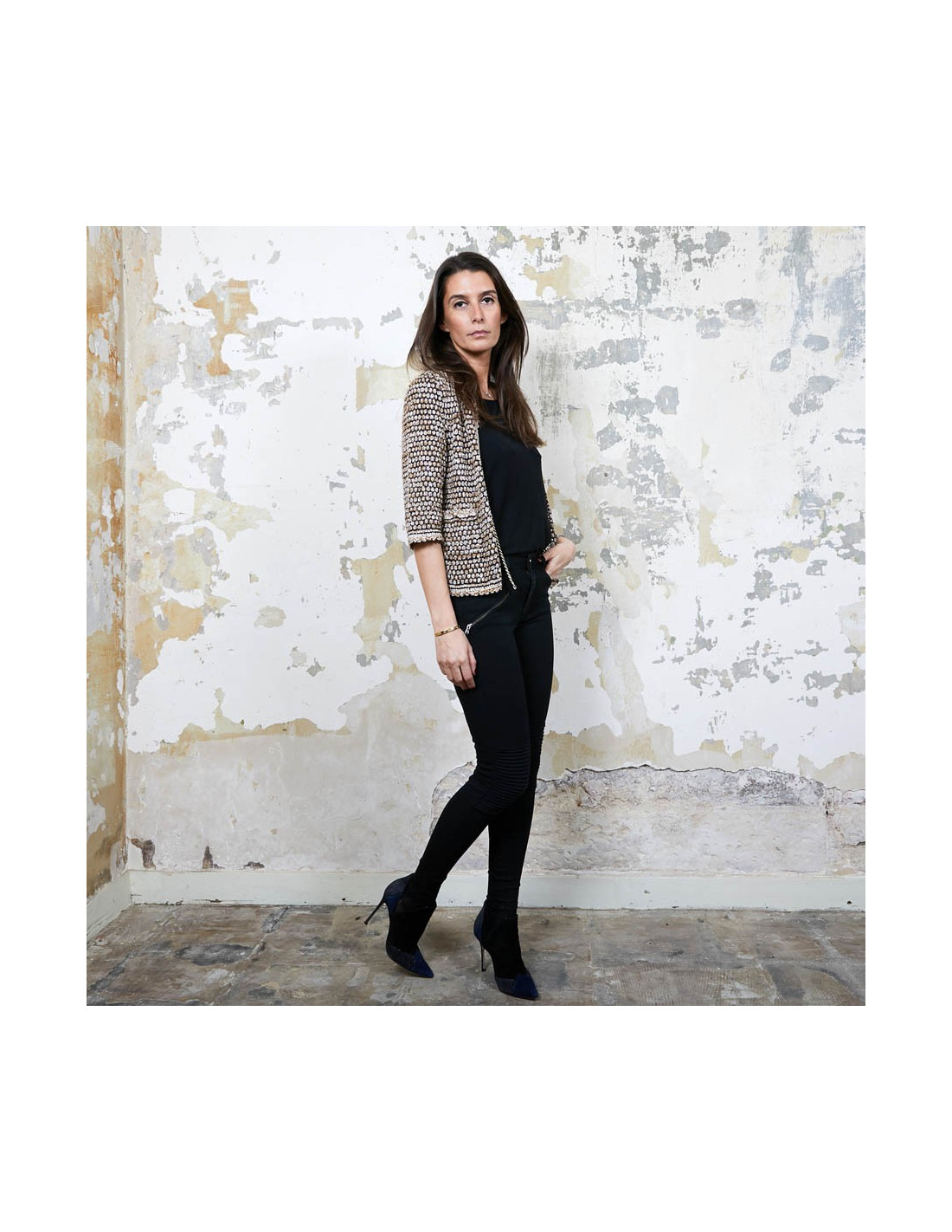 Il y a un petit cordon qui se termine par une chainette dorée et deux poches plaquées se fermant par un bouton doré.
