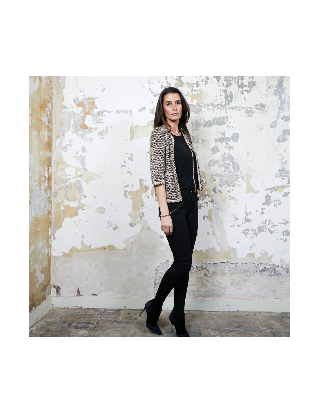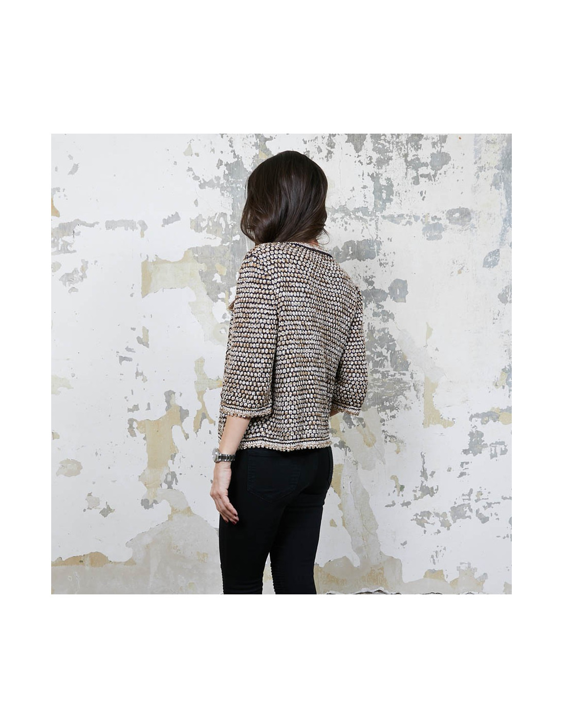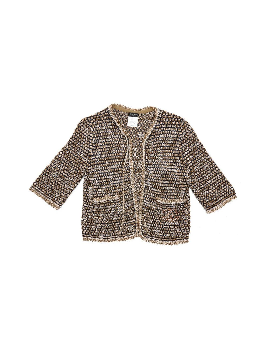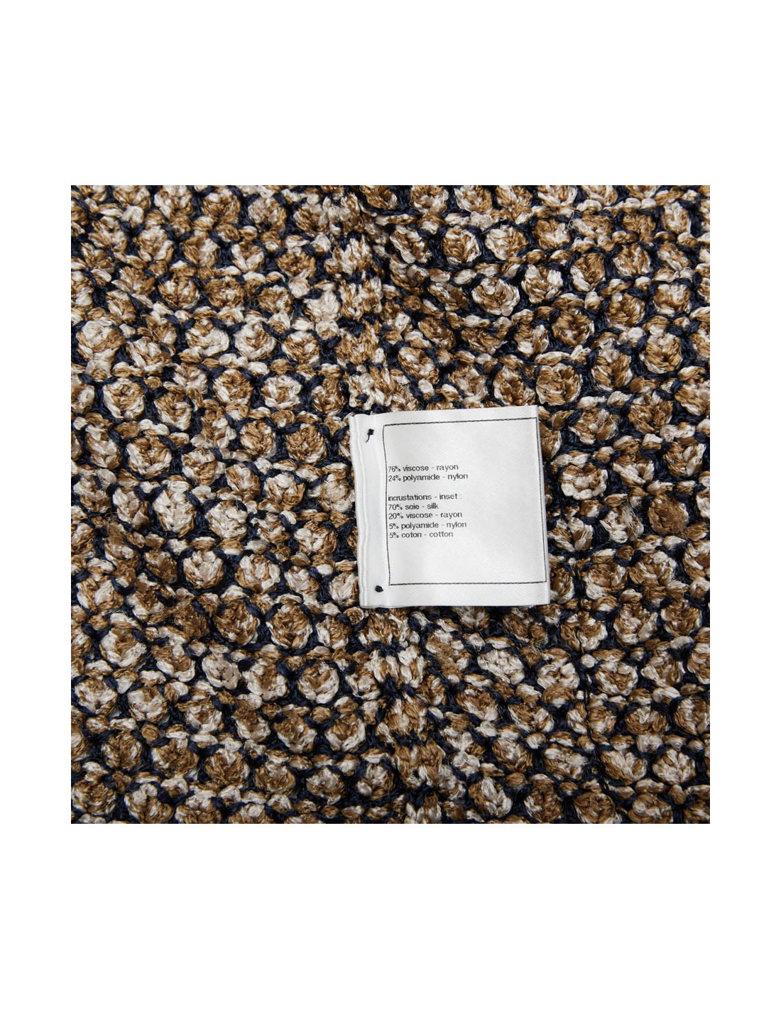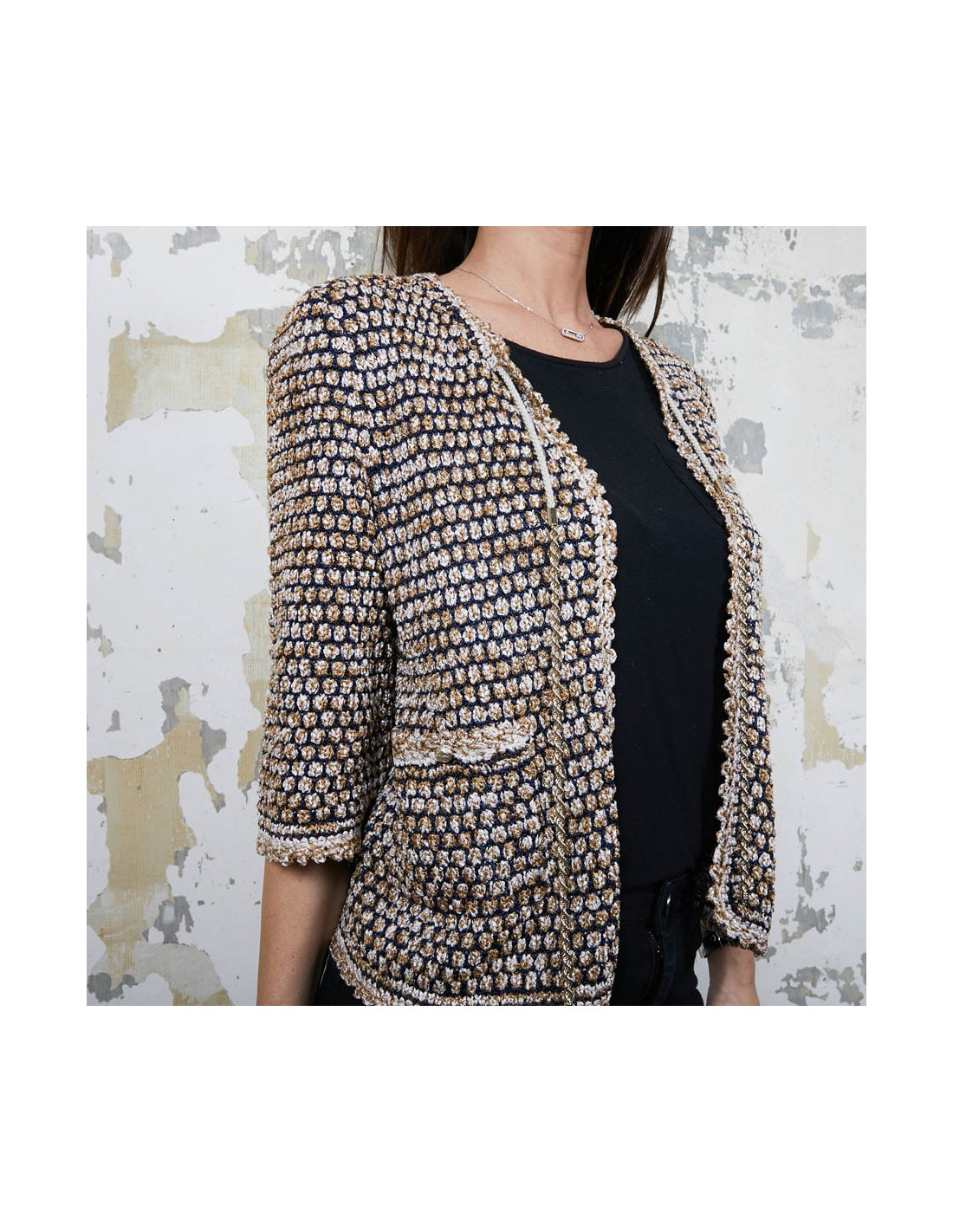Gilet Chanel T36 en tricot doré, bleu marine et écru. Made in Italy.