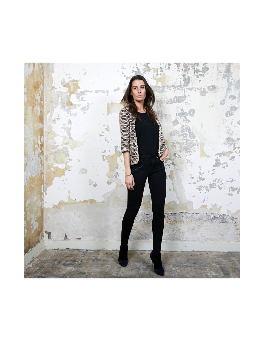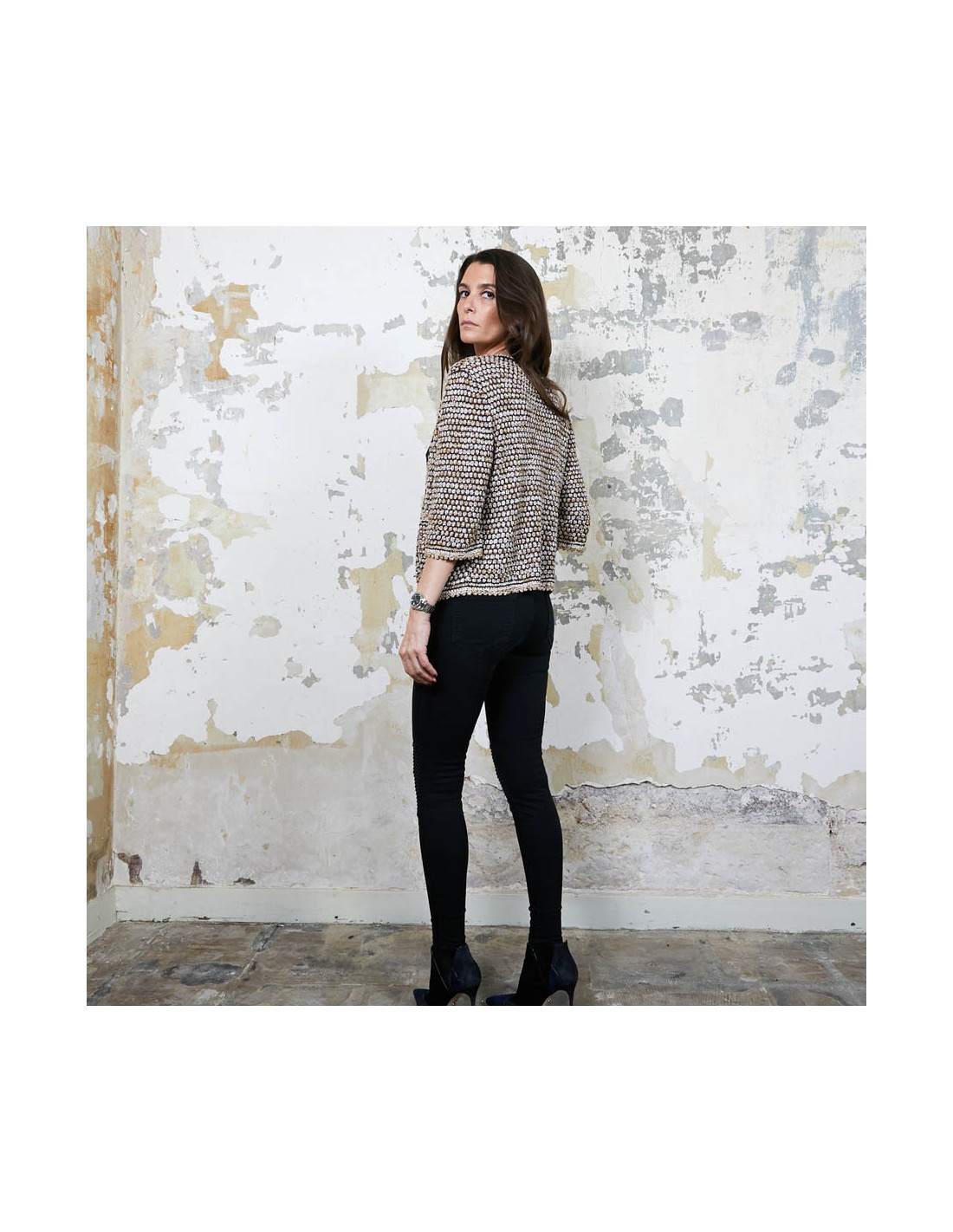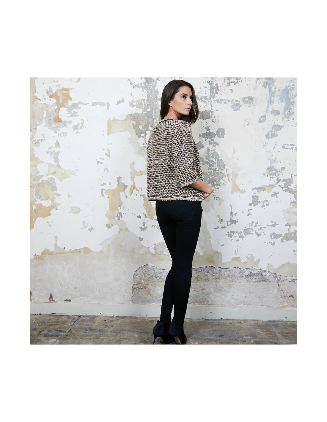 Dimensions de la veste à plat : Largeur aux épaules 38 cm, largeur sous les aisselles 44cm et hauteur totale 56cm. Les manches sont 3/4 et mesurent 41cm.
