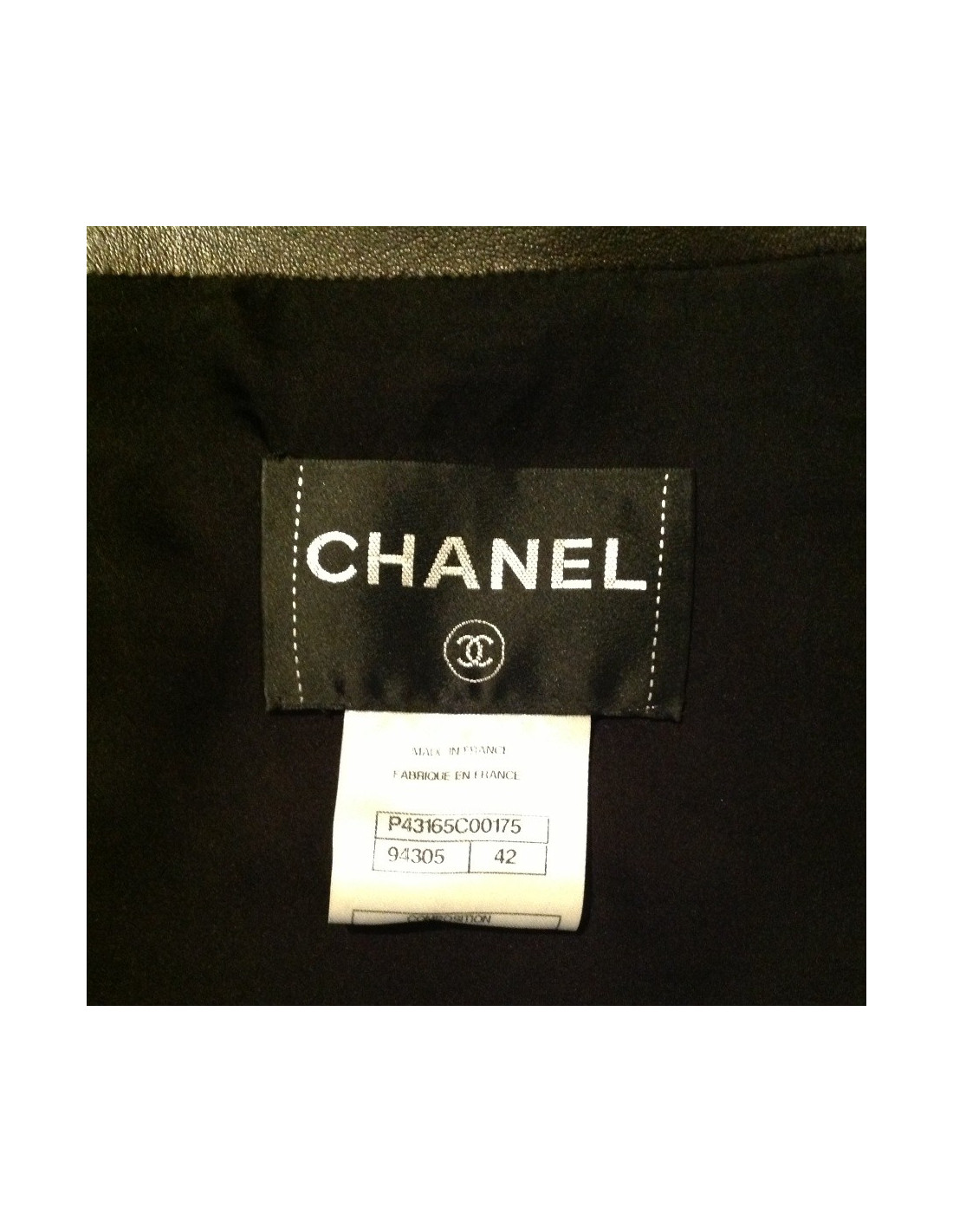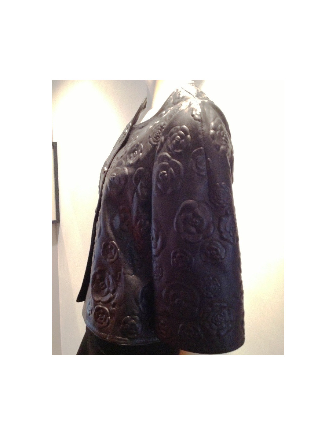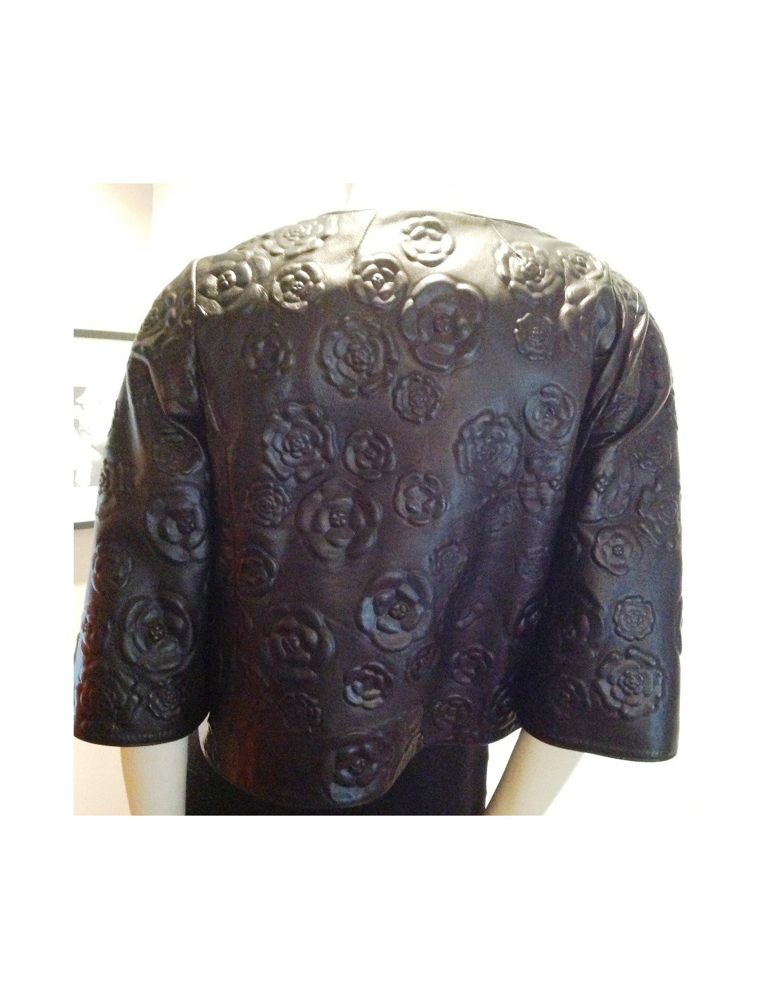 Magnifique veste CHANEL T42 en cuir d'agneau noir embossé de camélias. Elle se ferme à l'aide de boutons pressions ruthénium siglés CC. Les manches sont trois quart. La doublure est en soie noire au motif CC, camélias, Chanel... Très peu portée. Une veste collector....