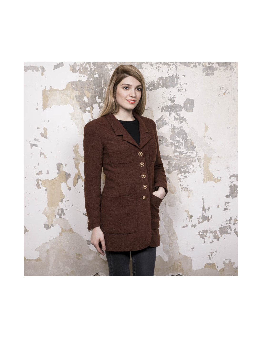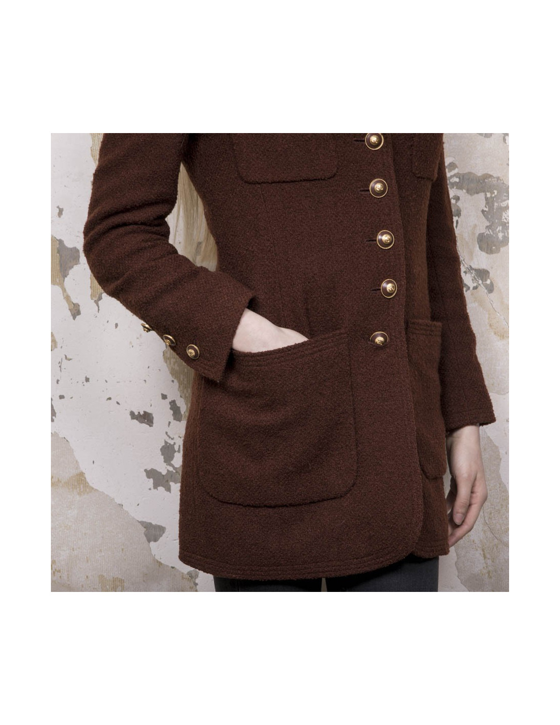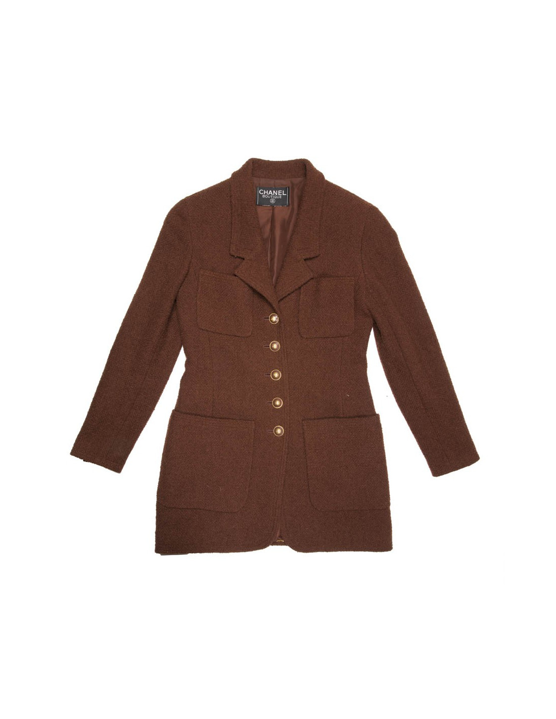 Veste mi-longue Chanel vintage marron. Absence d'étiquettes taille et matière. Correspond à une taille 38. Se ferme à l'aide de cinq boutons bordeaux et métal doré siglés 'CC'. On retrouve les trois mêmes boutons à chaque poignet et quatre poches fente à l'avant. Doublure en soie monogram.