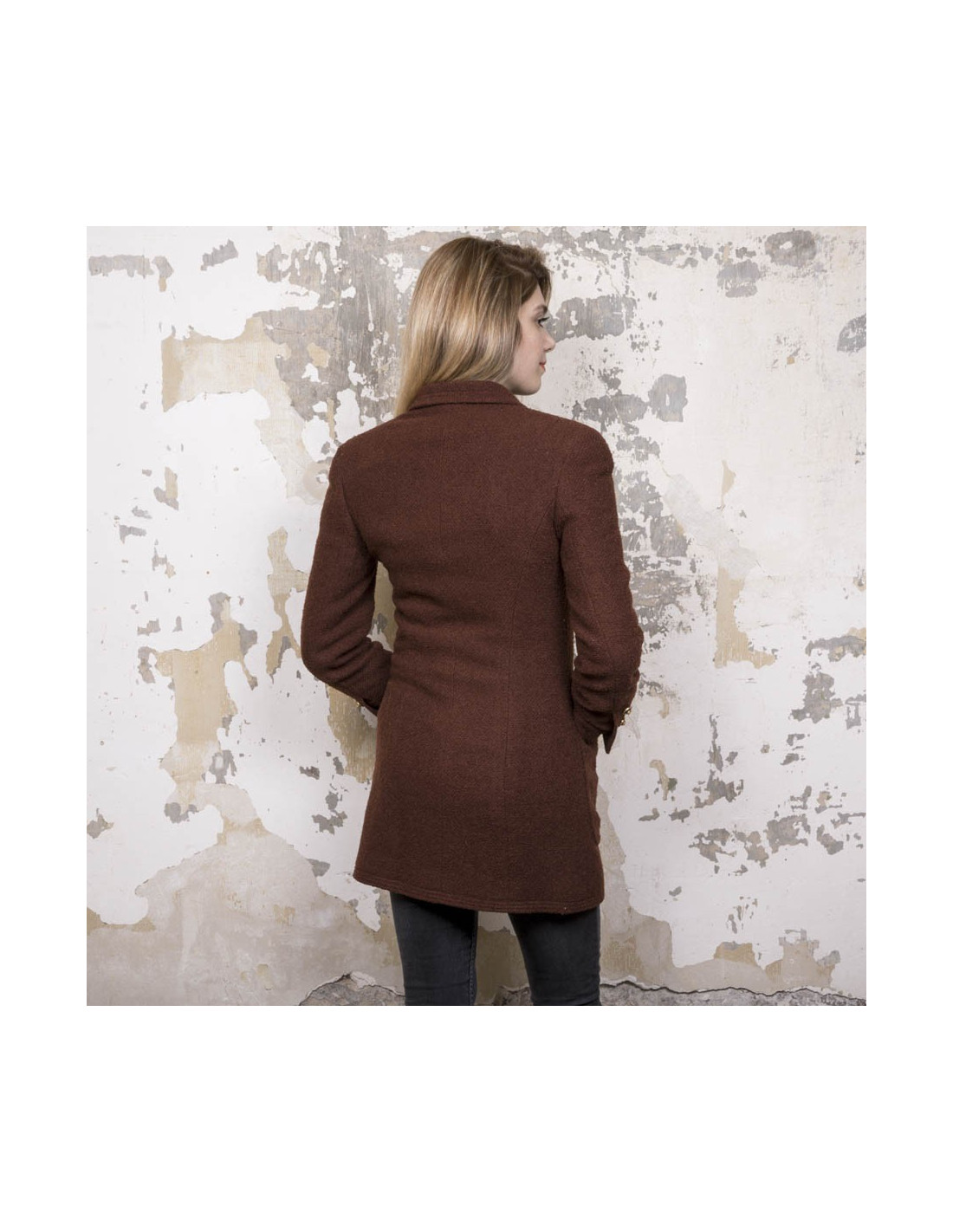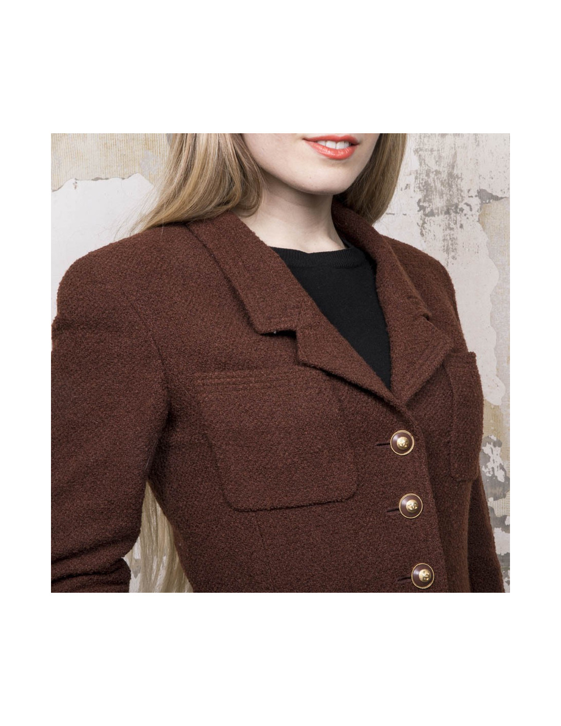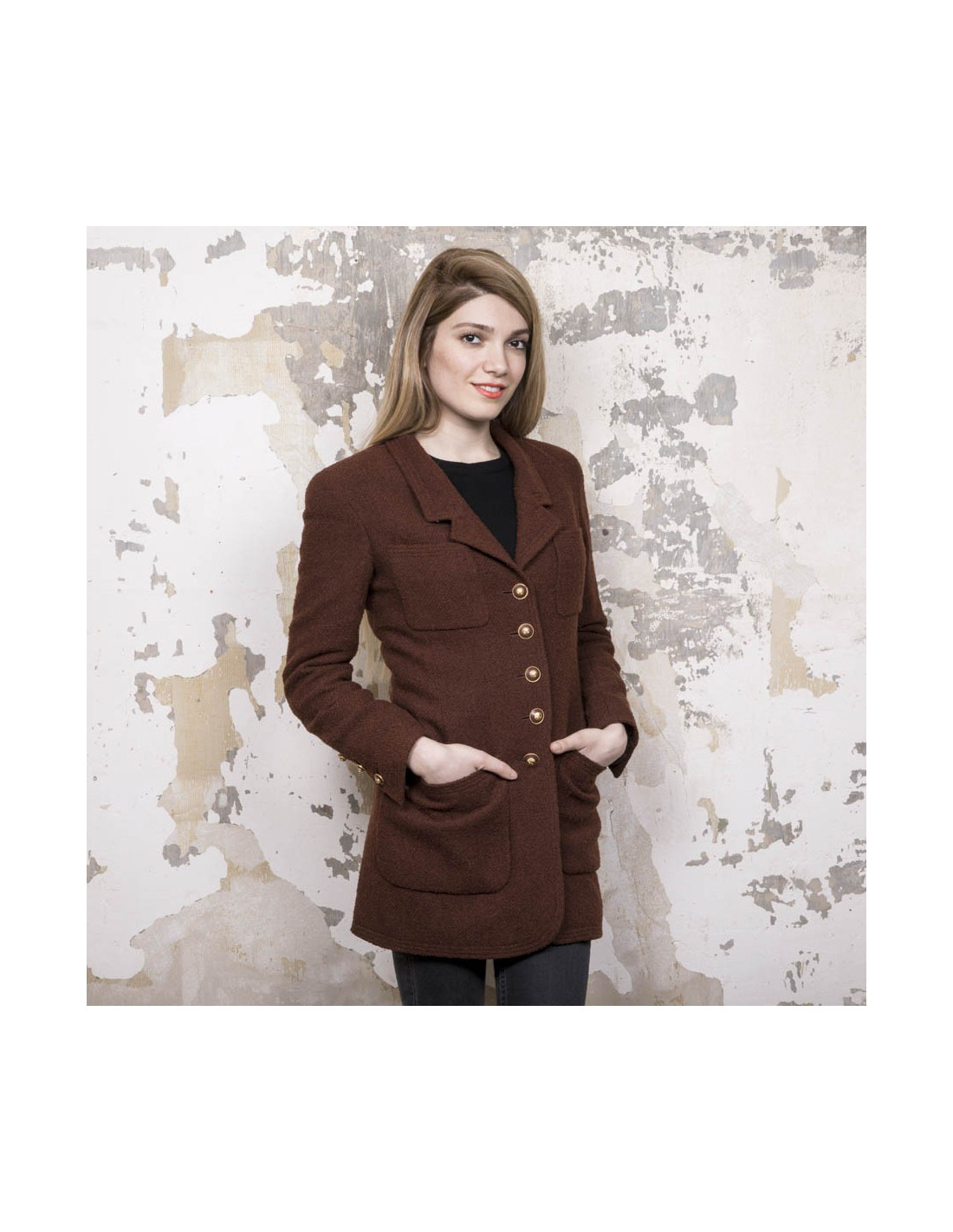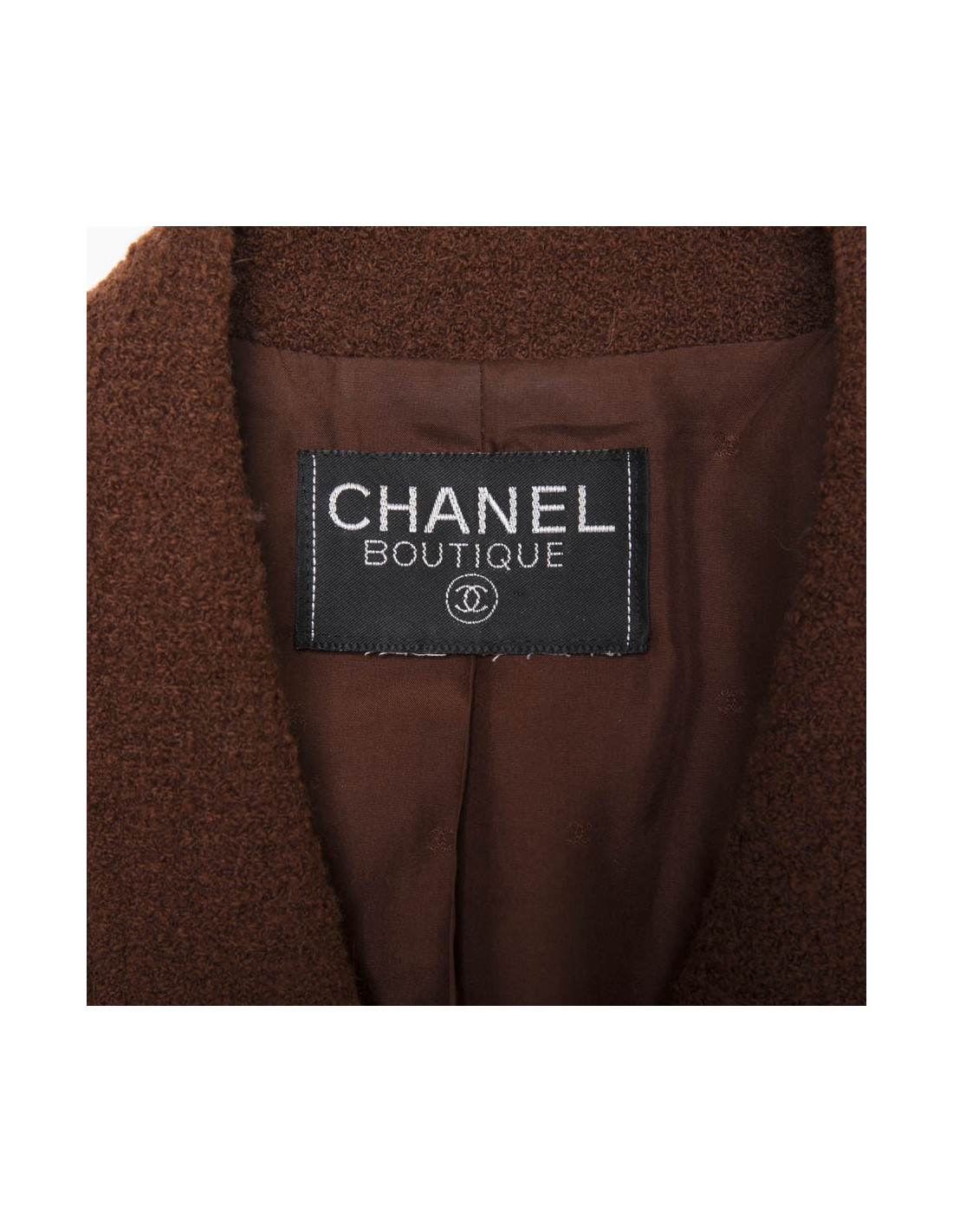 Veste mi-longue Chanel vintage marron. Absence d'étiquettes taille et matière. Correspond à une taille 38. Se ferme à l'aide de cinq boutons bordeaux et métal doré siglés 'CC'. On retrouve les trois mêmes boutons à chaque poignet et quatre poches fente à l'avant. Doublure en soie monogram.