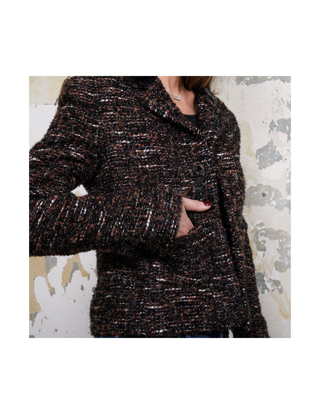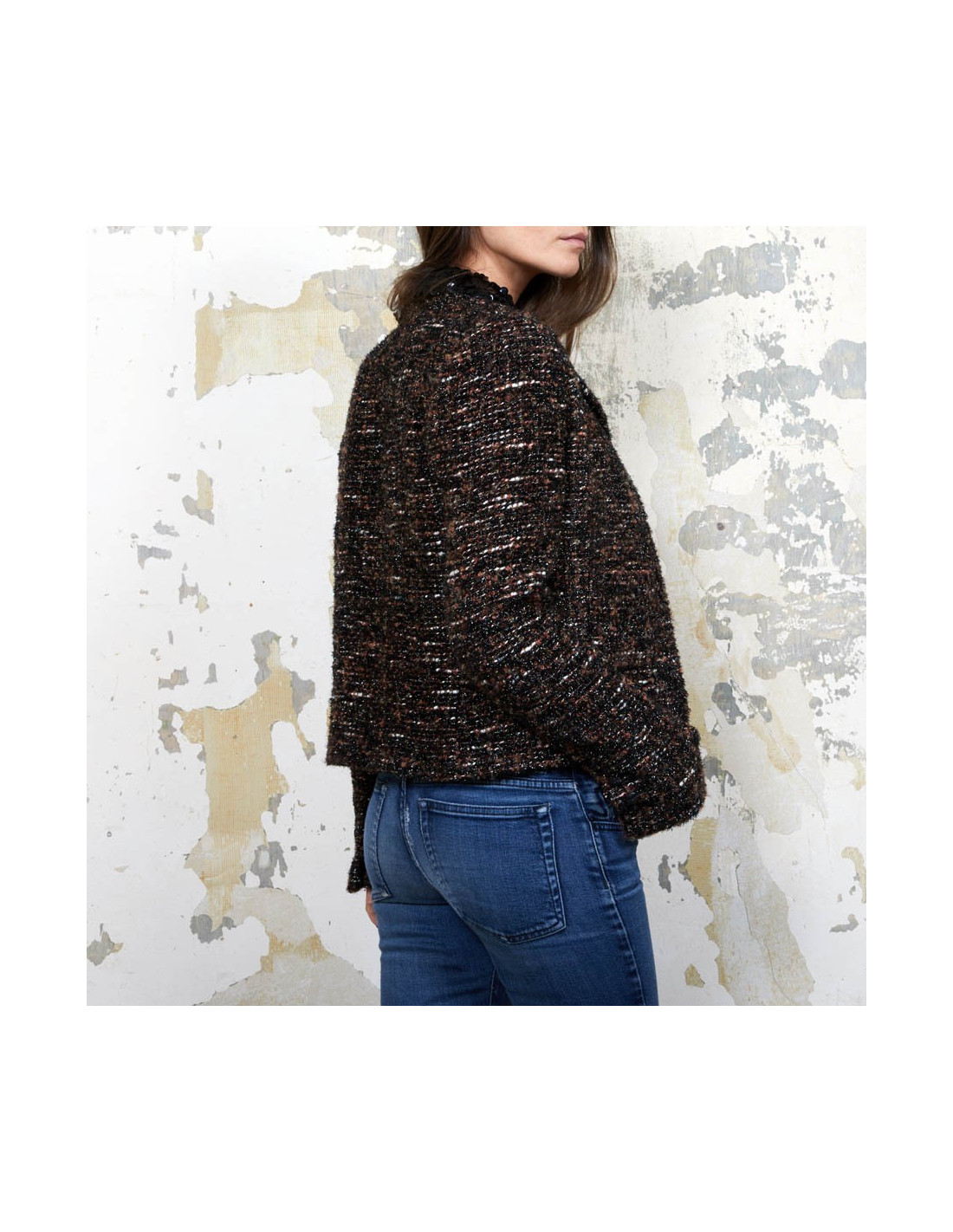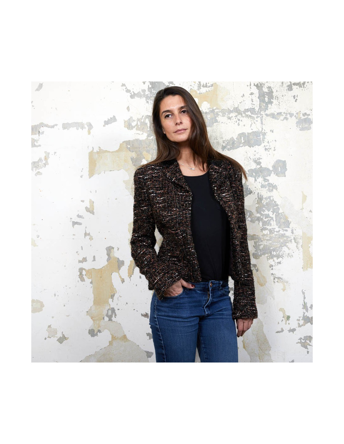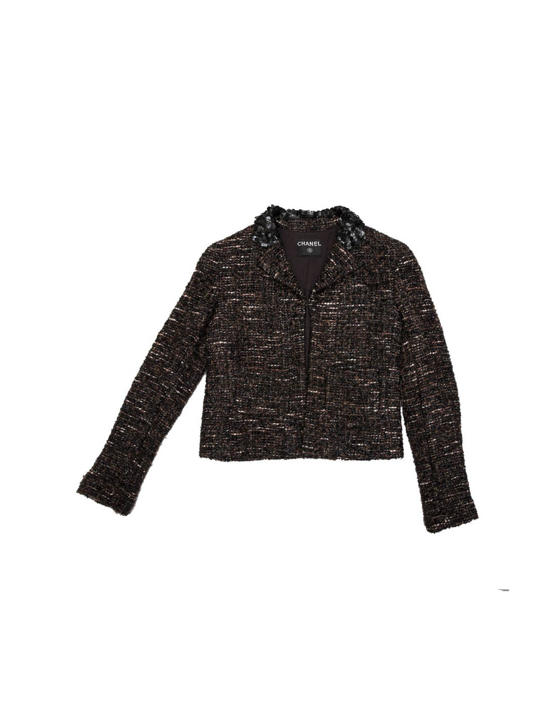 Veste T 40 (absence d'étiquette de taille) Chanel en tweed marron, noir et blanc tissé de fils brillants noirs.
