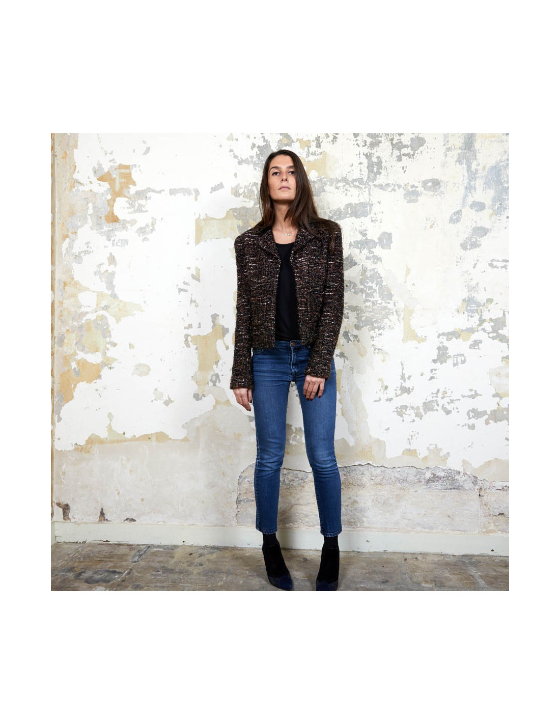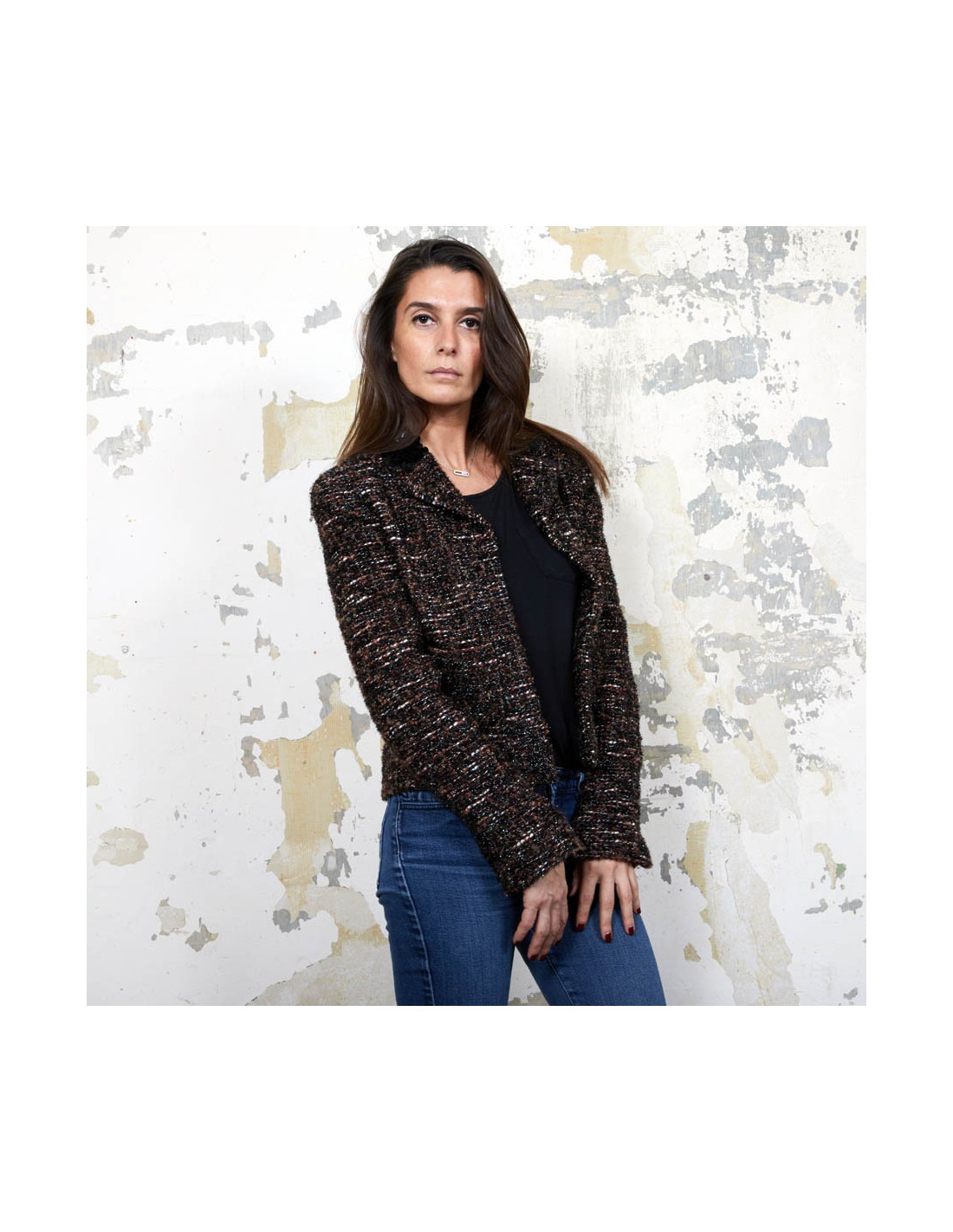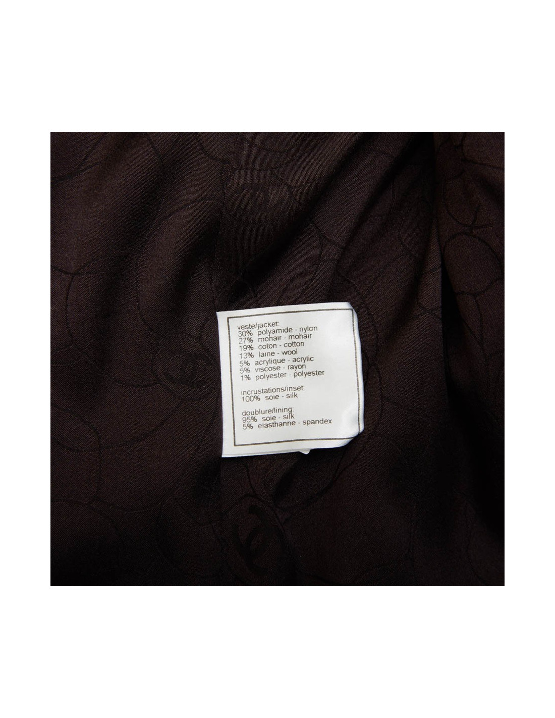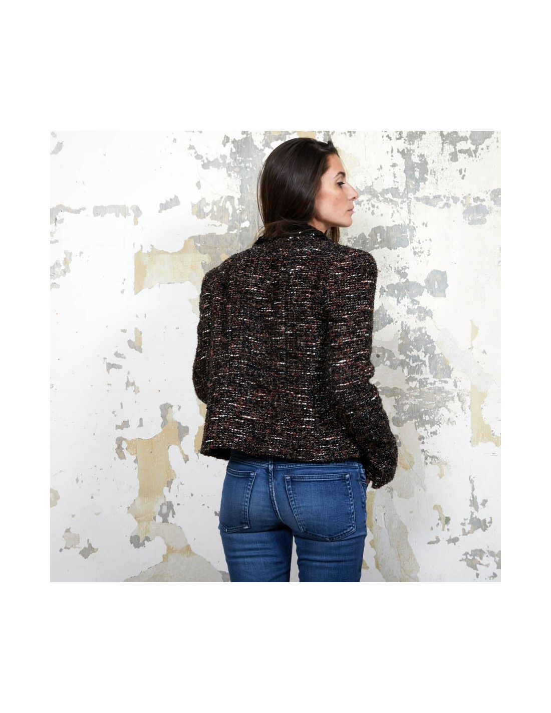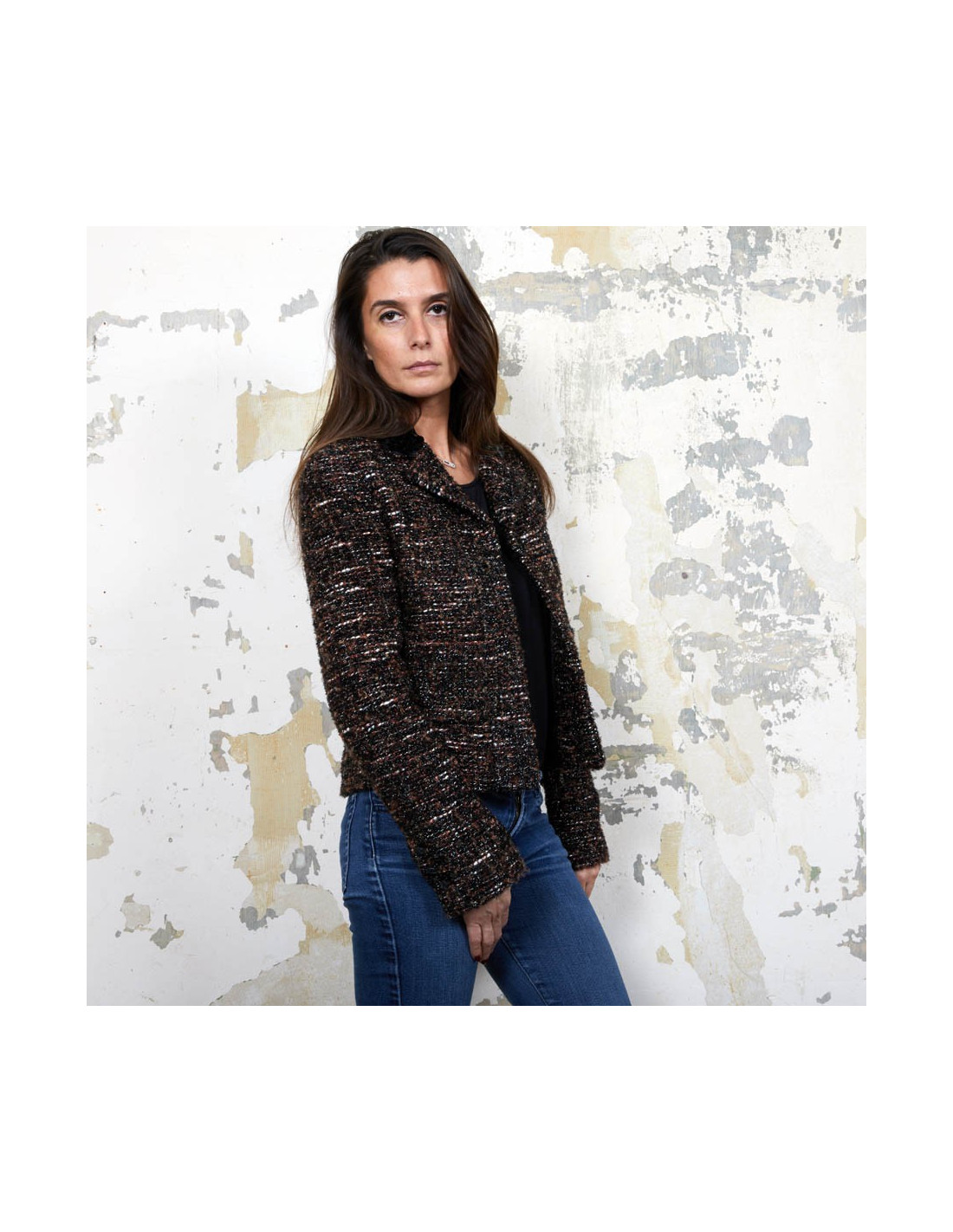 Veste T 40 (absence d'étiquette de taille) Chanel en tweed marron, noir et blanc tissé de fils brillants noirs.