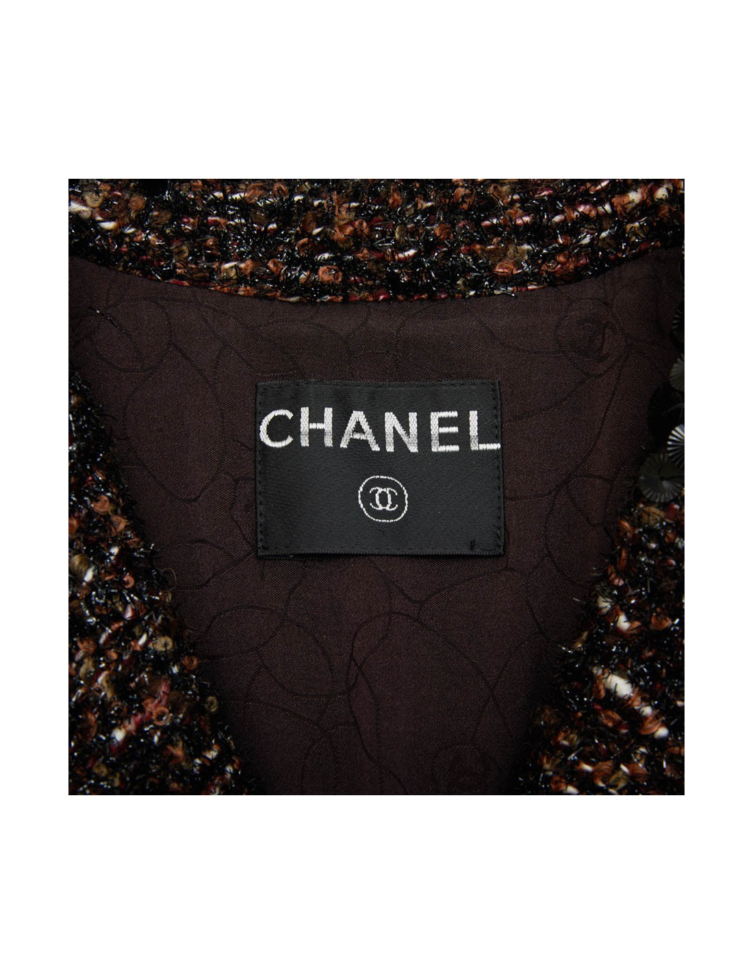 Veste CHANEL T 40 en tweed marron et fils brillants noirs