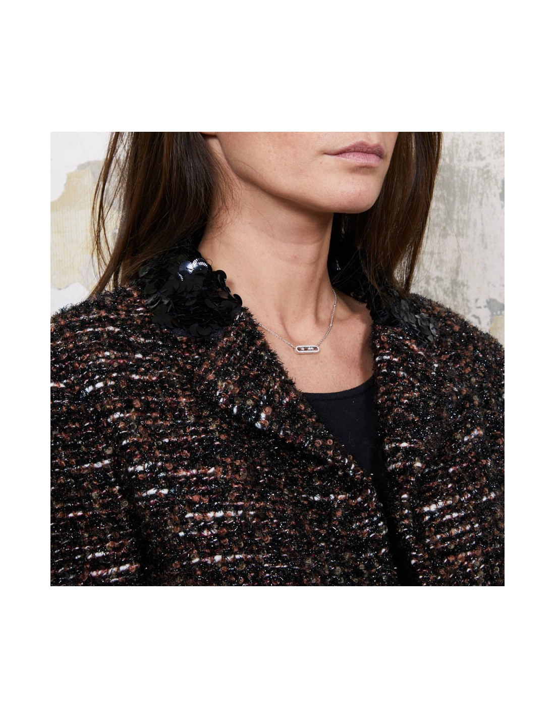 Joli détail sur le col : il est entièrement recouvert de sequins noirs. Chaque manche a 3 boutons noirs avec incrustations de perles.