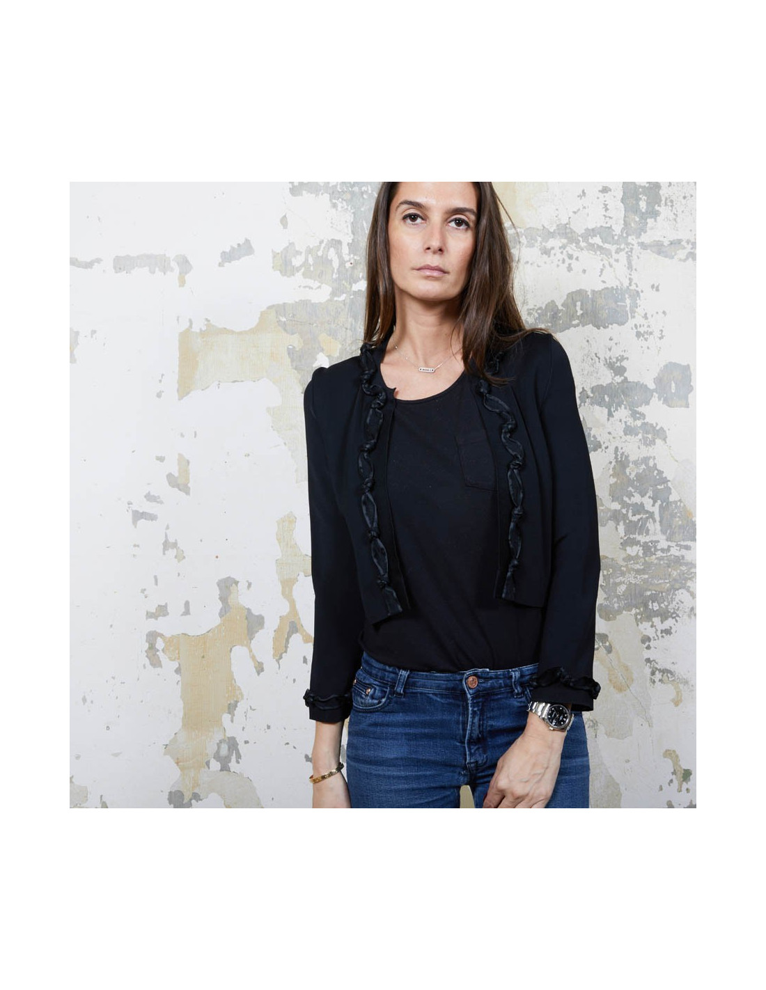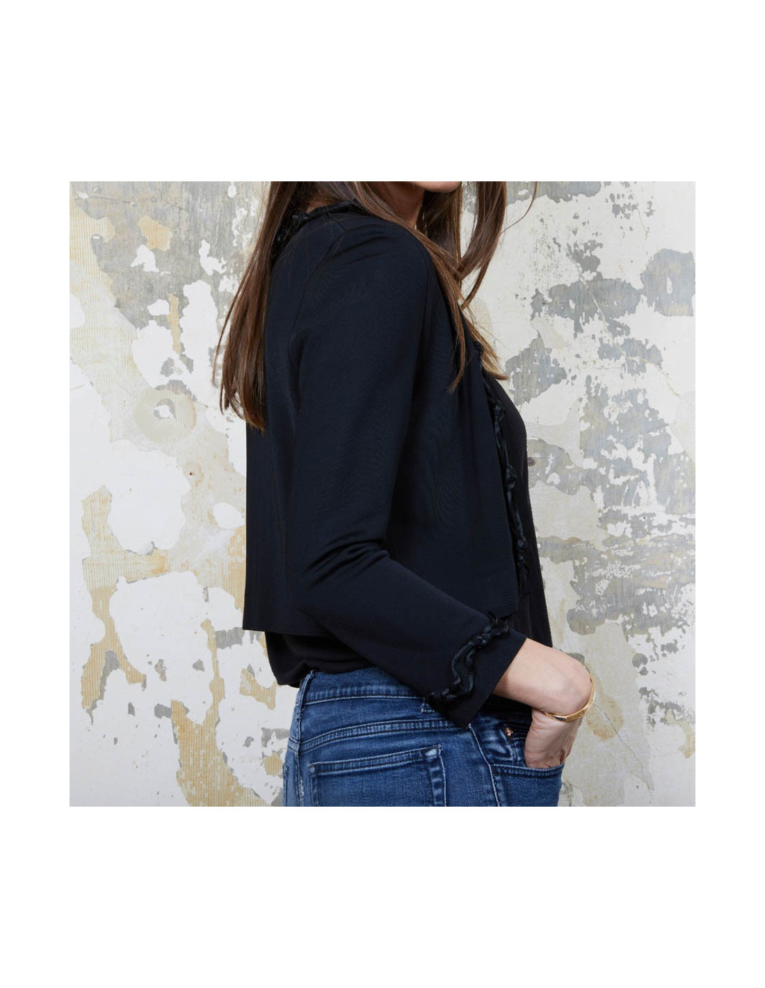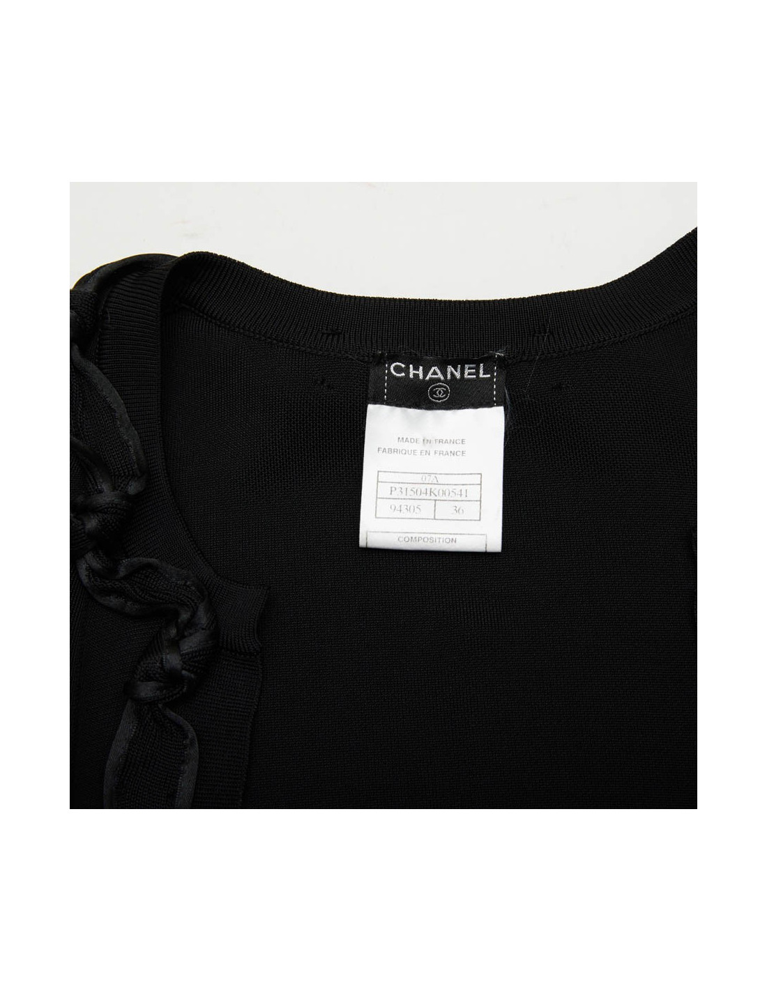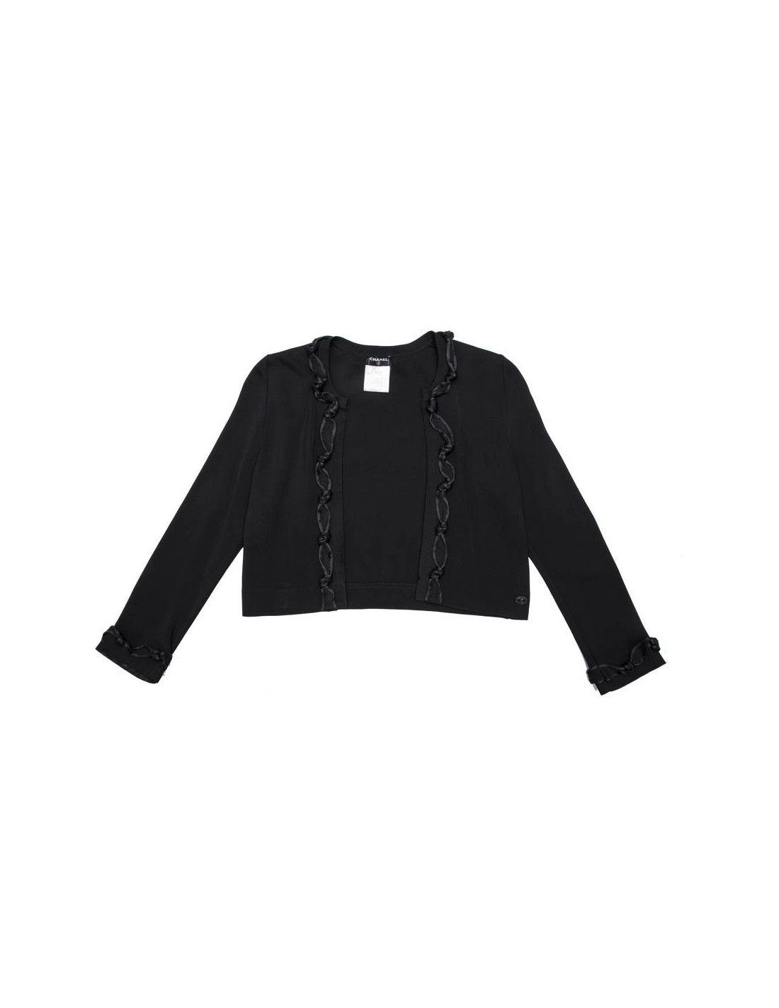Gilet noir T 36 en viscose Chanel, gansé à l'avant et aux poignets d'une bande agrémentée des noeuds. Collection Automne 2007. Made in France.