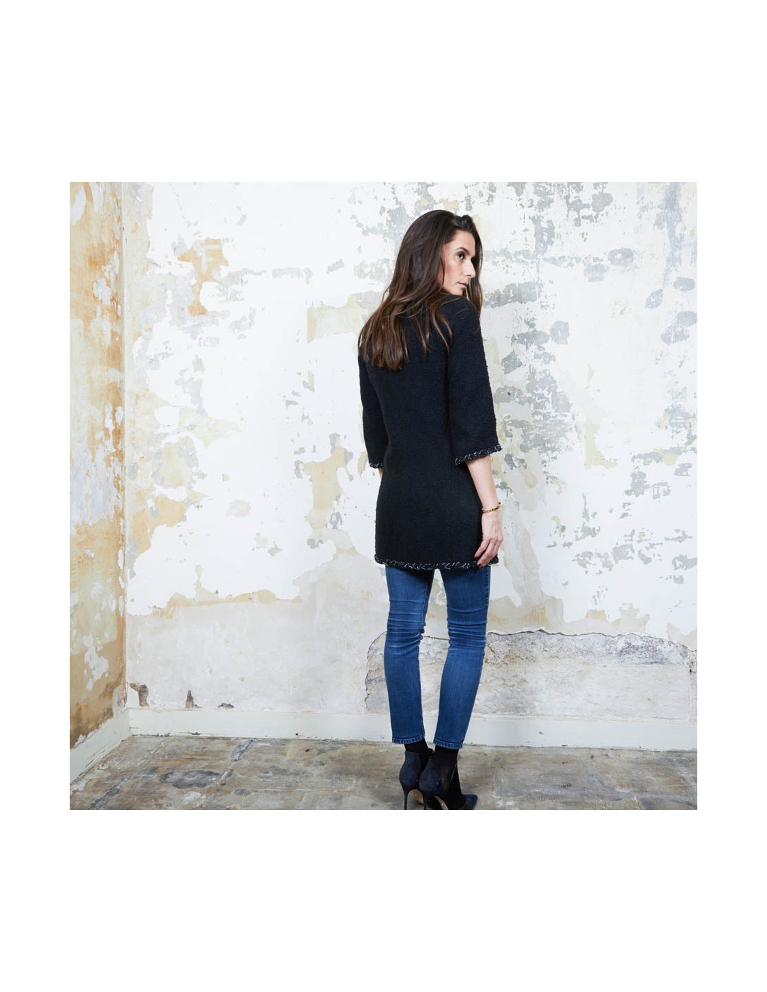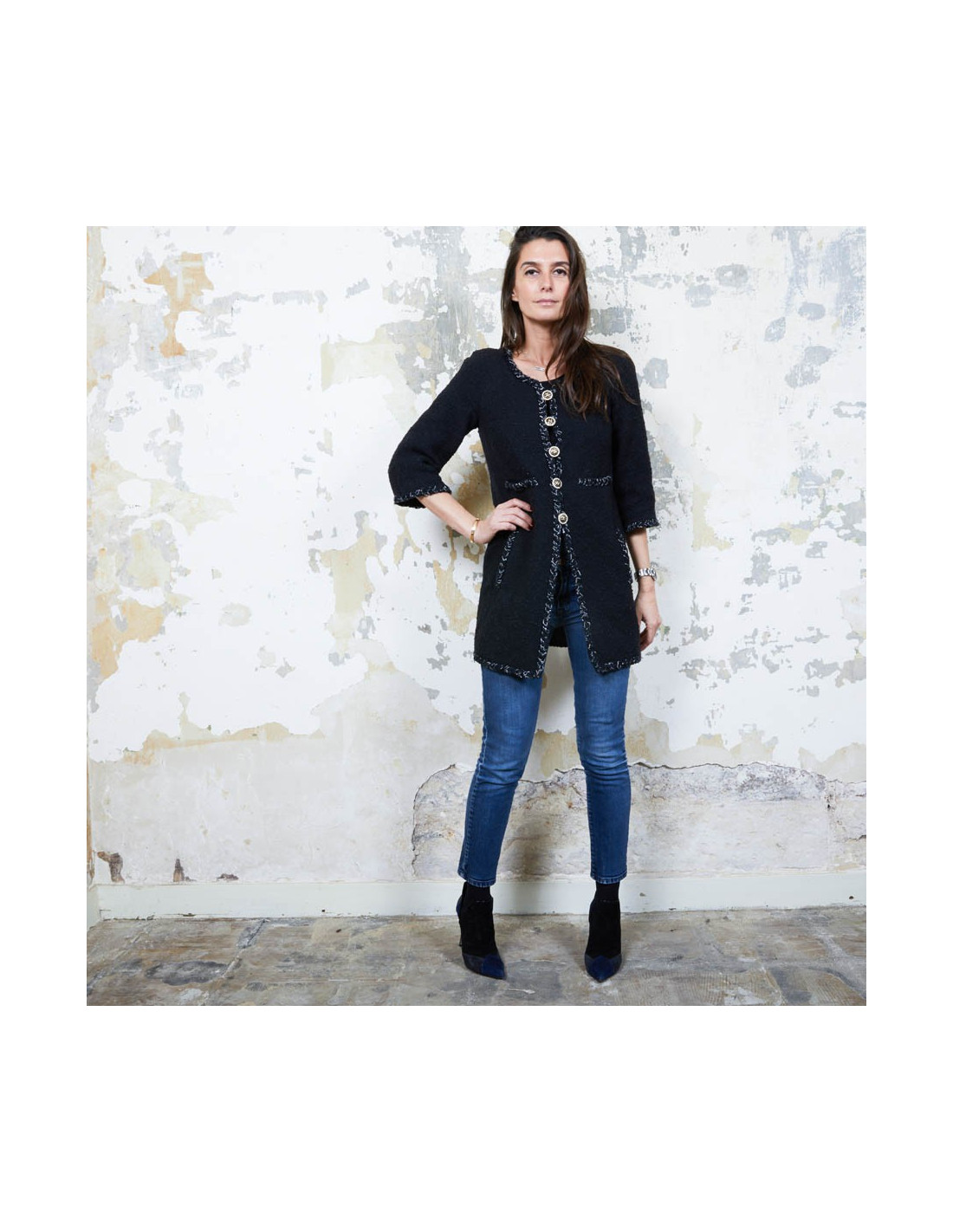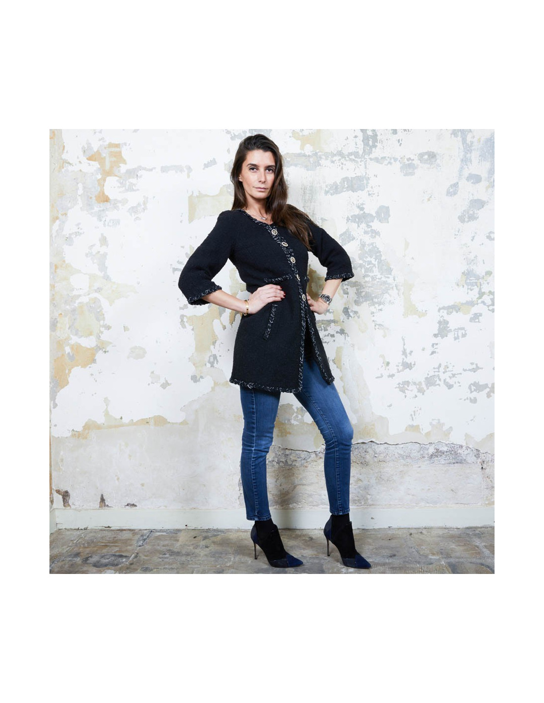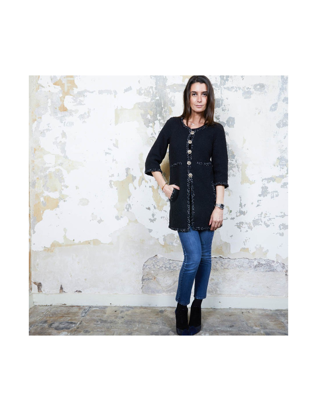 Iconique veste longue T 34 Chanel en tweed noir. Collection Printemps 2007. Made in France.