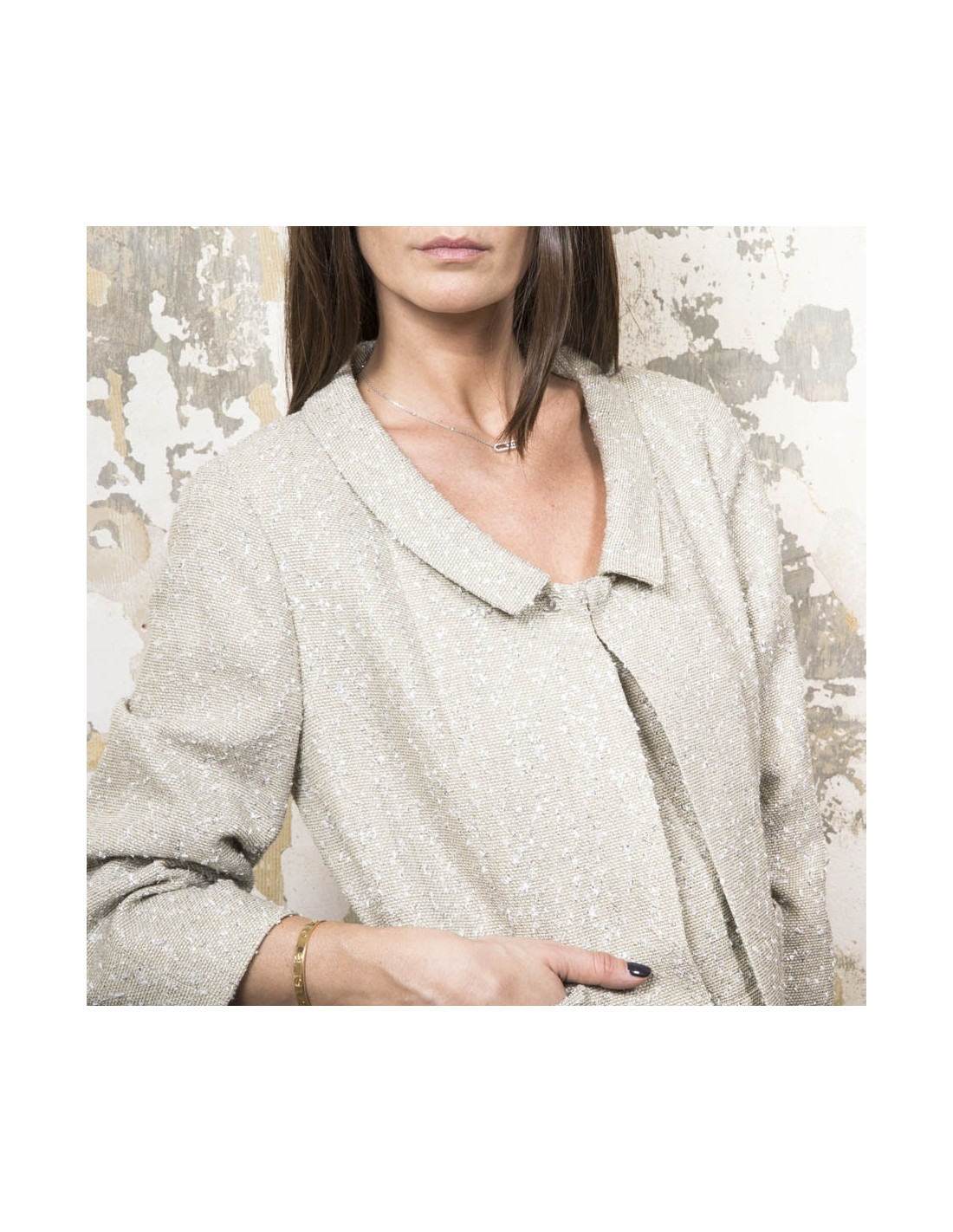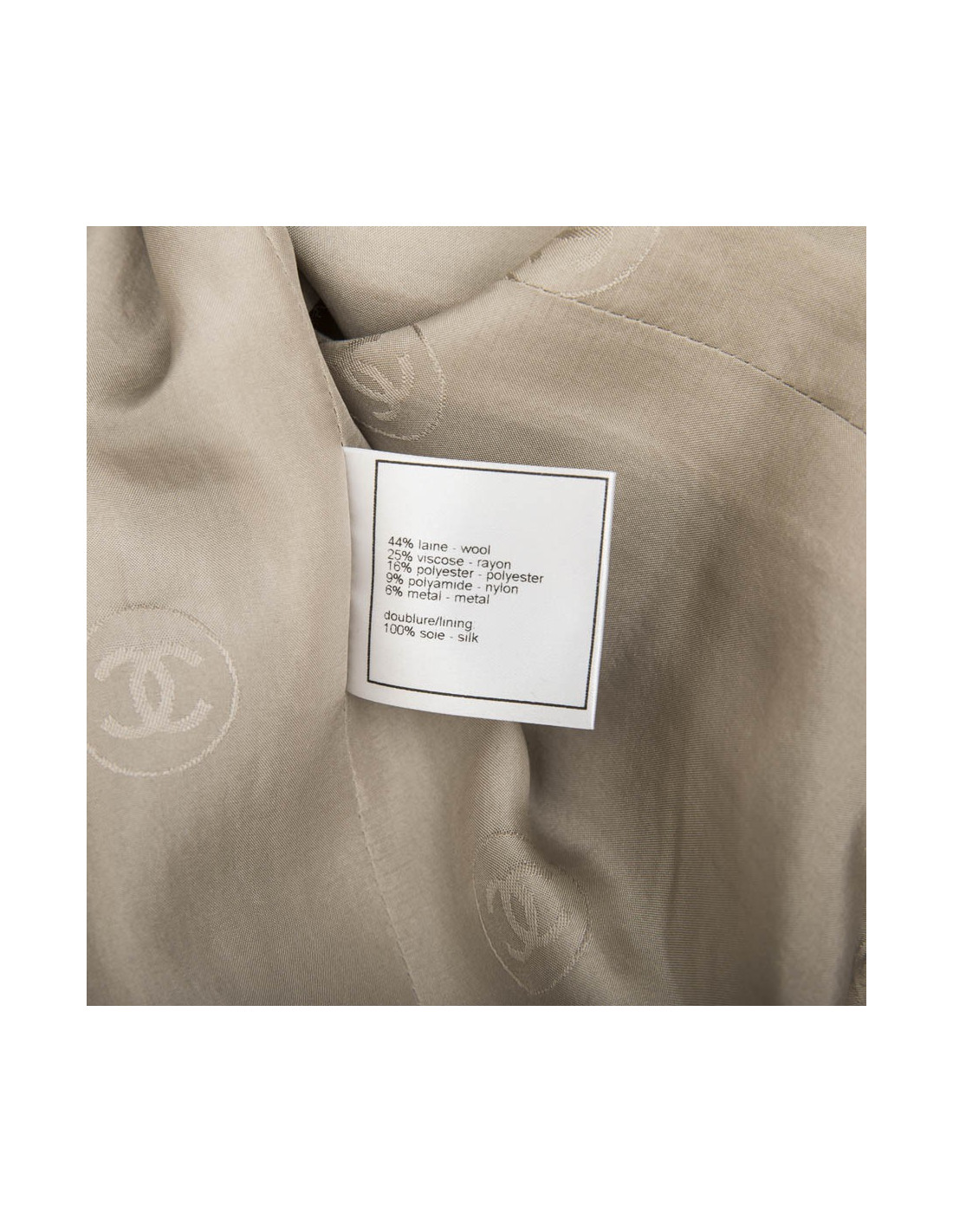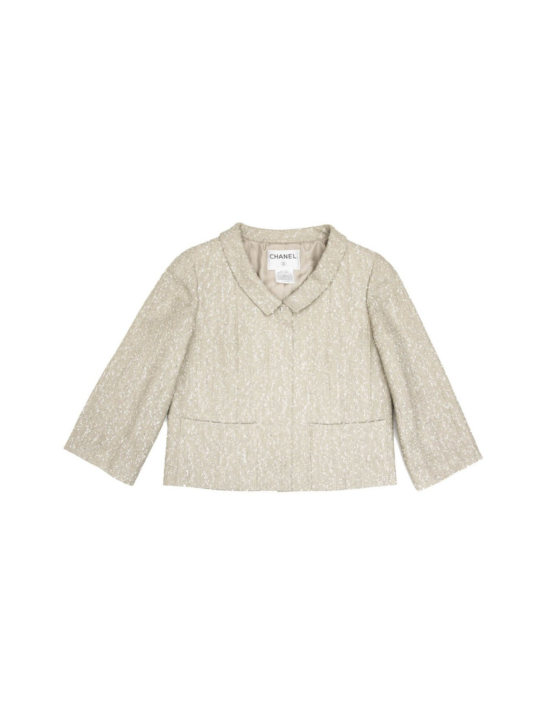 Ensemble veste et top de la maison Chanel dans les tons vert/Beige et fils d'argent. La veste se ferme grâce à un bouton pression avec le logo "CC" au niveau du col claudine.