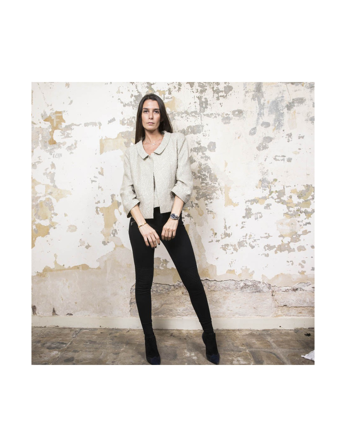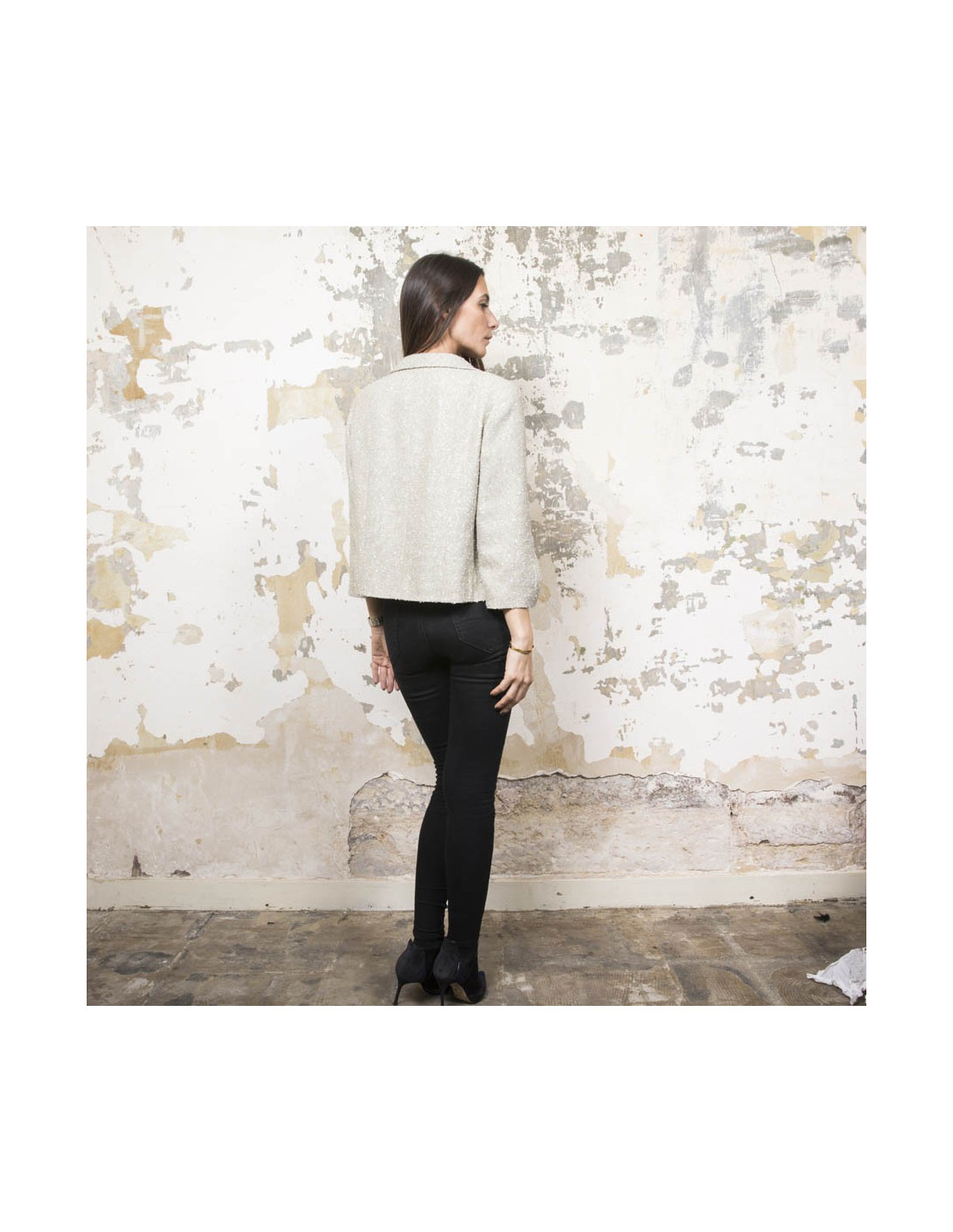Mesures à plat de la veste : largeur des épaules 38 cm, sous les aisselles 46 cm. Hauteur totale 51 cm, longueur des manches 47 cm