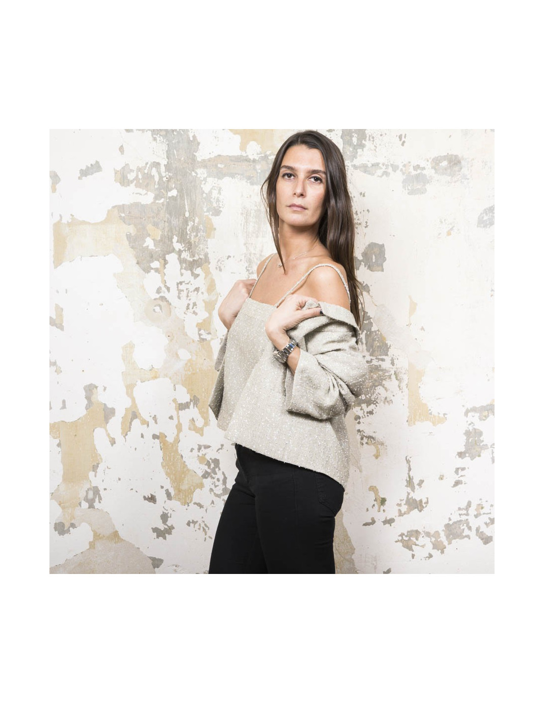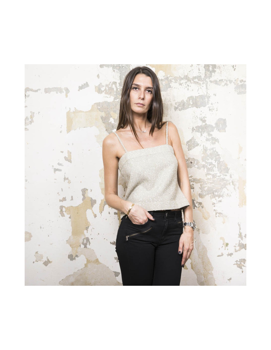 Mesure à plat du top : largeur sous les aisselles 42 cm, ampleur du bas 45 cm, hauteur totale 31,5cm.