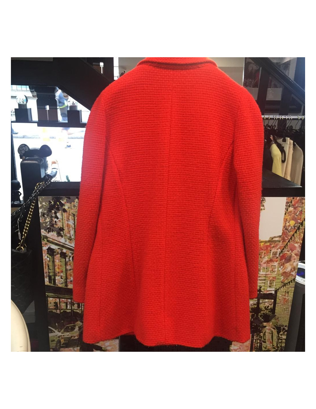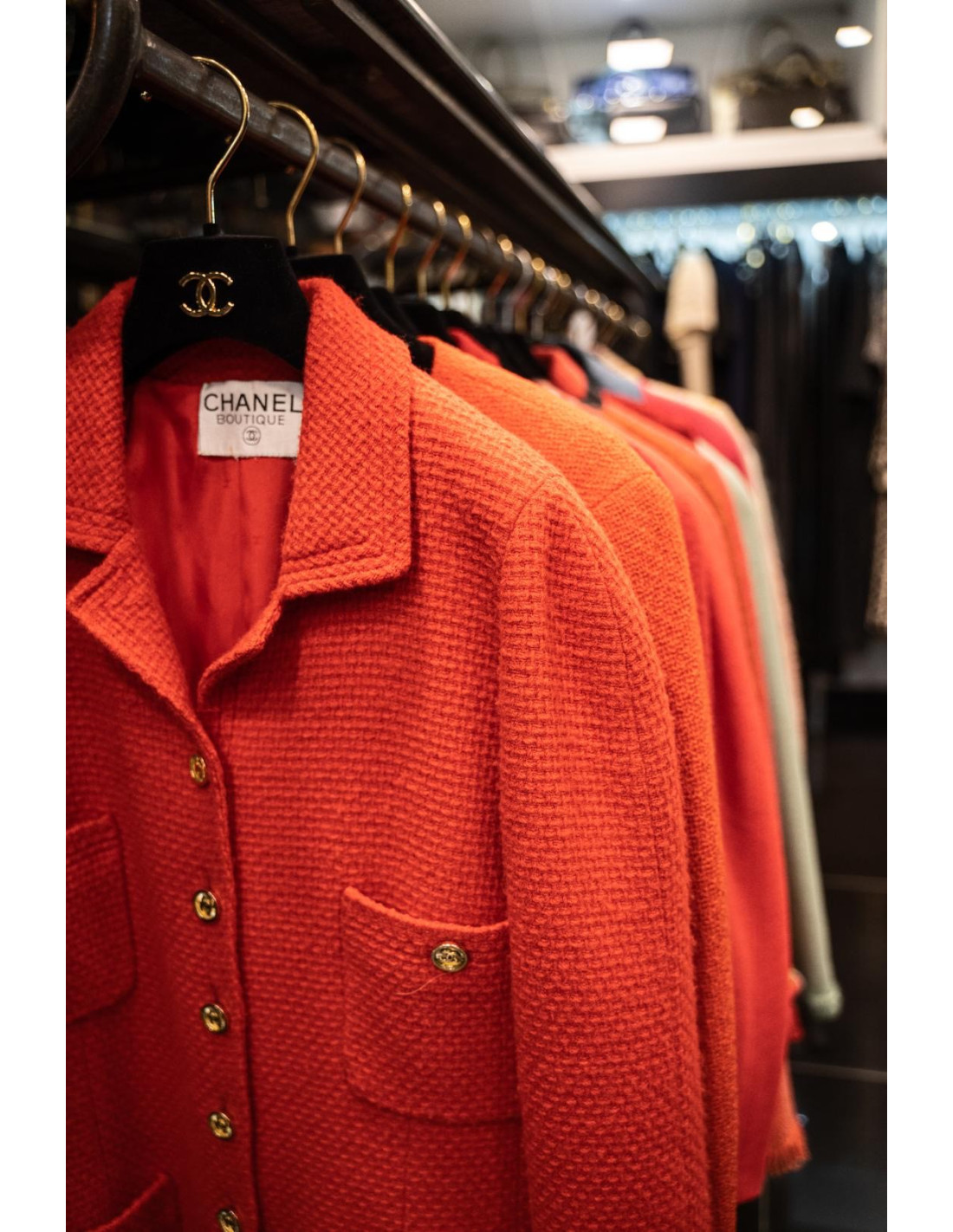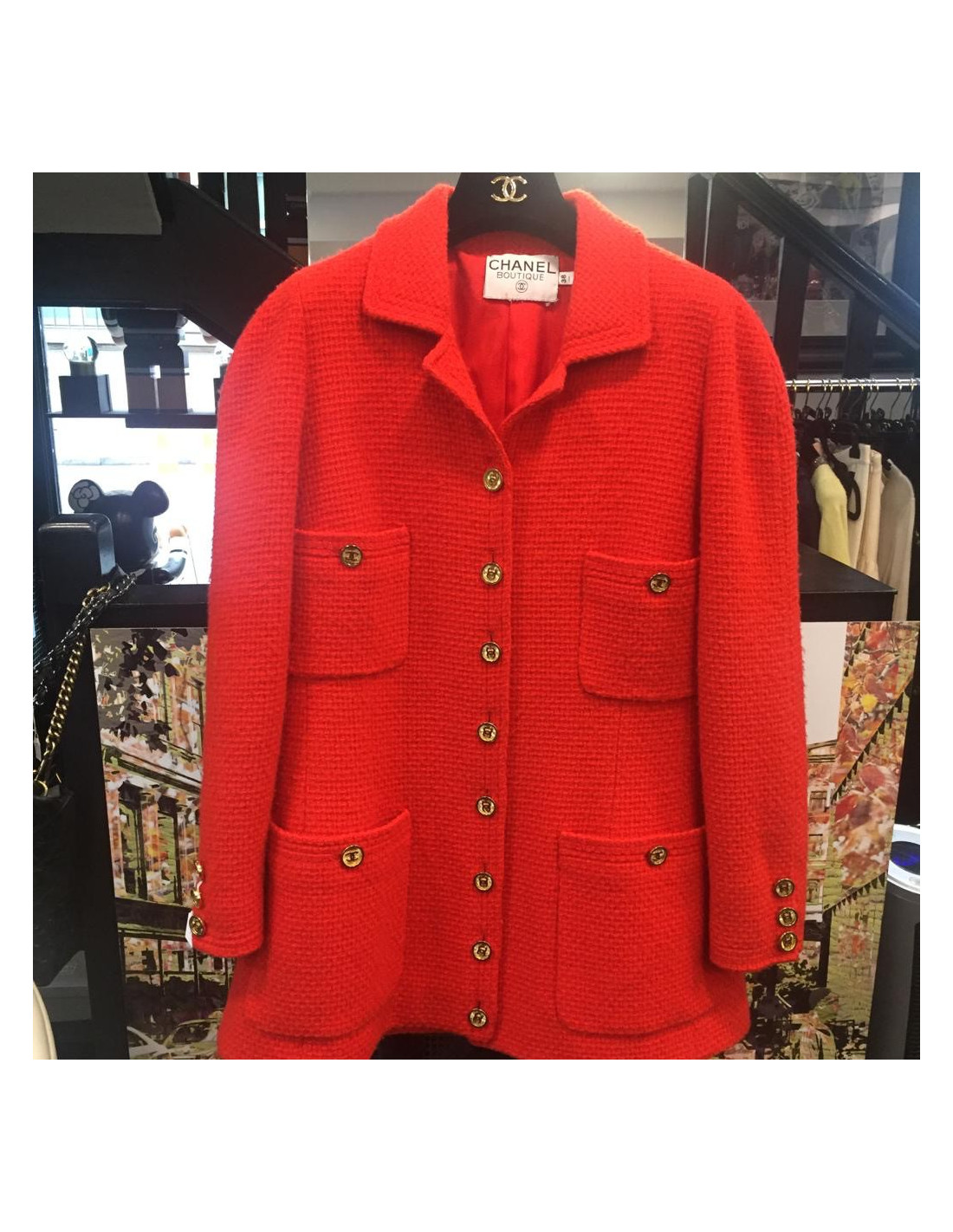 Vintage. En tweed rouge, cette veste longue date des années 90'. Les boutons sont dorés et signés à l'arrière "CHANEL". Elle se porte autant sur une tenue stricte que sur un jean. La doublure est en soie monogramme. Très bon état d'usage