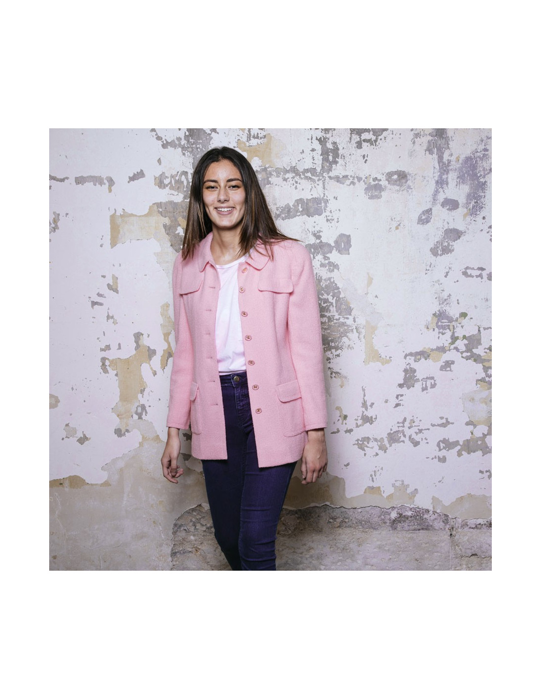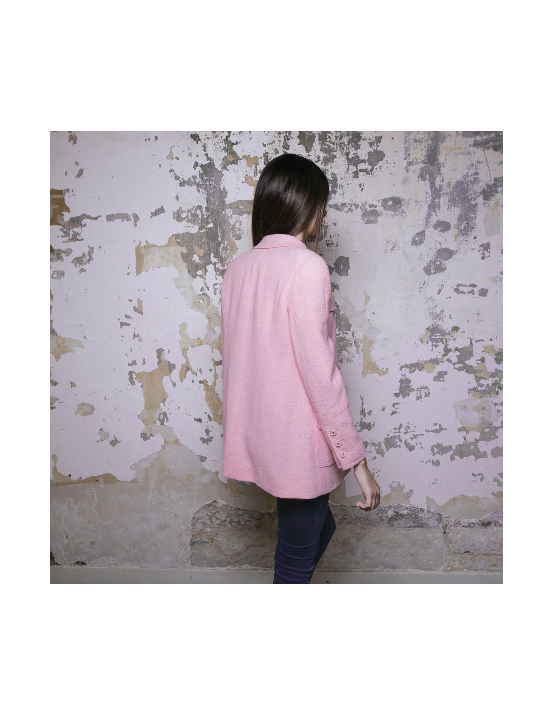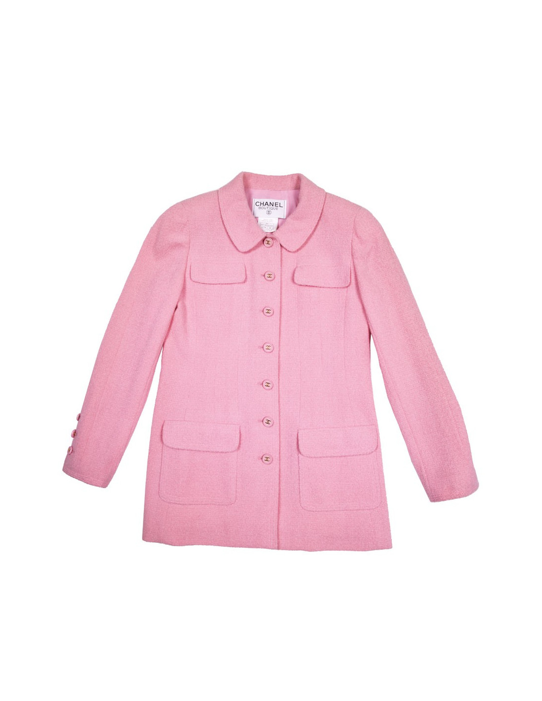 Veste Chanel en tweed en laine rose Collection Printemps-été 1997. Doublure en soie rose. Boutons roses avec signature CC dorée. Deux vraies poches sur le bas de la veste et deux fausses poches au niveau de la poitrine.