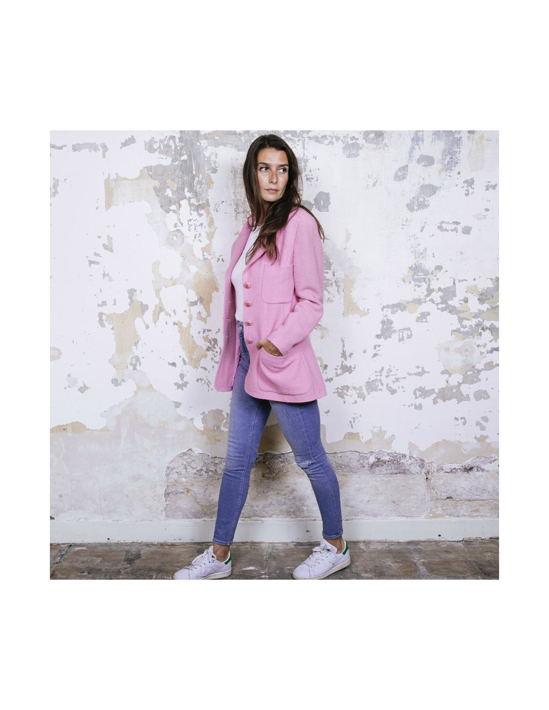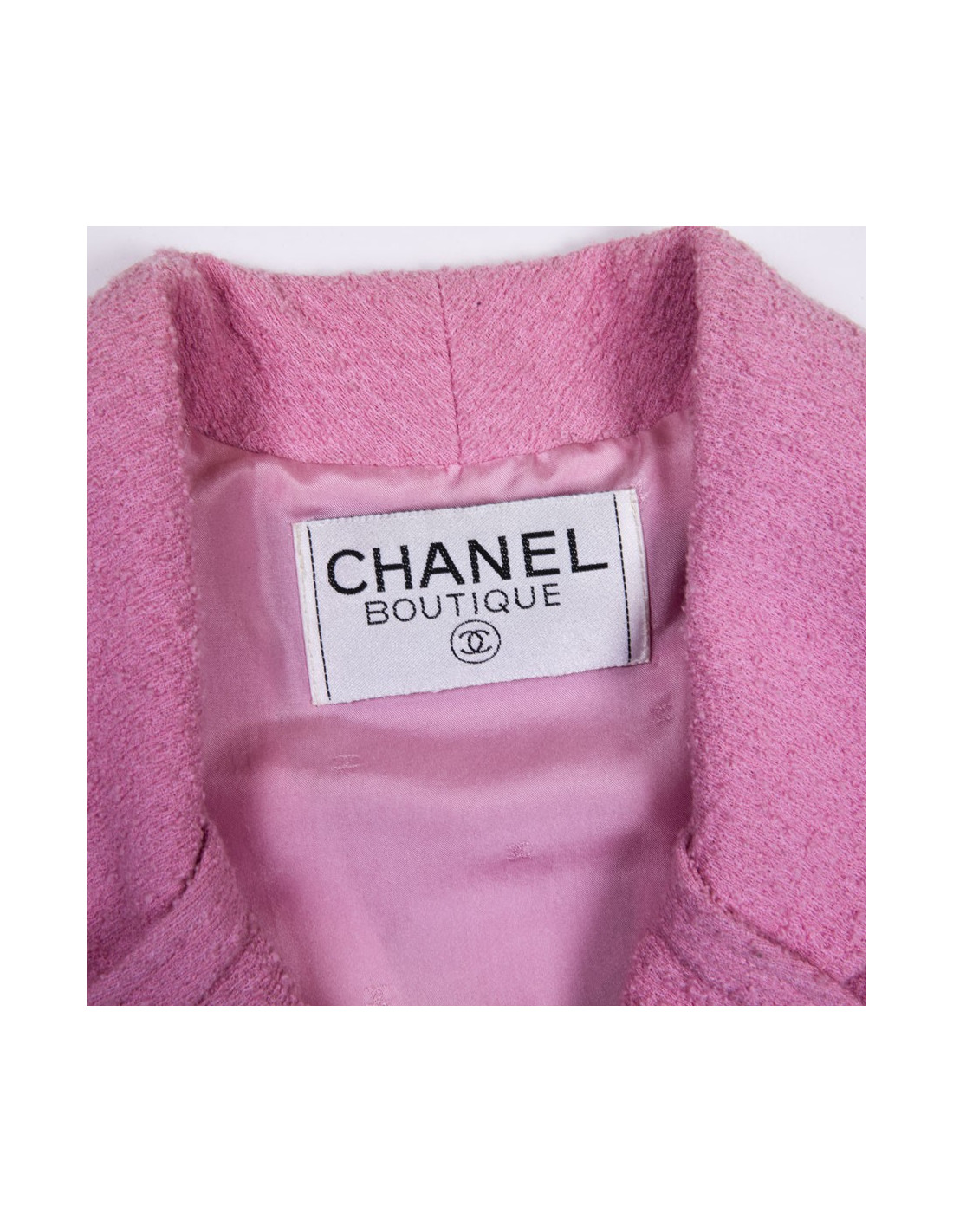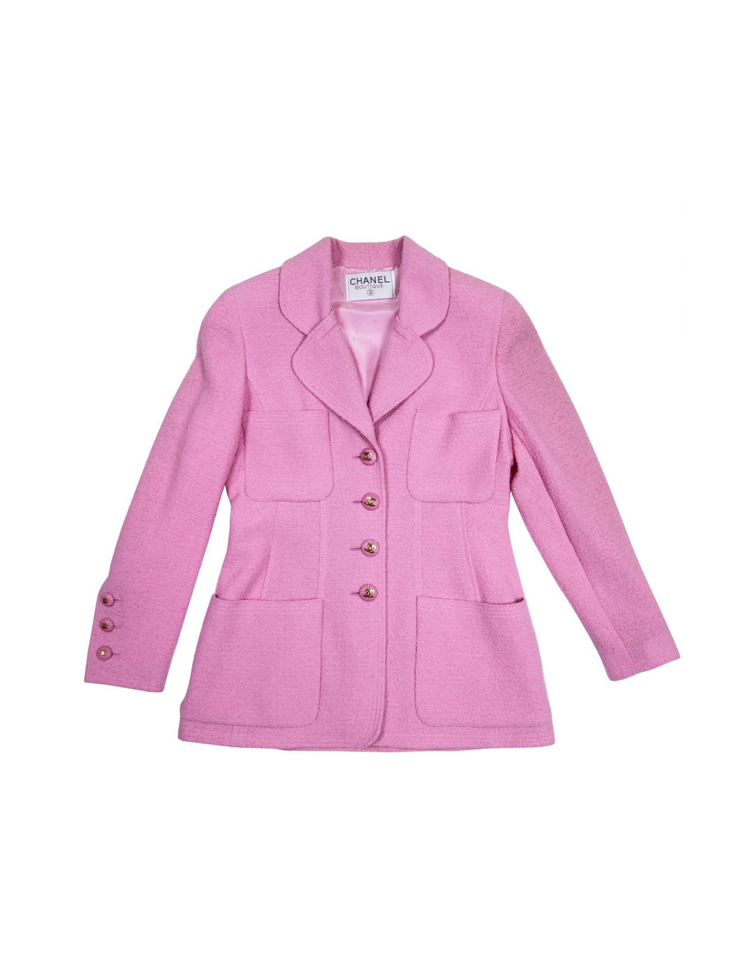 Veste Chanel en tweed en laine rose. Doublure en soie rose. Boutons roses avec signature CC dorée. Quatre poches plates.