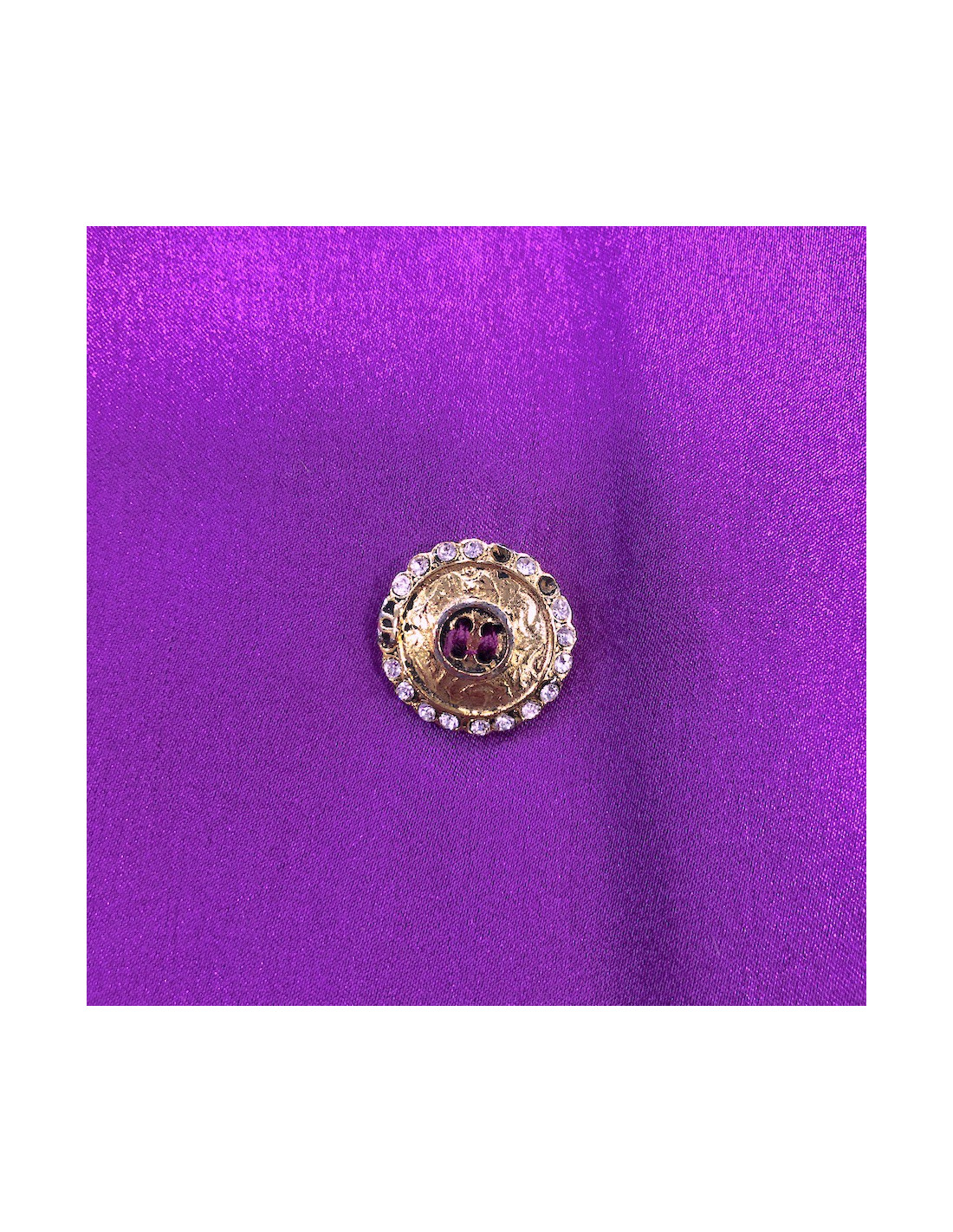 Vintage. Veste CHANEL croisée en soie violette non doublée T38. Elle peut se porter sur un top ou directement en tant que blouse, avec fermeture par 4 boutons dorés siglés CC sertis de strass. Il y a 2 poches à l'avant. Elle est en très bon état malgré quelques petits strass manquants et deux traits de quelques millimètres noirs à l'avant, très peu visibles.