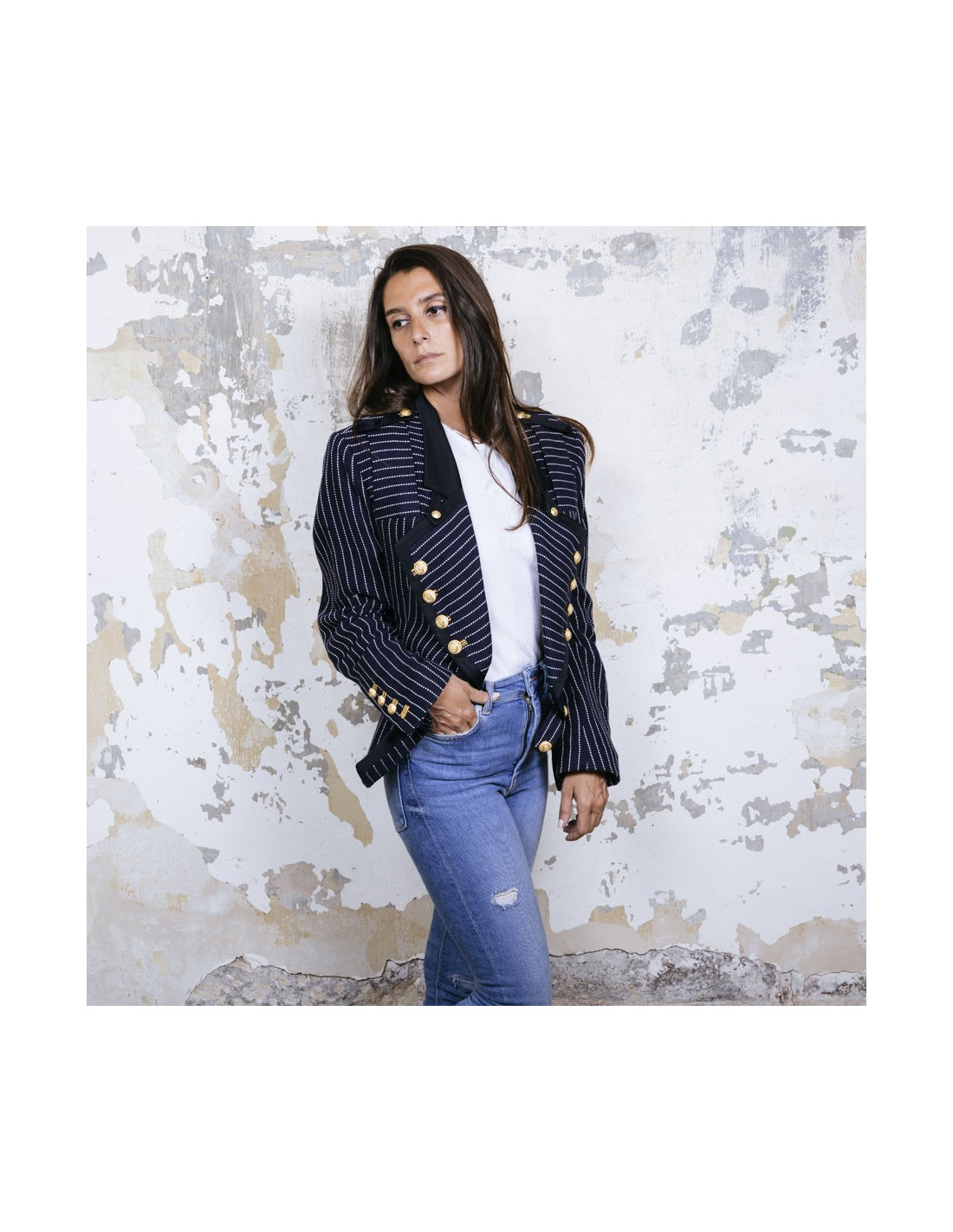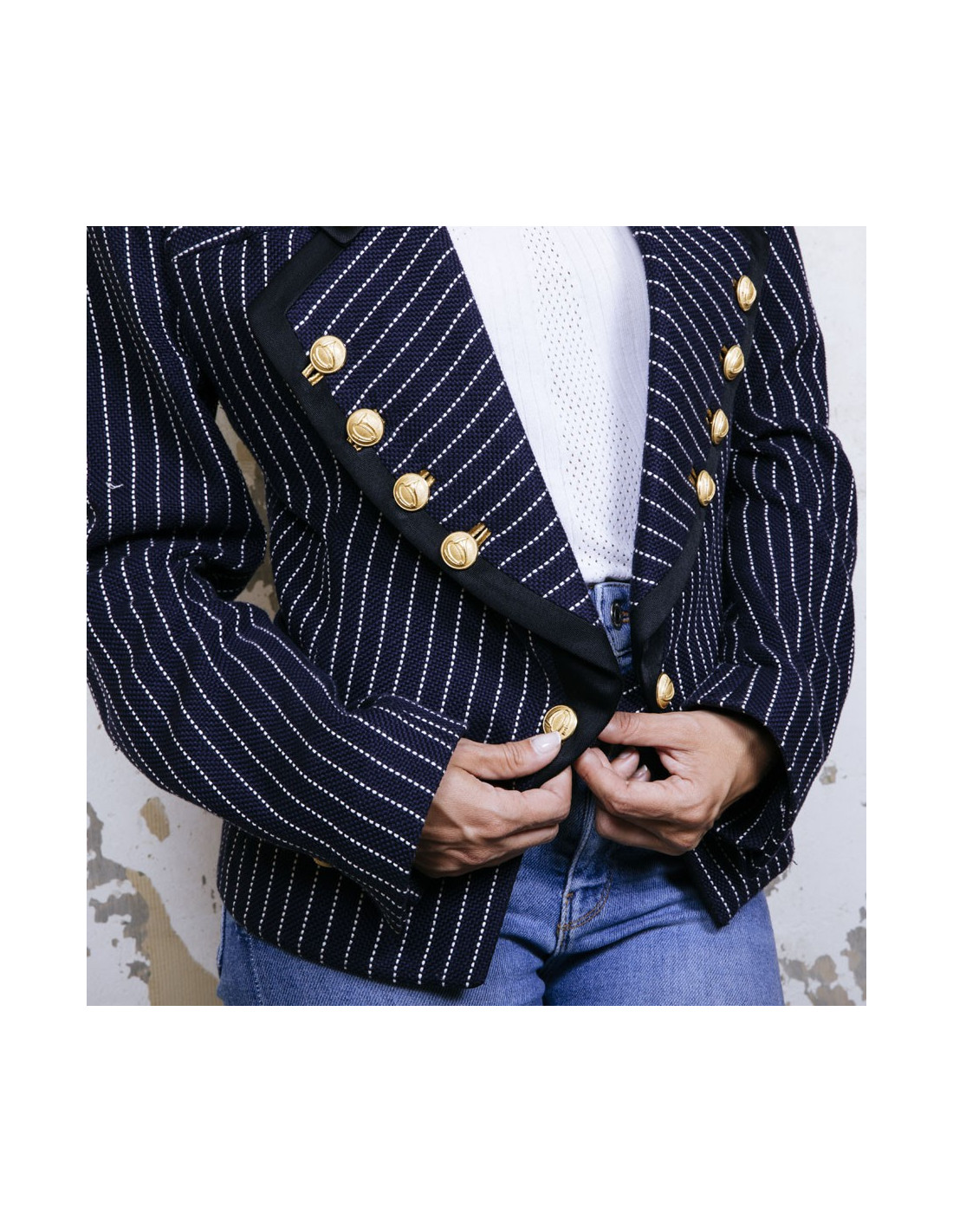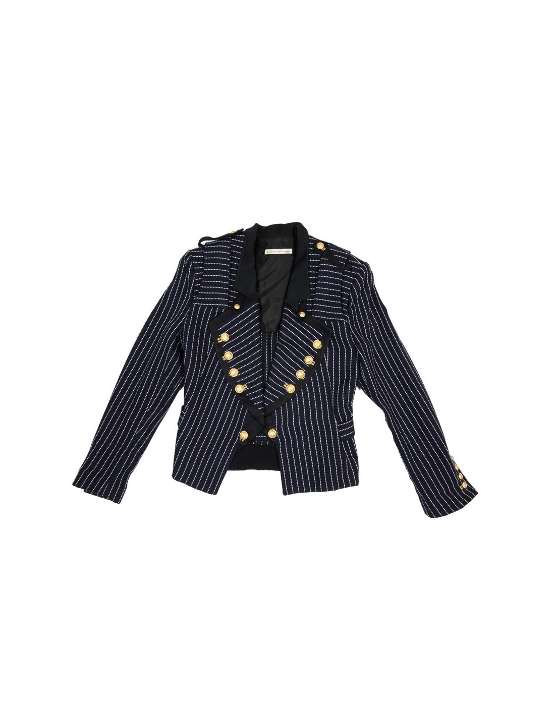 Veste Balenciaga en coton bleu marine à rayures blanches. Col et bordures noirs. Boutons dorés. Fermeture par bouton. Galon sur les épaules. Taille 42. Doublure en soie. Manque un bouton sur la manche.