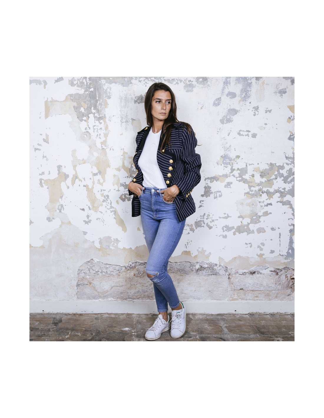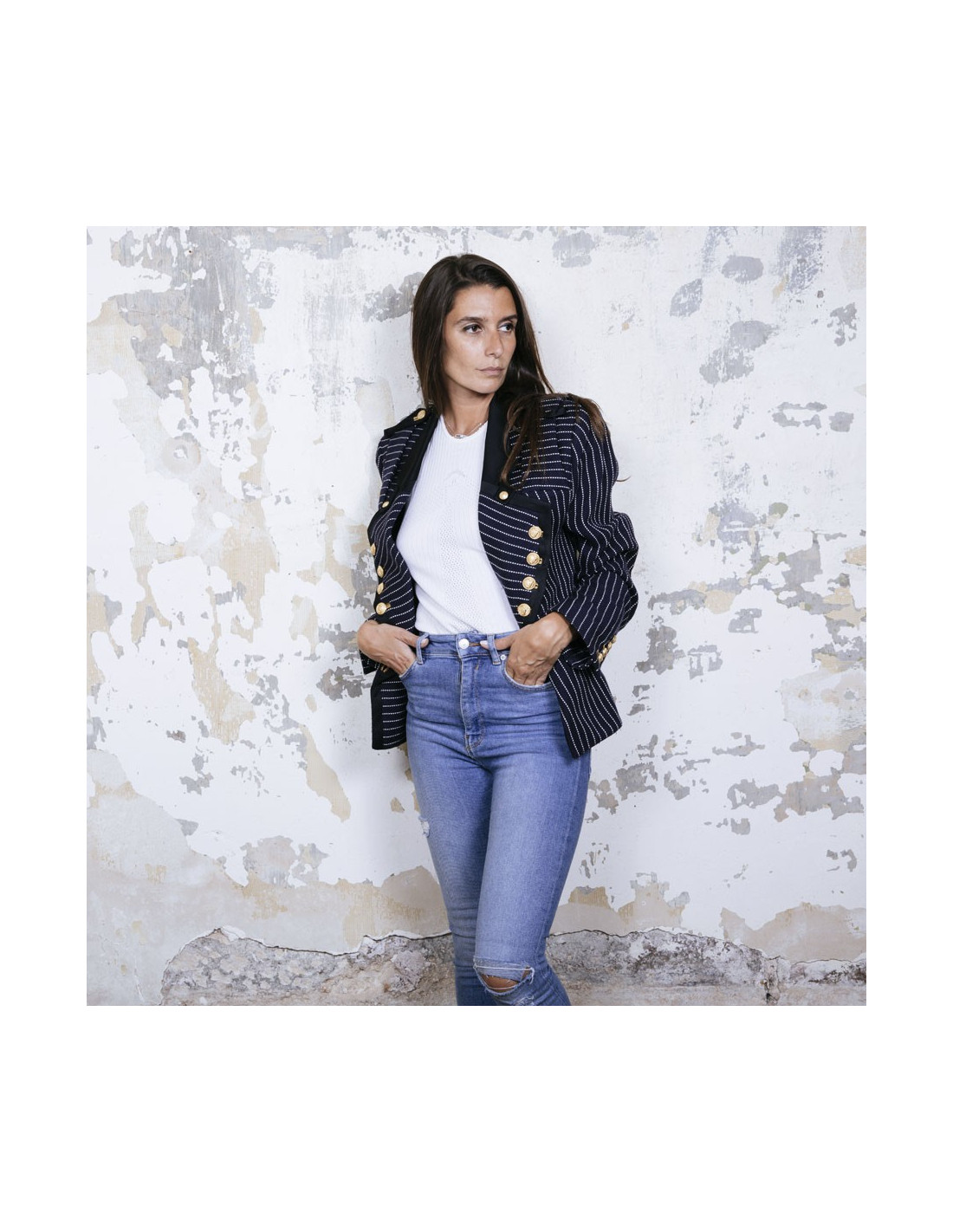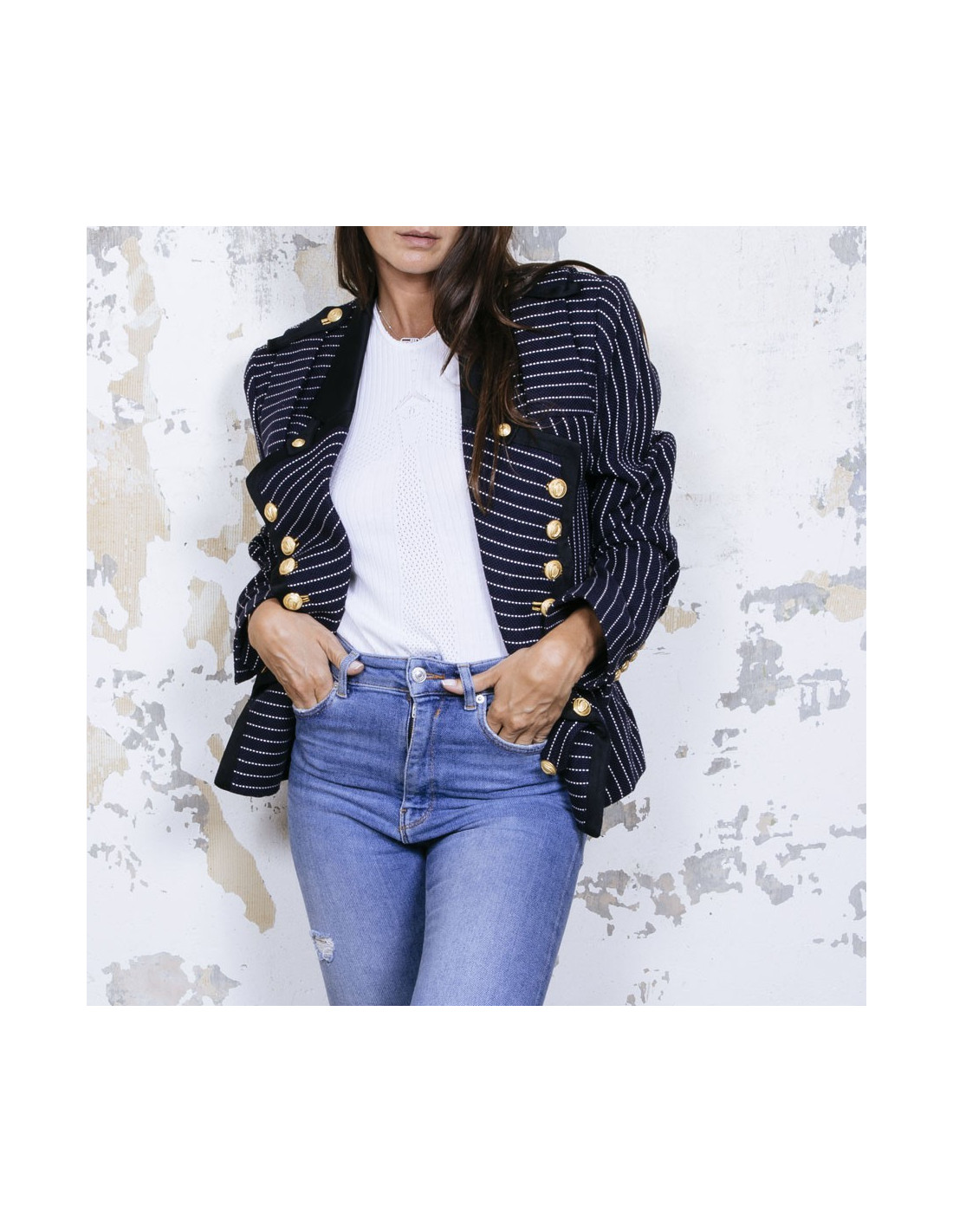 Veste Balenciaga en coton bleu marine à rayures blanches. Col et bordures noirs. Boutons dorés. Fermeture par bouton. Galon sur les épaules. Taille 42. Doublure en soie. Manque un bouton sur la manche.