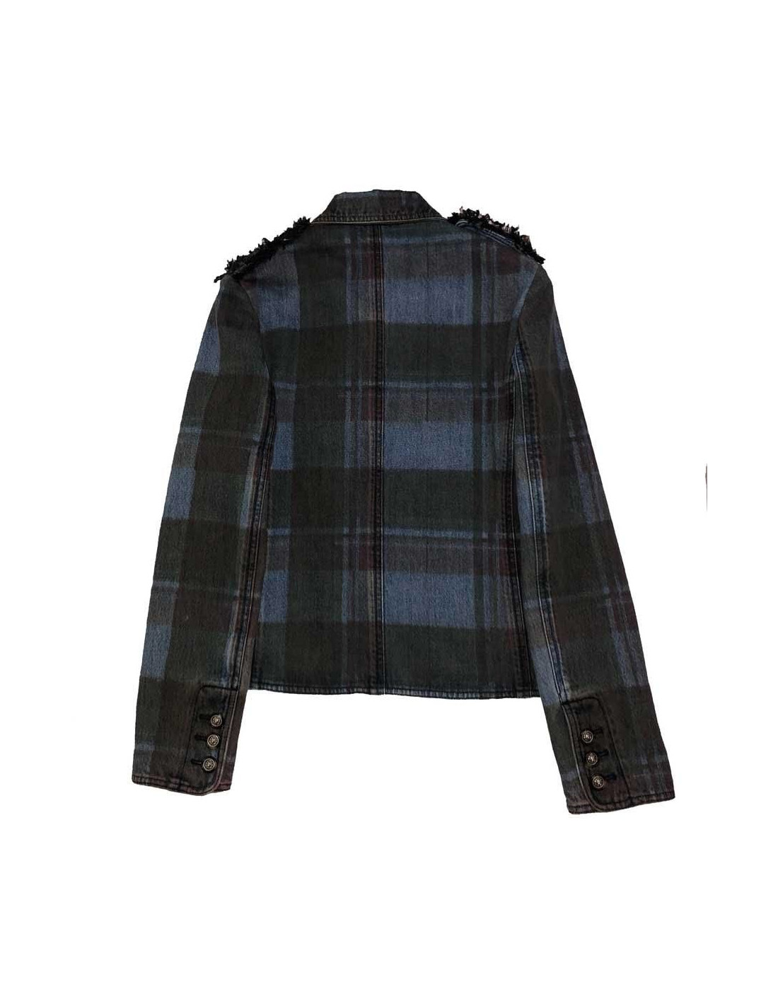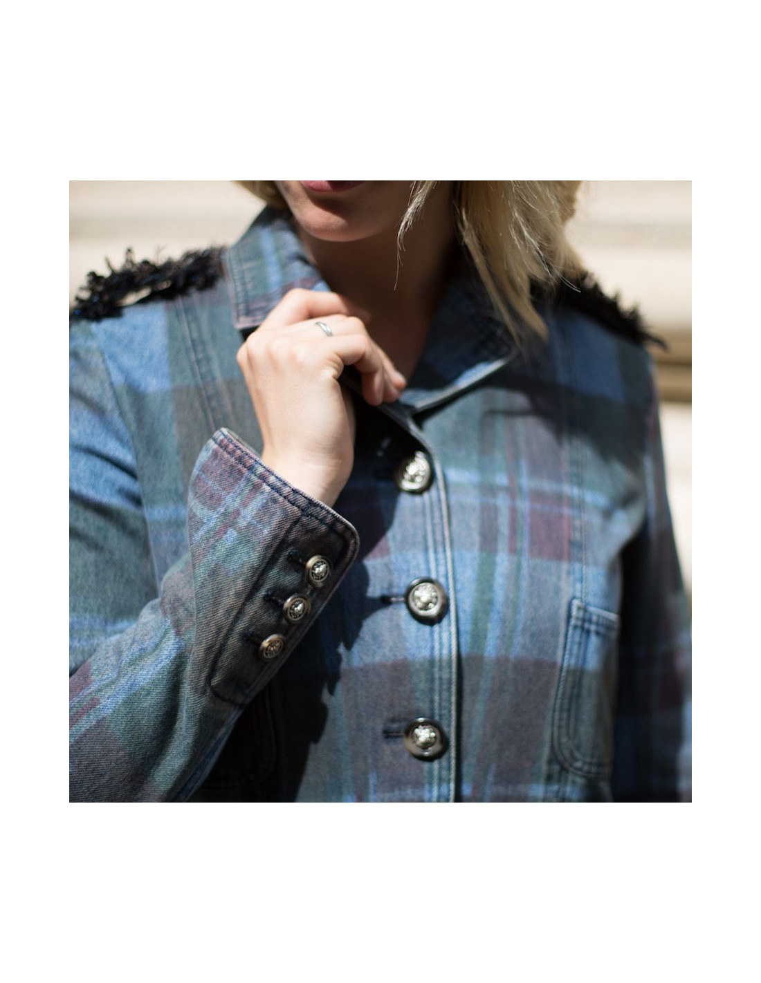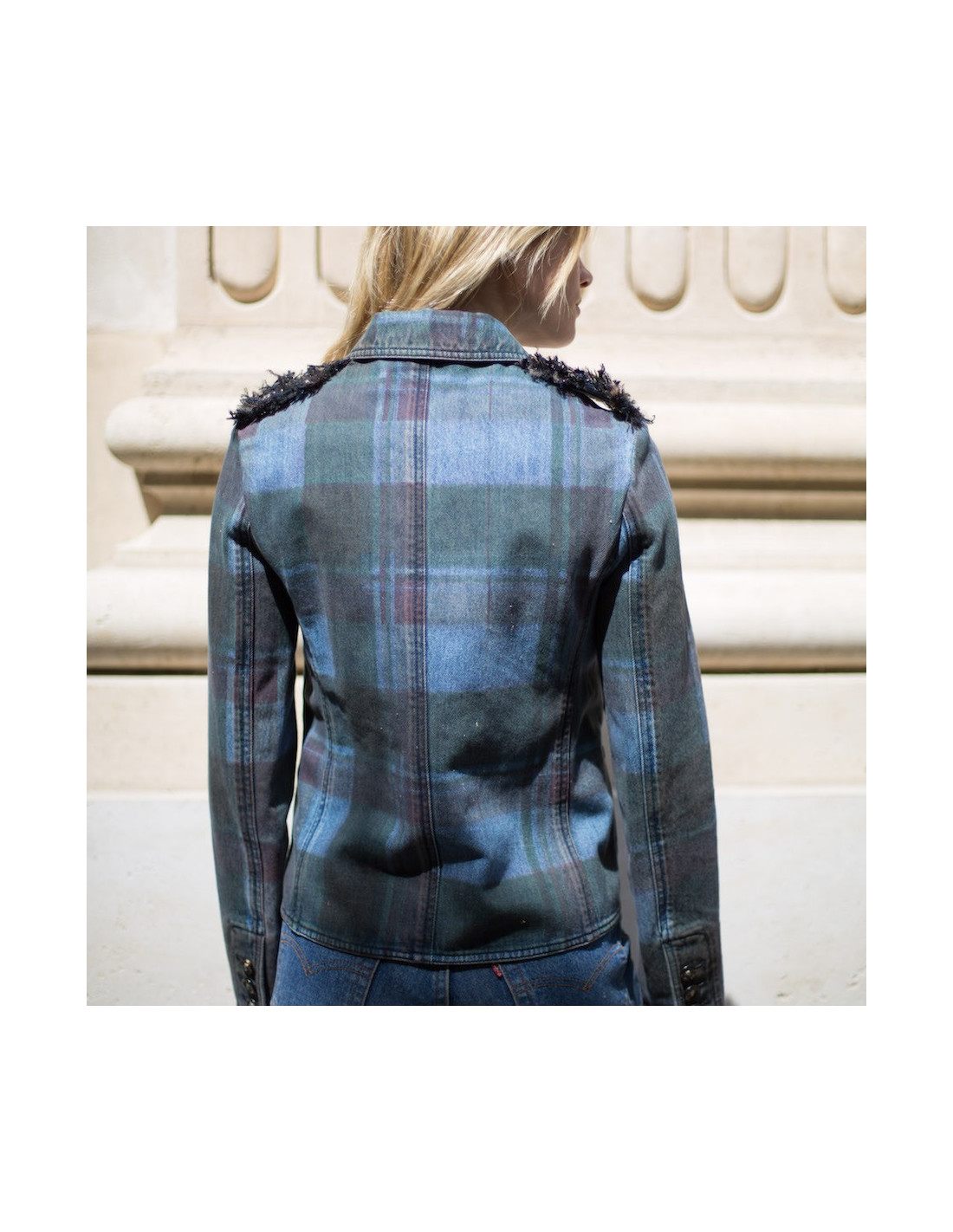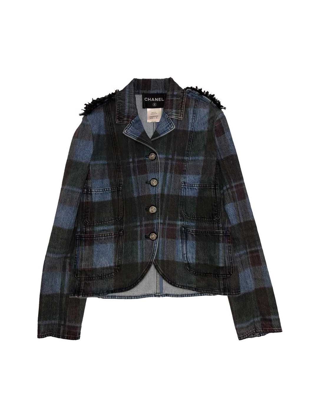 Une des plus belles collections Pre-Fall, PARIS-EDINBOURG 2013, créée par Karl Lagerfeld pour CHANEL, ce génie de la mode qui a su moderniser les vêtements de la Maison Chanel. Il a imaginé une collection en hommage à l'histoire de Gabrielle Chanel et du Duke de Westminster. Aussi, avait-il 6 ans lorsqu'il a lu l'histoire de la Reine d'Ecosse Mary, qui a eu un destin tragique. Tout cela a contribué à une très belle inspiration. Veste en coton, motifs tartans dans les tons bleu et marron. Afin de personnaliser sa collection, il y a ajouté son tissu favori, le tweed. Des lanières sont ajoutées sur les épaules, fermées par des boutons façon écaille de tortue et surmontés de la tête de lion, signe astrologique de Coco Chanel. Fermeture à l'avant par quatre boutons et les poignets sont également fermées par trois boutons. Il y a quatre poches plaquées. Elle est en très bon état.