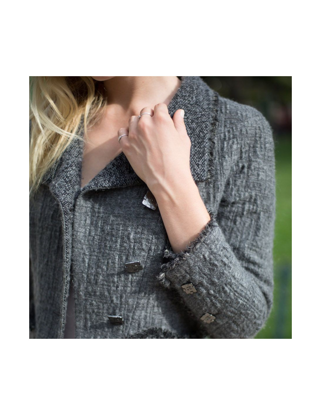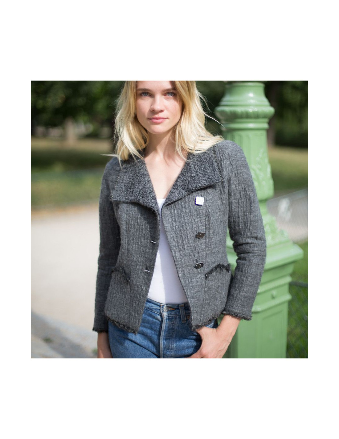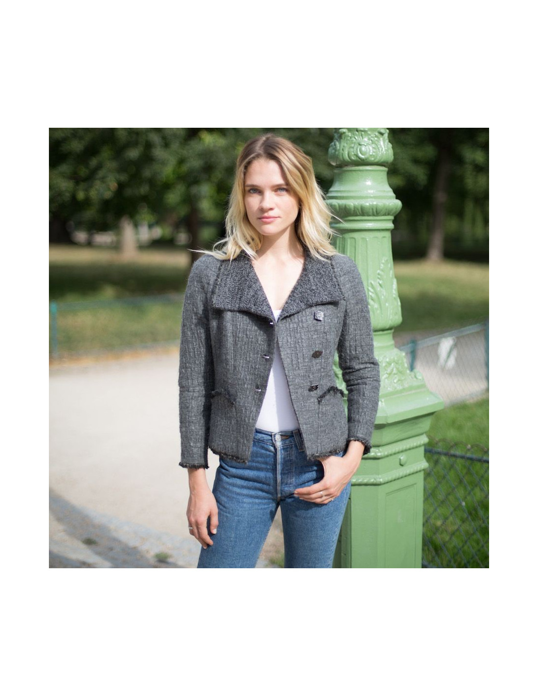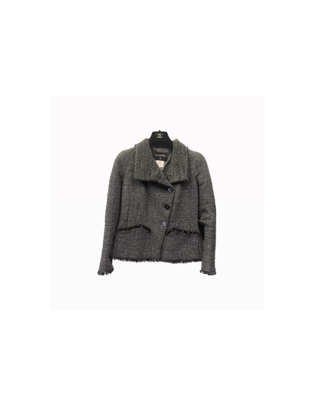 Veste CHANEL à manches raglan, très structurée et resserrée à la taille. Elle est issue de la collection Automne-Hiver 2011/2012, idéale pour affronter les températures d'hiver tout en restant tendance. Elle est en tweed gris et se ferme par 4 boutons carrés en métal argenté vieilli siglés "CC" (absence d'un bouton au niveau du col). L'encolure est en tweed gris foncé, laine et cachemire, frangé tout comme les deux poches avant et les poignets. La doublure est en soie grise imprimée de "CC" et de camélias avec une chaîne argentée sur le bas de la veste. Elle est en très bon état.