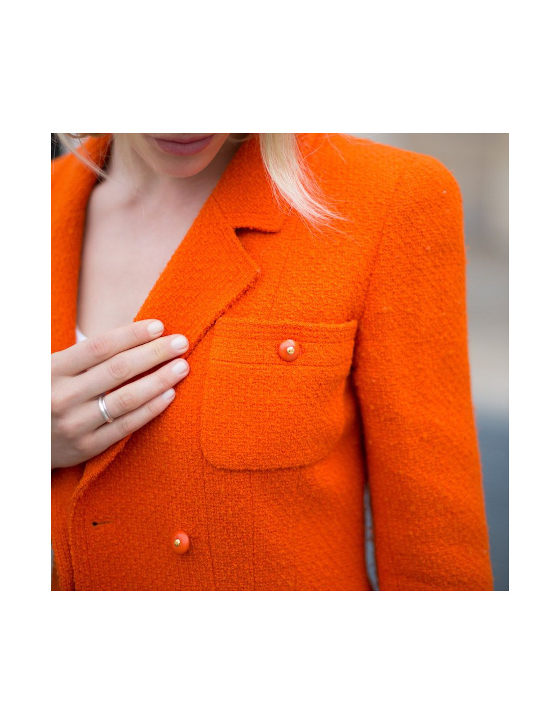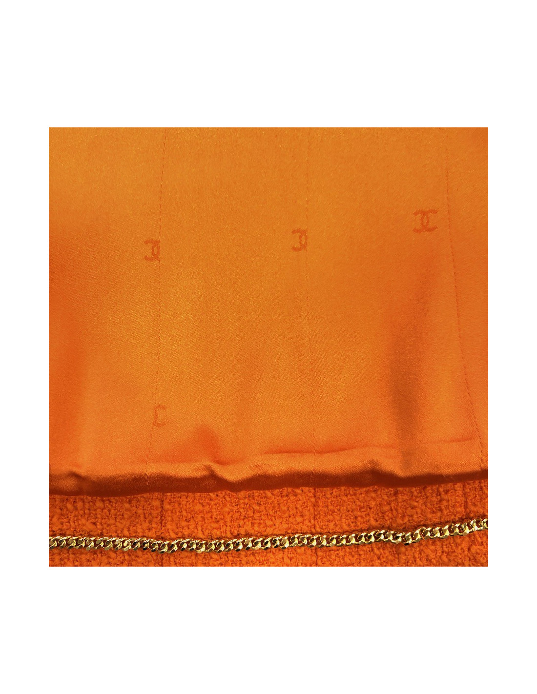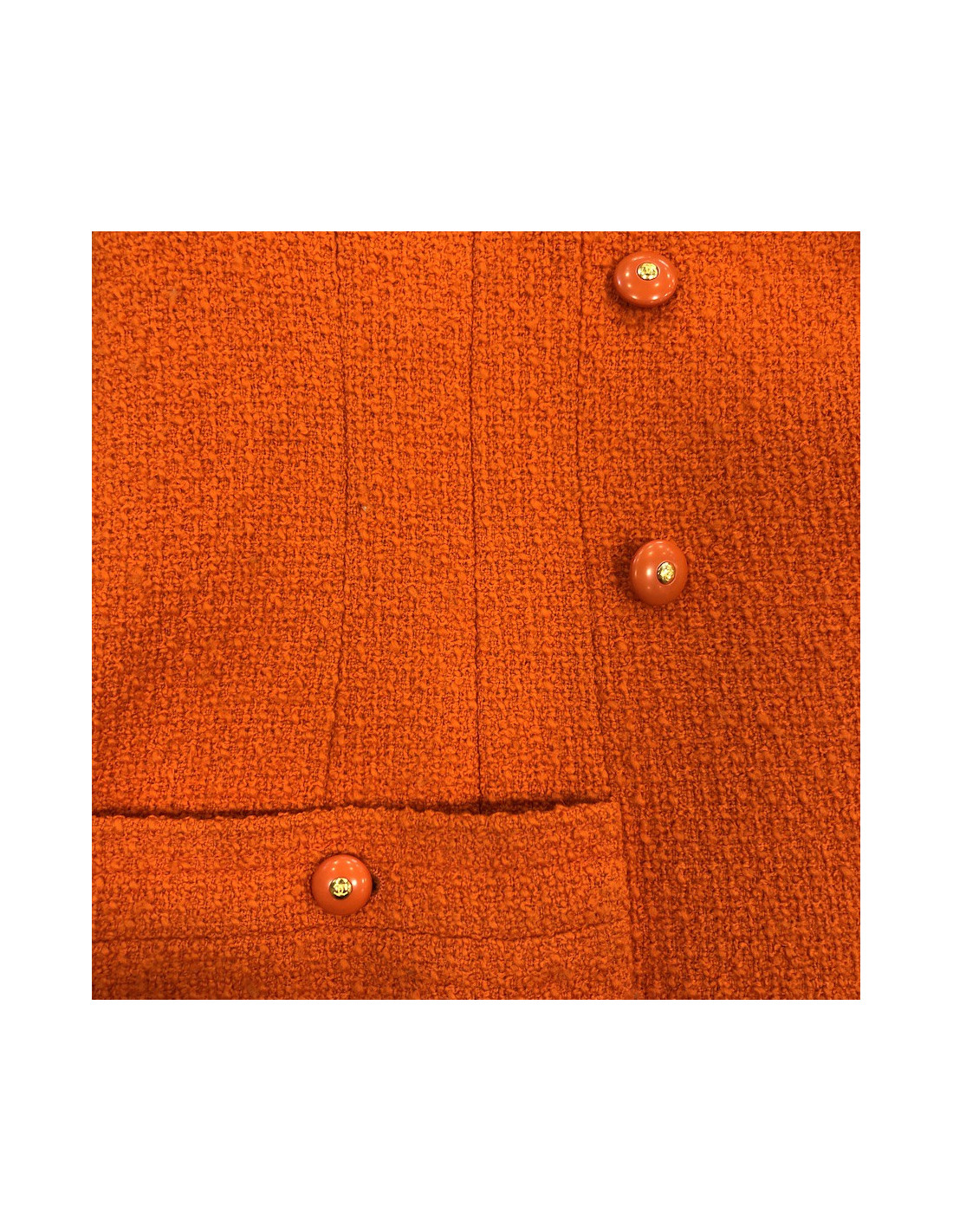 MYTHIQUE. Cette charmante veste T38 CHANEL en tweed corail provient de la Collection Automne/Hiver 1995-1996. Il y a les 4 poches iconiques des vestes CHANEL, qui se ferment par des boutons oranges siglés "CC" ( à l'arrière signature Chanel). La doublure (légèrement marquée sous les aisselles) est imprimée de "CC" avec une chaine dorée sur le bas de la veste. Elle est en très bon état malgré quelques traces d'usure sur le tweed sous les aisselles, invisibles quand la veste est portée.