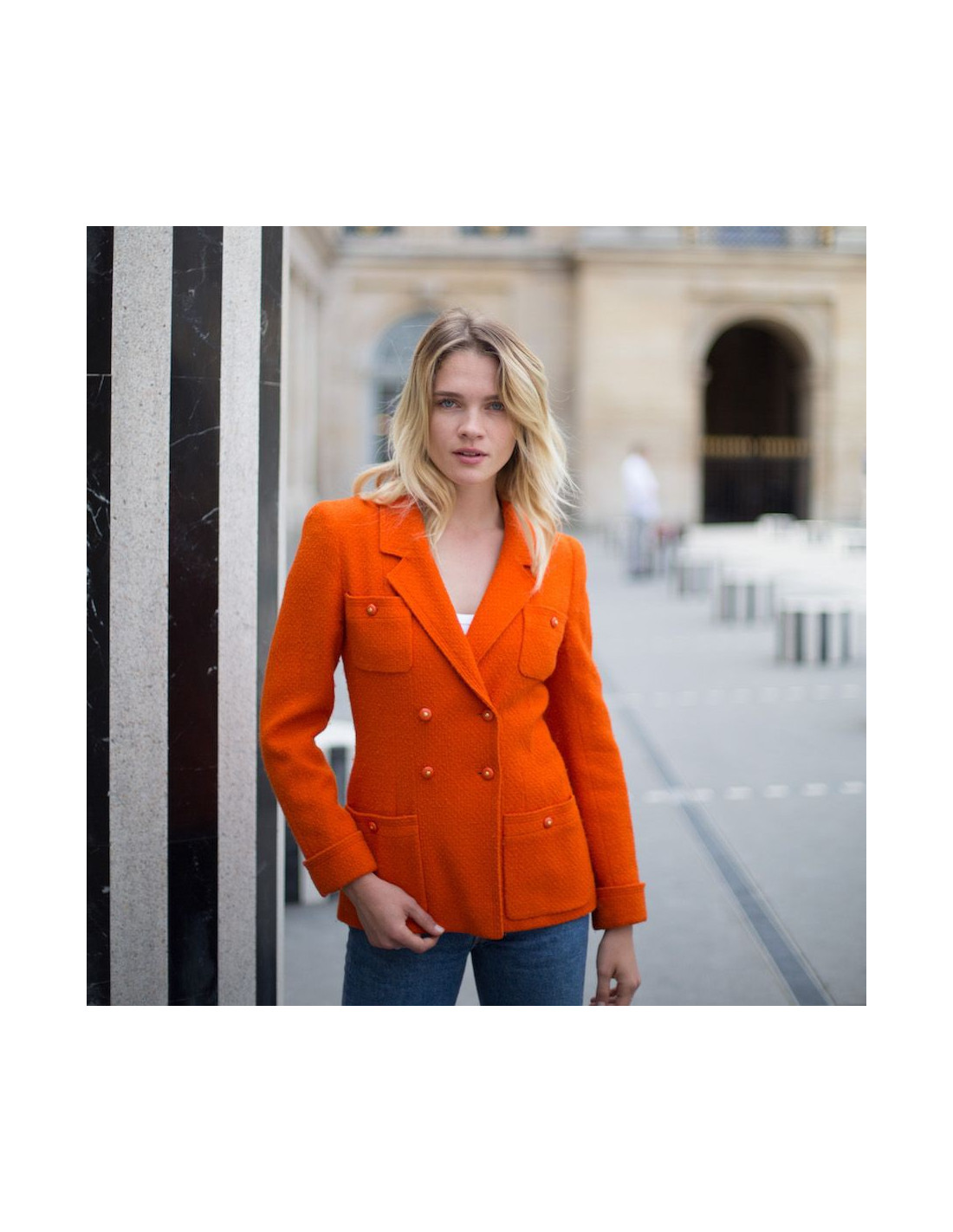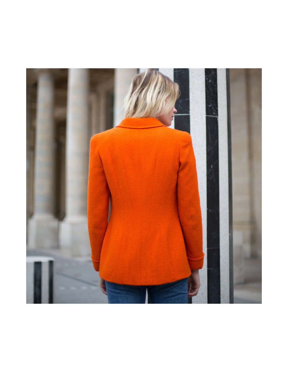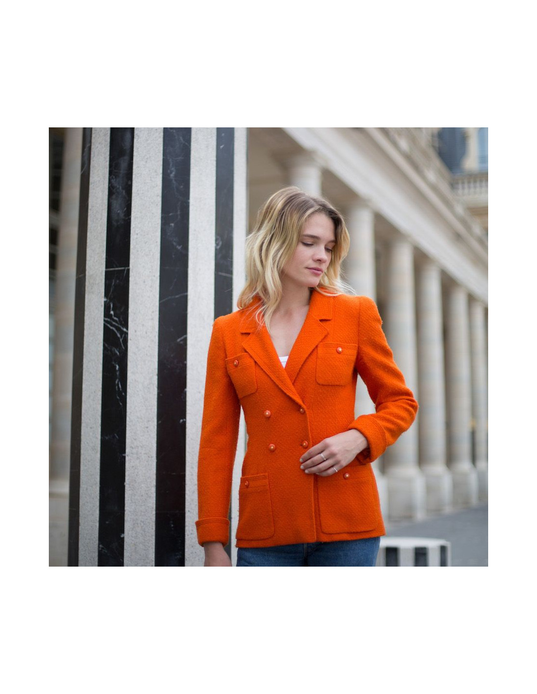 MYTHIQUE. Cette charmante veste T38 CHANEL en tweed corail provient de la Collection Automne/Hiver 1995-1996. Il y a les 4 poches iconiques des vestes CHANEL, qui se ferment par des boutons oranges siglés "CC" ( à l'arrière signature Chanel). La doublure (légèrement marquée sous les aisselles) est imprimée de "CC" avec une chaine dorée sur le bas de la veste. Elle est en très bon état malgré quelques traces d'usure sur le tweed sous les aisselles, invisibles quand la veste est portée.