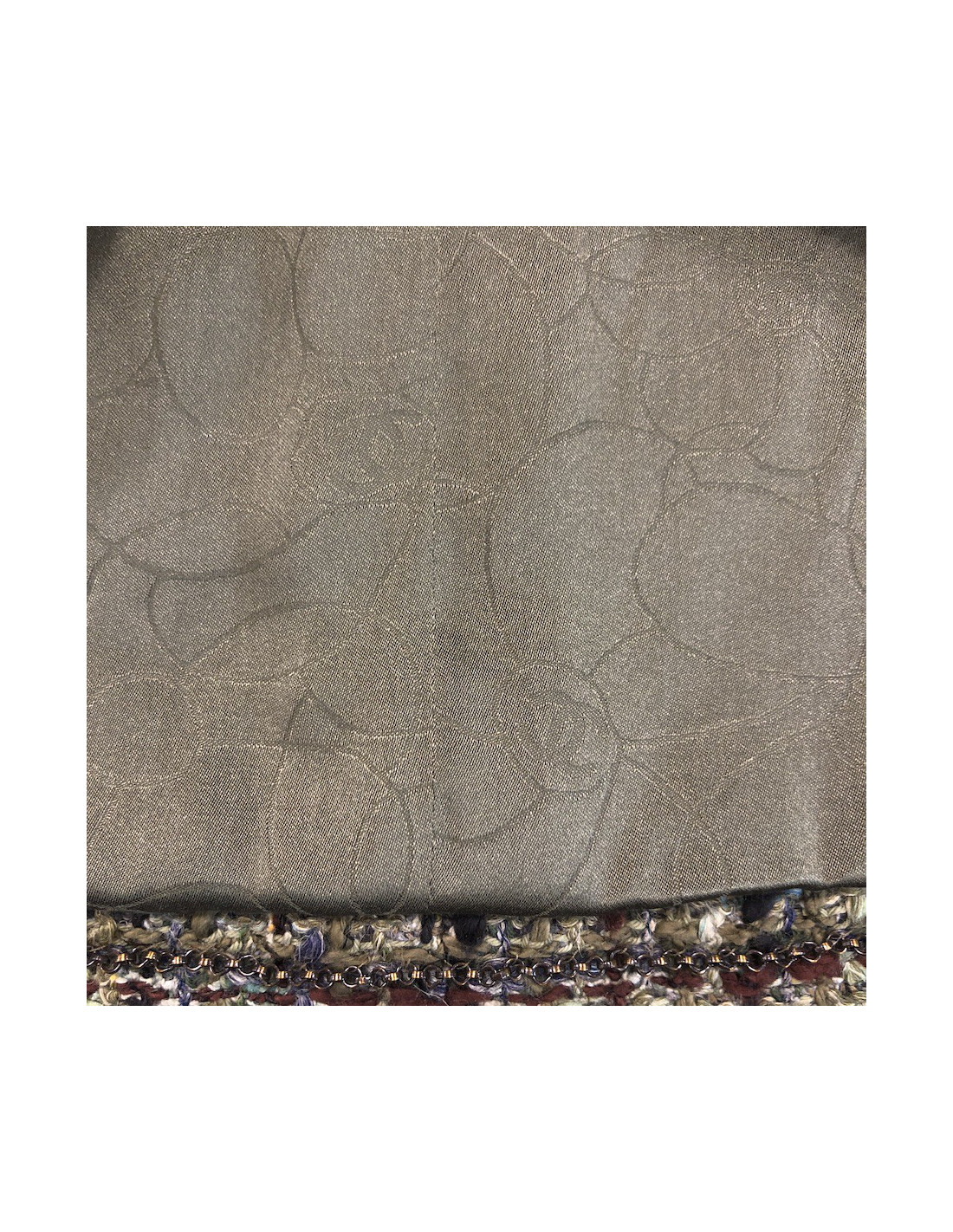 Quatre poches sont visibles à l'avant. La doublure est en soie verte siglée de "CC" et camélias, les signes emblématiques de la marque. Le détail qui fait tout : la chaine cousue tout le long du bas de la doublure intérieure. Elle est près du corps et se ferme à l'aide de 3 boutons pression et un bouton "CHANEL PARIS". La couleur prédominante est le vert kaki.