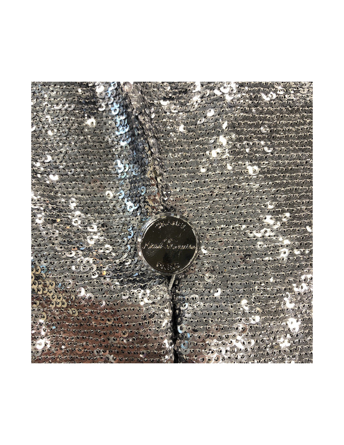 Très belle pièce CHANEL du défilé Croisière Paris-Miami en 2009. Blazer entièrement brodée de sequins argent, doublée de soie noire monogramme camélia. Karl Lagerfeld disait " La veste Chanel ne passe jamais de mode, c’est son côté intemporel qui lui assure sa modernité", celle-ci en est la preuve. Avec deux poches plates et une poche fente sur la poitrine, elle se ferme par un unique bouton signé "CHANEL Paris Miami Cruise". Sur chaque poignet, il y a un revers noir. Elle est en très bon état. Lors du défilé, elle a été portée par un mannequin homme. Pour information, le prix public de cette veste était 5700 e.
