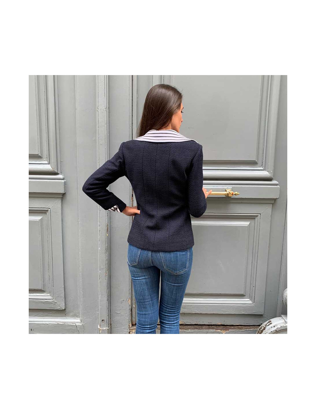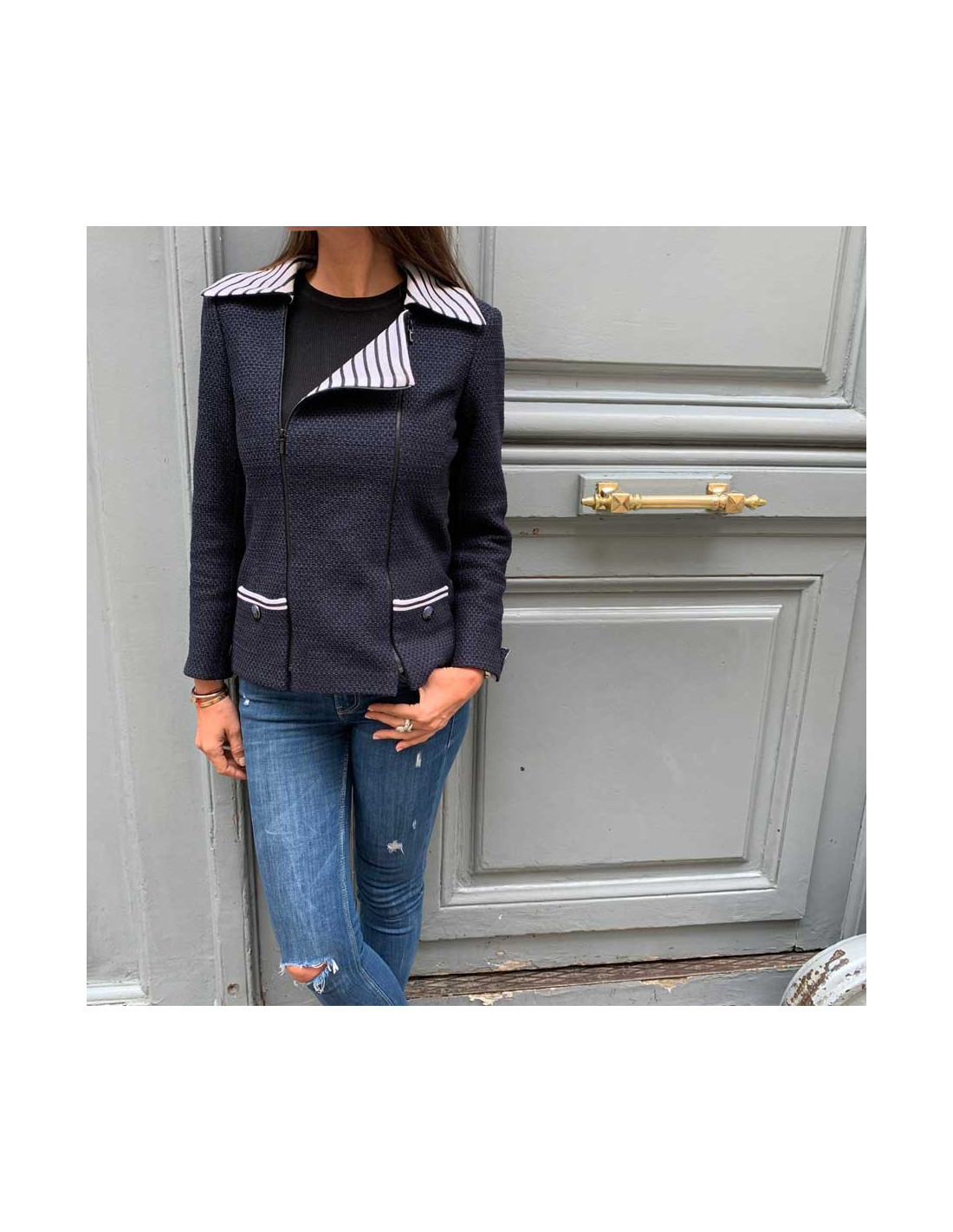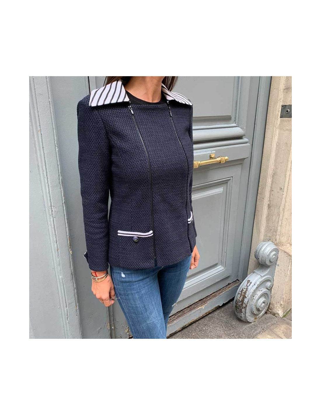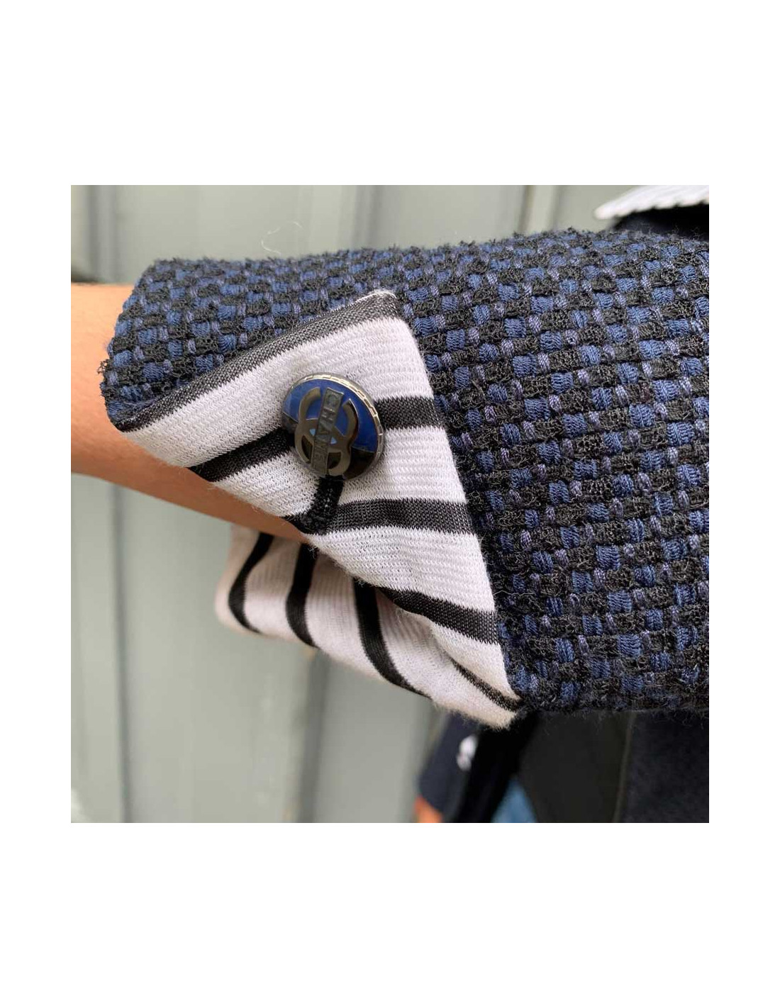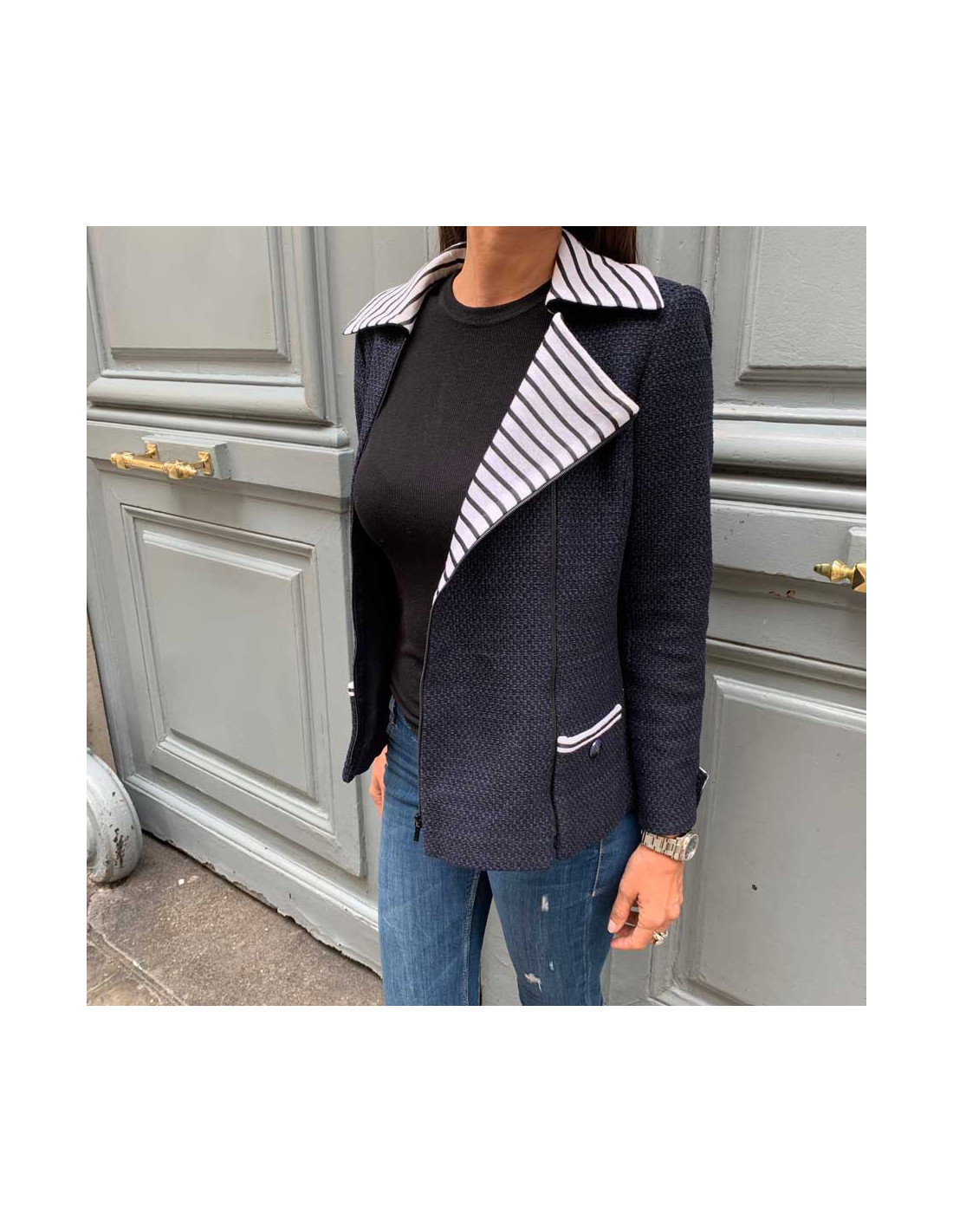 Ravissante veste Chanel T 36, en tweed bleu et noir, avec un panneau amovible, par fermeture éclair noire à l'avant. Les col ainsi que les poignets sont en coton rayé blanc et noir. La doublure siglée est en 100% soie bleue . Elle a son incontournable chaine argent tout autour du bas de la veste. Agréable à porter sur un jean's et un t-shirt blanc. Collection 2017. Elle n'a jamais été portée.