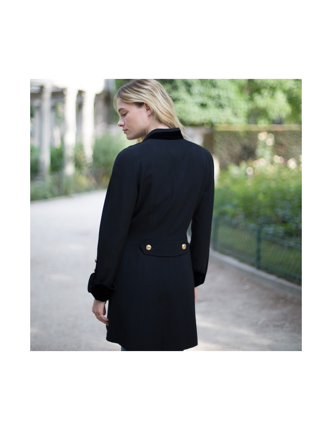 Sublime veste longue cintrée CHANEL Vintage noir en laine et velours, taille 38 FR signé "CHANEL BOUTIQUE". Elle se ferme par 6 boutons dorés siglés "CC" et signés à l"arriere "CHANEL". Les manches sont d'une finesse avec leur revers en velours tout comme le col. Elle a de fines épaulettes. Dans le dos, une petite bande de tissu noir donne un aspect cintré à la veste. Ce modèle est doublé en soie monogramme noire. Quatre boutons à la boutonnière. Deux grandes poches. Elle est en très bon état d'usage.