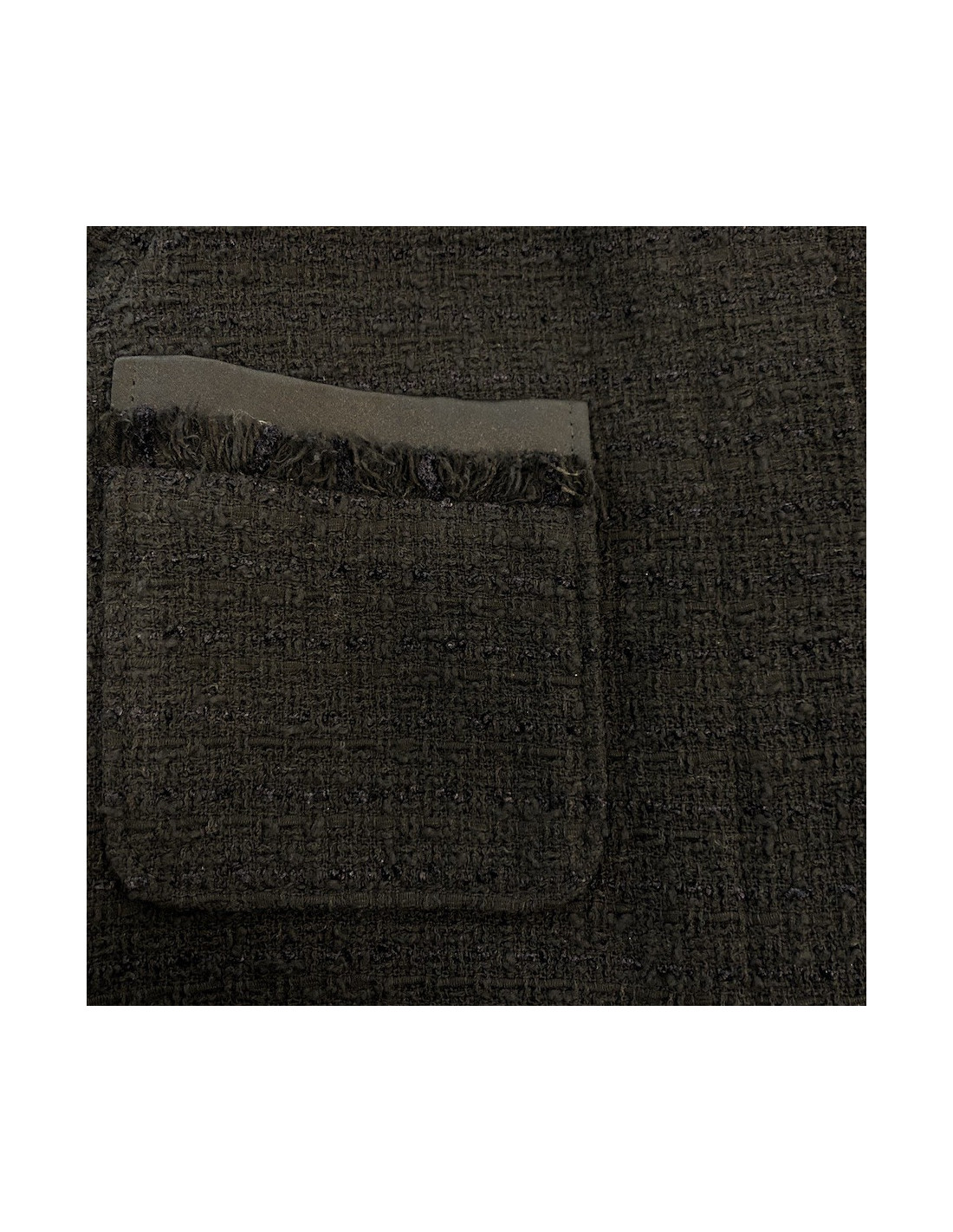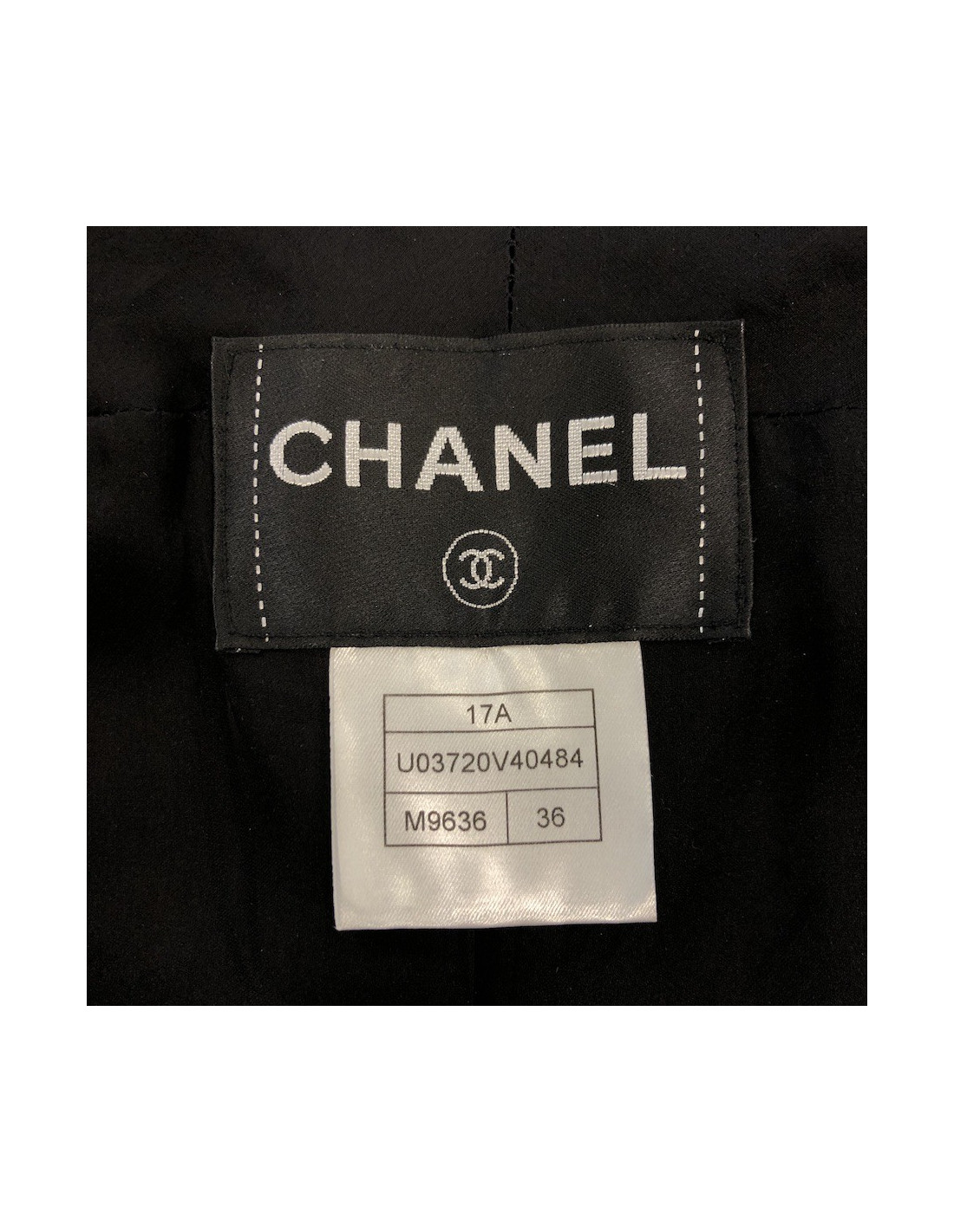 Très élégante veste CHANEL noire en tweed frangée. Les finitions sur le col, les manches et les poches sont en satin de soie. Le bouton camélia en métal argenté et brillant au niveau du col est l'un des emblèmes de la marque. Les autres boutons qui ferment la veste sont cachés par un revers (Voir photos). Forme droite. Elle a 2 poches plates sur la poitrine. Les manches s'évasent sur le poignet. Une veste très pratique qui se porte de jour comme de nuit. La doublure est en soie 100% siglée.