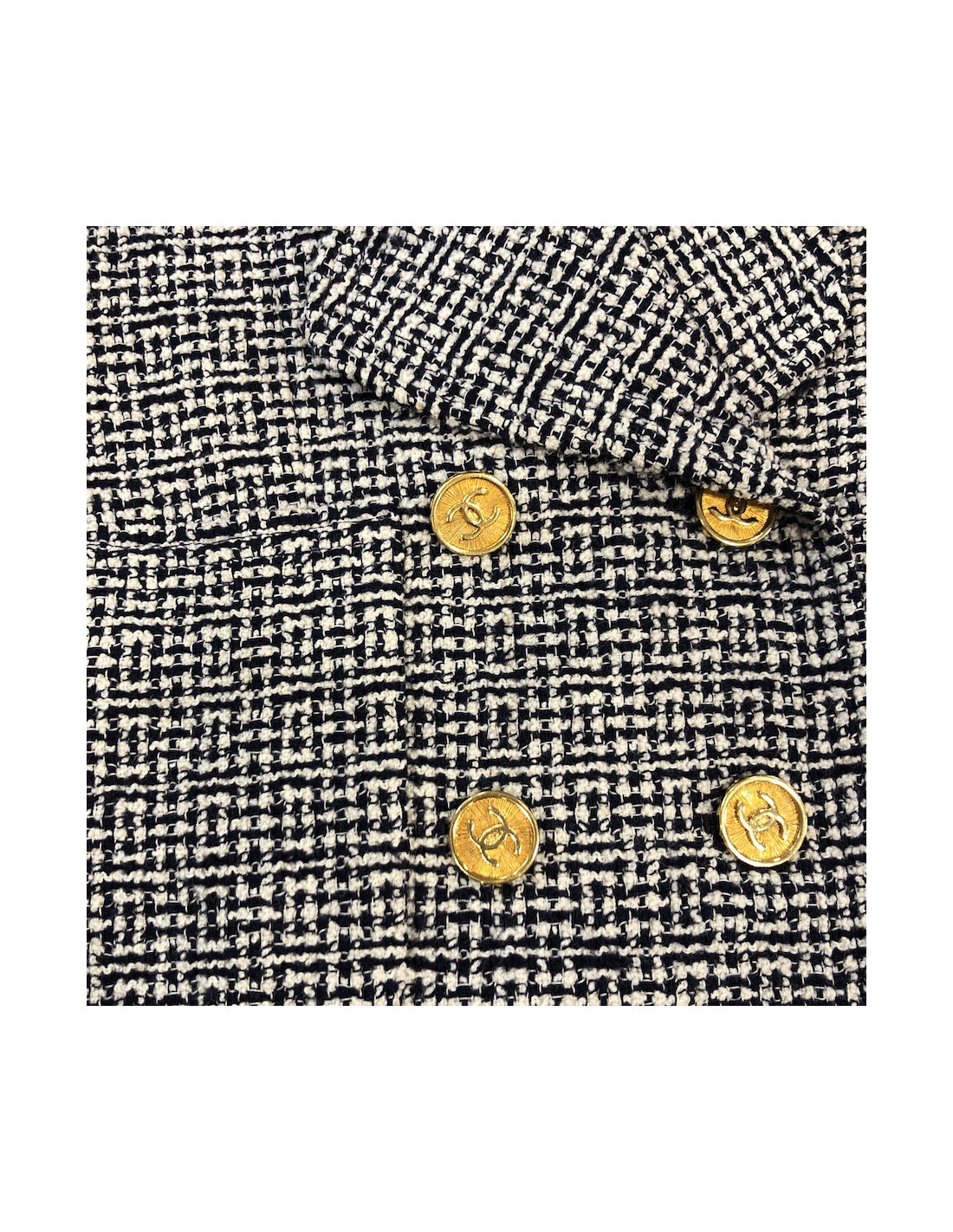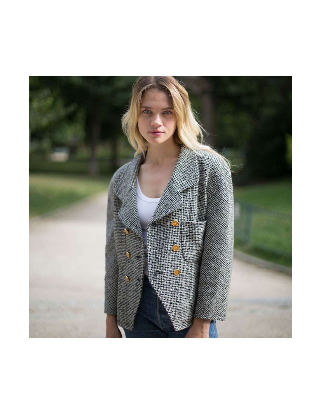 Très Vintage. Veste croisée CHANEL en tweed blanc et bleu T42 (convient plutôt à un 40), manches raglan, cintrée à la taille. Il y a deux poches plates sur la poitrine. Les 6 boutons sont dorés et siglés "CC" avec inscription "CHANEL" en dessous. La doublure est en soie bleue marine imprimée "CC".