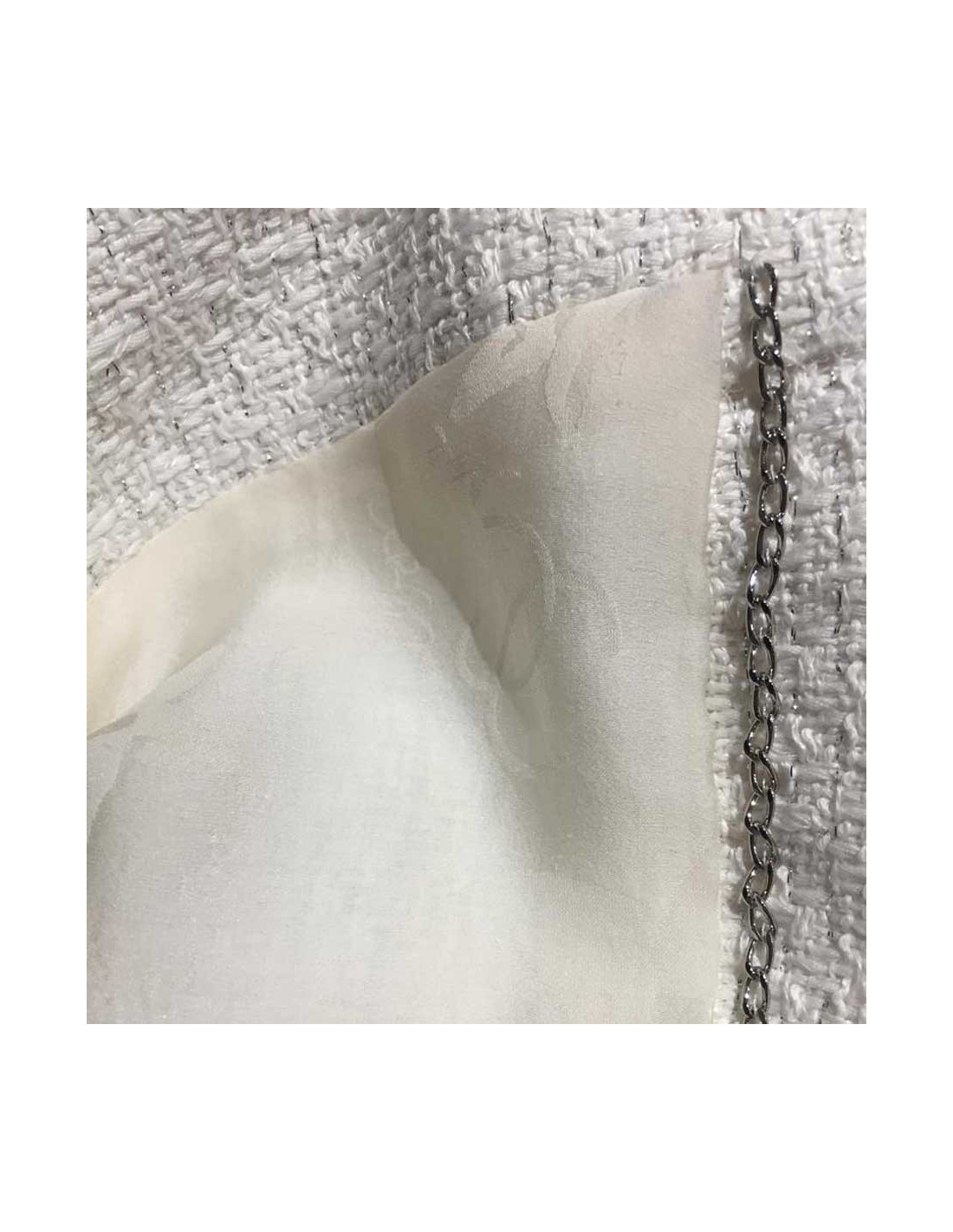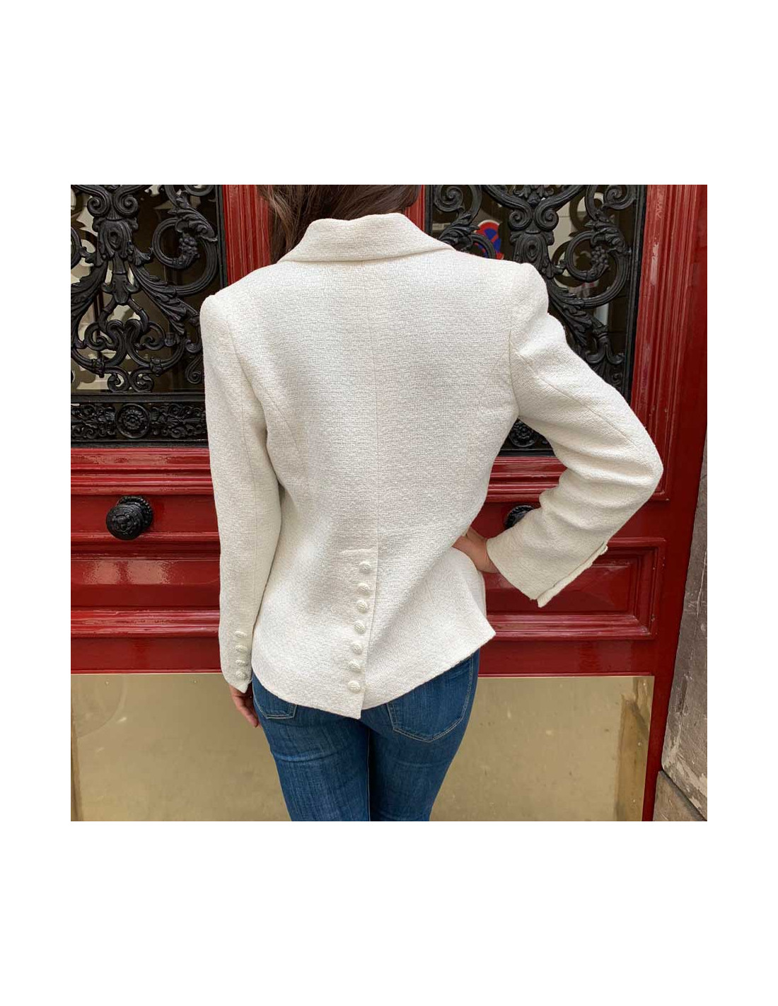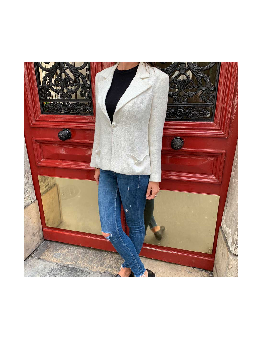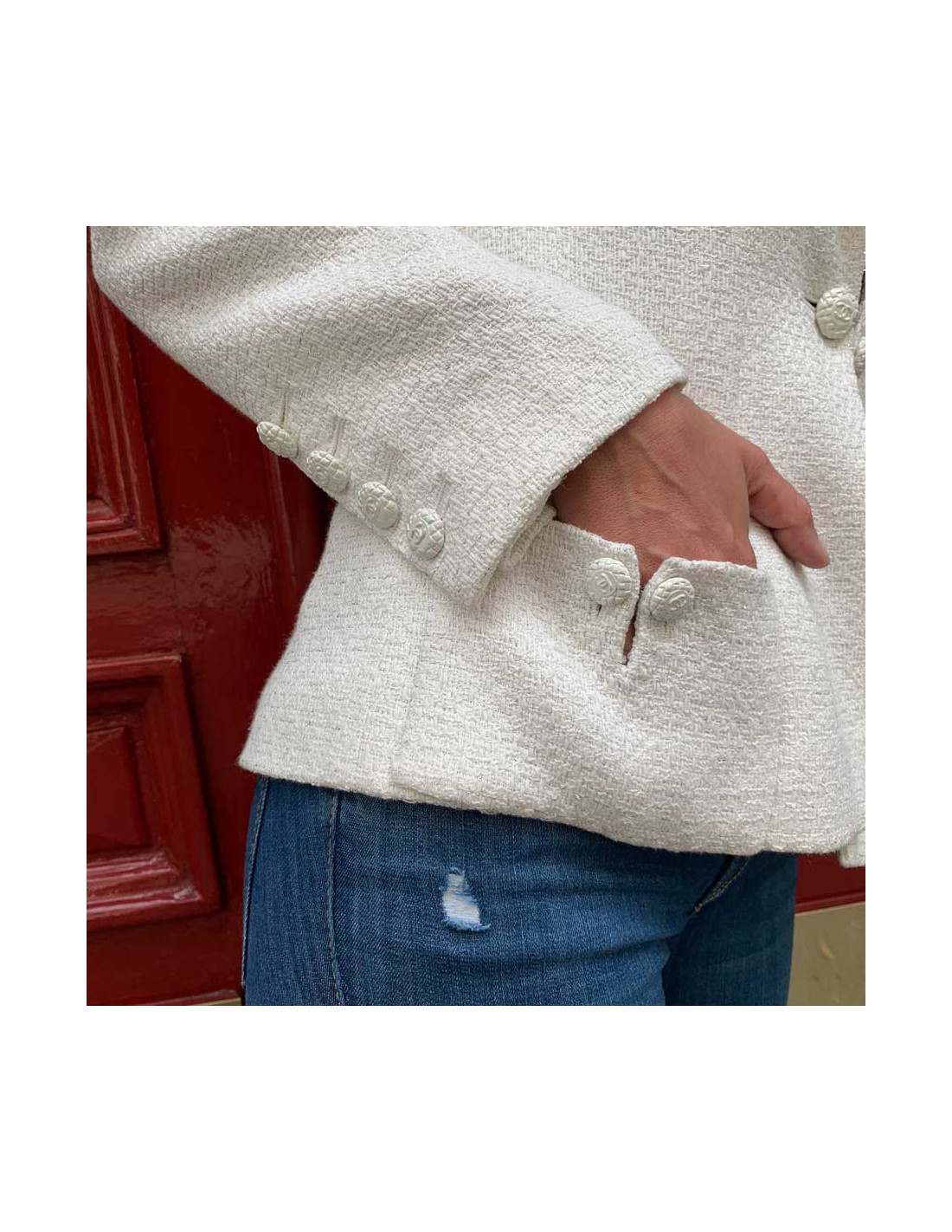 Collection Croisière 2009. Elégante veste Chanel, en coton et divers tissé de fils d'argent, taille 40 se fermant par 2 boutons blancs siglés "CC" reliés à une petite chaînette. Elle a deux poches à l'avant agrémentées de deux boutons. Les manches se terminent par 4 boutonnières. Elle se porte de plusieurs façons soit en tenue chic sur une robe de cocktail, soit décontractée sur un pantalon ou un jean.