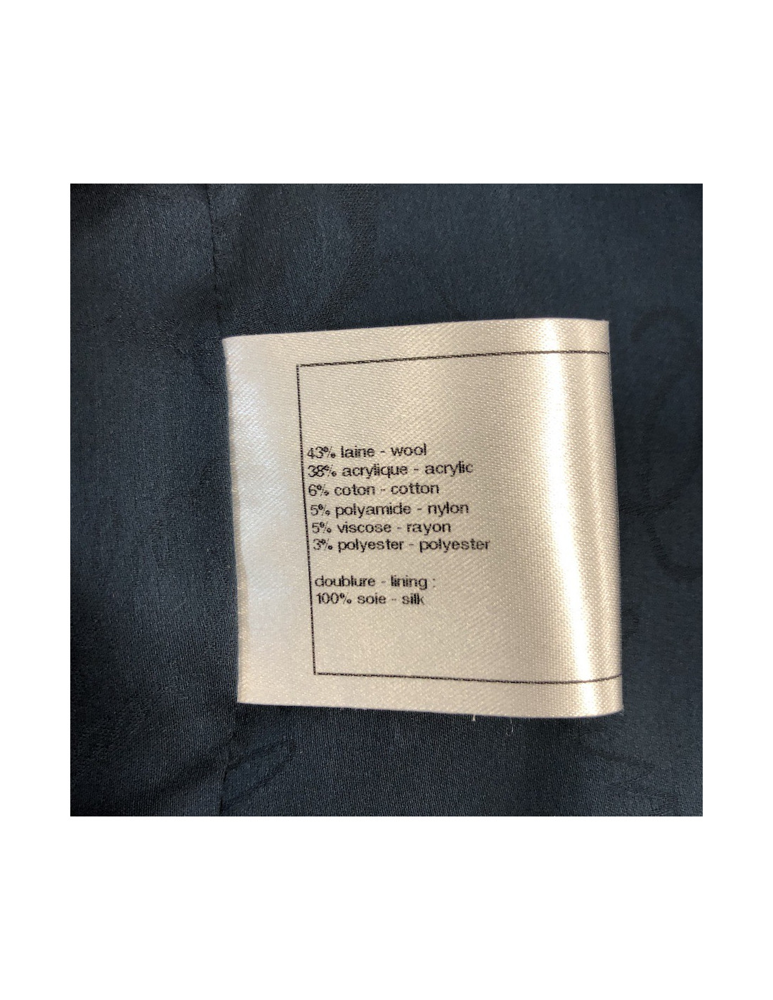 Cette veste CHANEL T36 CHANEL est de fabrication française. Elle est faite d'un mélange de laine, coton, acrylique, viscose, polyamide et polyester. Les dimensions à plat sont : longueur manche 39 cm, largeur épaules 42 cm, longueur totale au col 48 cm, tour de poignet 43 cm.