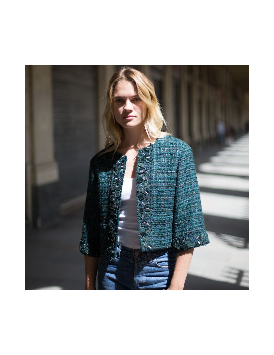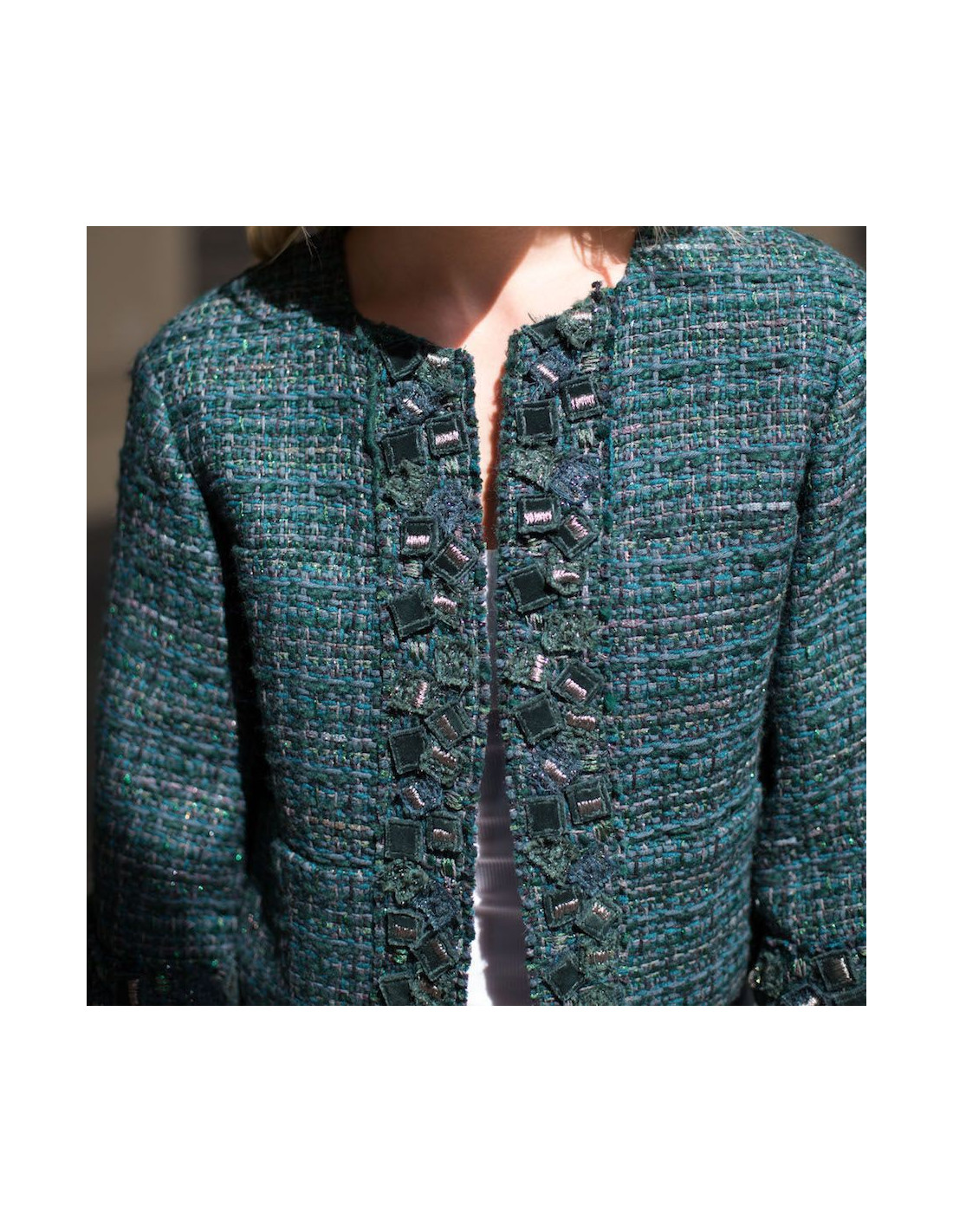 Veste CHANEL T36 tweed vert et bleu , en détails